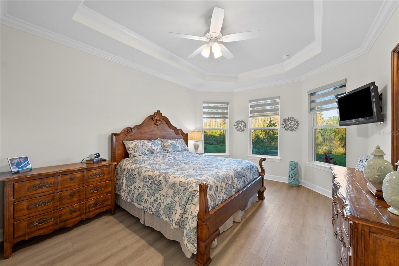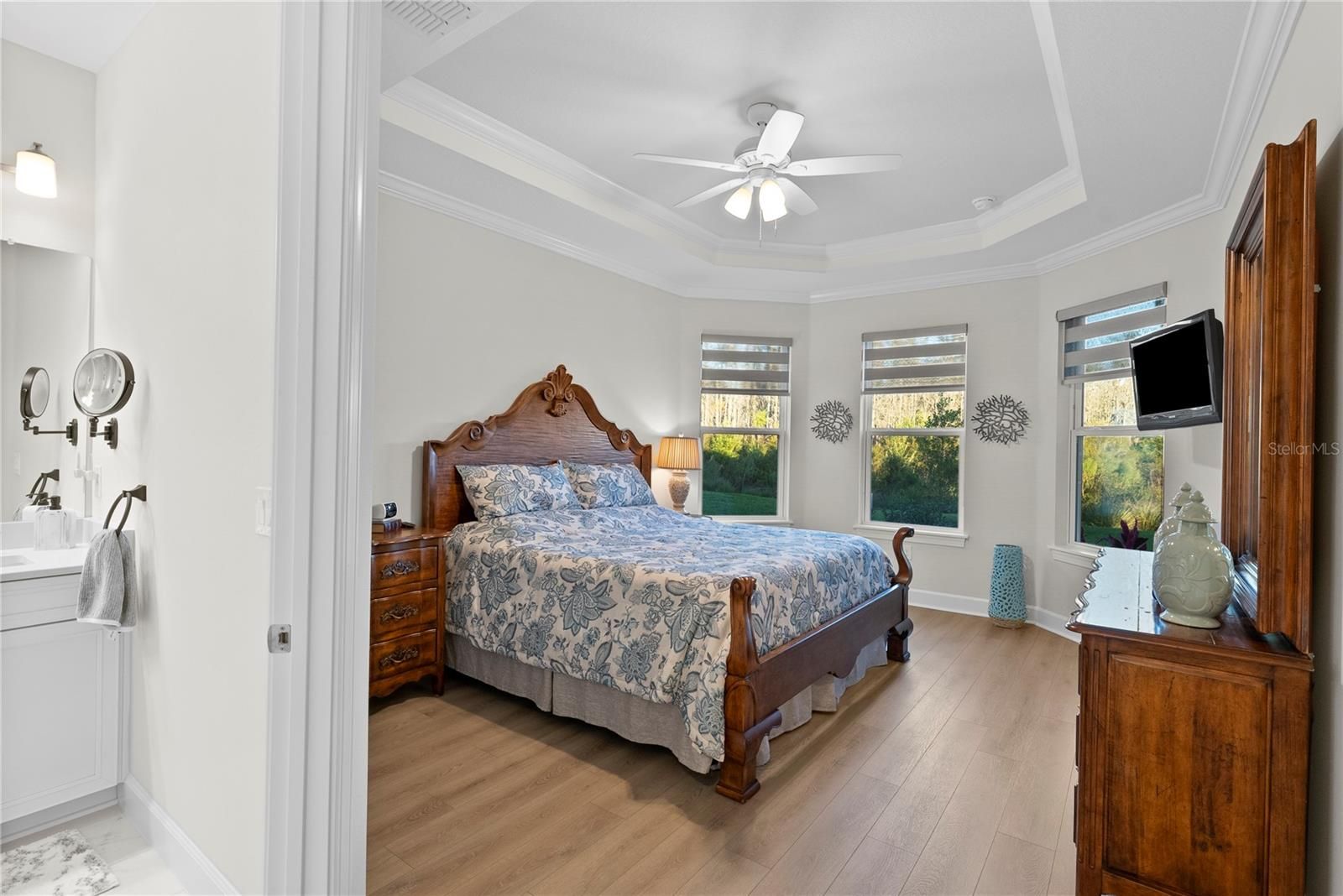 - Ceiling Fan(s), Crown Molding, Eat-in Kitchen, High Ceilings, Kitchen/Family Room Combo, Open Floorplan, Main Level Primary, Solid-Wood Cabinets, Stone Counters, Tray Ceiling(s), Walk-In Closet(s), Window Treatments