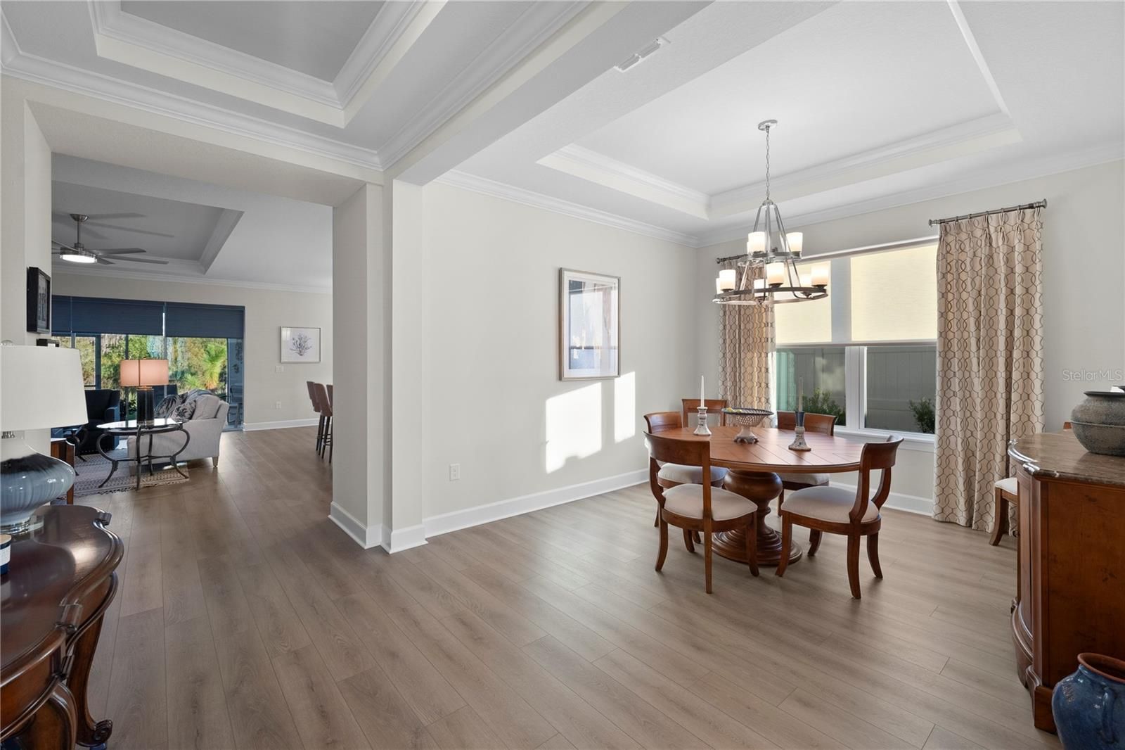 Better than New - Skip the wait! This 2025 built Farnese model is available now and LOADED with UPGRADES! This 2100 SF home features 2 bedrooms, 2.5 baths, den/study, formal dining room and a 4’ extended garage. From the moment you enter through the custom glass door, the home’s thoughtful attention to detail and open floor plan are immediately apparent. No carpet here! Luxury vinyl plank flooring runs throughout the entire home unifying the space and providing a clean, modern look. The Chef’s Kitchen will delight you featuring Cafe’ High Performance Smart Appliances (AirFry in your oven and get HOT water from your refrigerator!), 42” solid wood cushion close painted cabinets with crown molding, and beautiful quartz counters. An enormous island, generous walk-in pantry, and additional counter space make it ideal for entertaining. The oversized owner’s suite features a beautiful bay window perfect for enjoying the peaceful conservation view, an expansive closet and tray ceiling with crown molding. The luxurious primary ensuite offers dual sinks and a large walk-in shower. The family room showcases beautiful tray ceilings with crown molding and abundant natural light. Keeping in step with the Florida Lifestyle, opening the pocketing sliding glass door to the extended screened lanai allows for effortless blending of indoor and outdoor spaces. Perfect for outdoor entertaining, the lanai has been pre-plumbed for an outdoor kitchen. Bedroom two includes a private ensuite bath, perfect for guests. Esplanade at Wiregrass Ranch offers an upscale, resort-style lifestyle centered around a luxurious clubhouse staffed by full-time lifestyle and fitness directors. The Venue features a resort-style pool and spa, private cabanas, dog park, state-of-the-art 24-hour fitness center, billiards/card room, and spa room. Outdoor amenities include a fire-pit, tennis, pickleball, bocce ball, and a spacious gathering and event area. The community also provides worry-free yard maintenance, reclaimed water, and a Spectrum TV and internet package included in the fees. Ideally located just minutes from shopping, I-275, I-75, hospitals, dining, recreation, and entertainment. Tour this exquisite residence and discover the place you’ll be proud to call home.