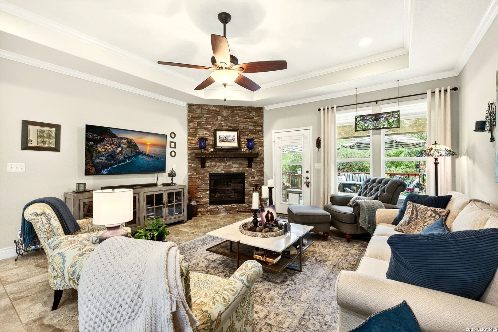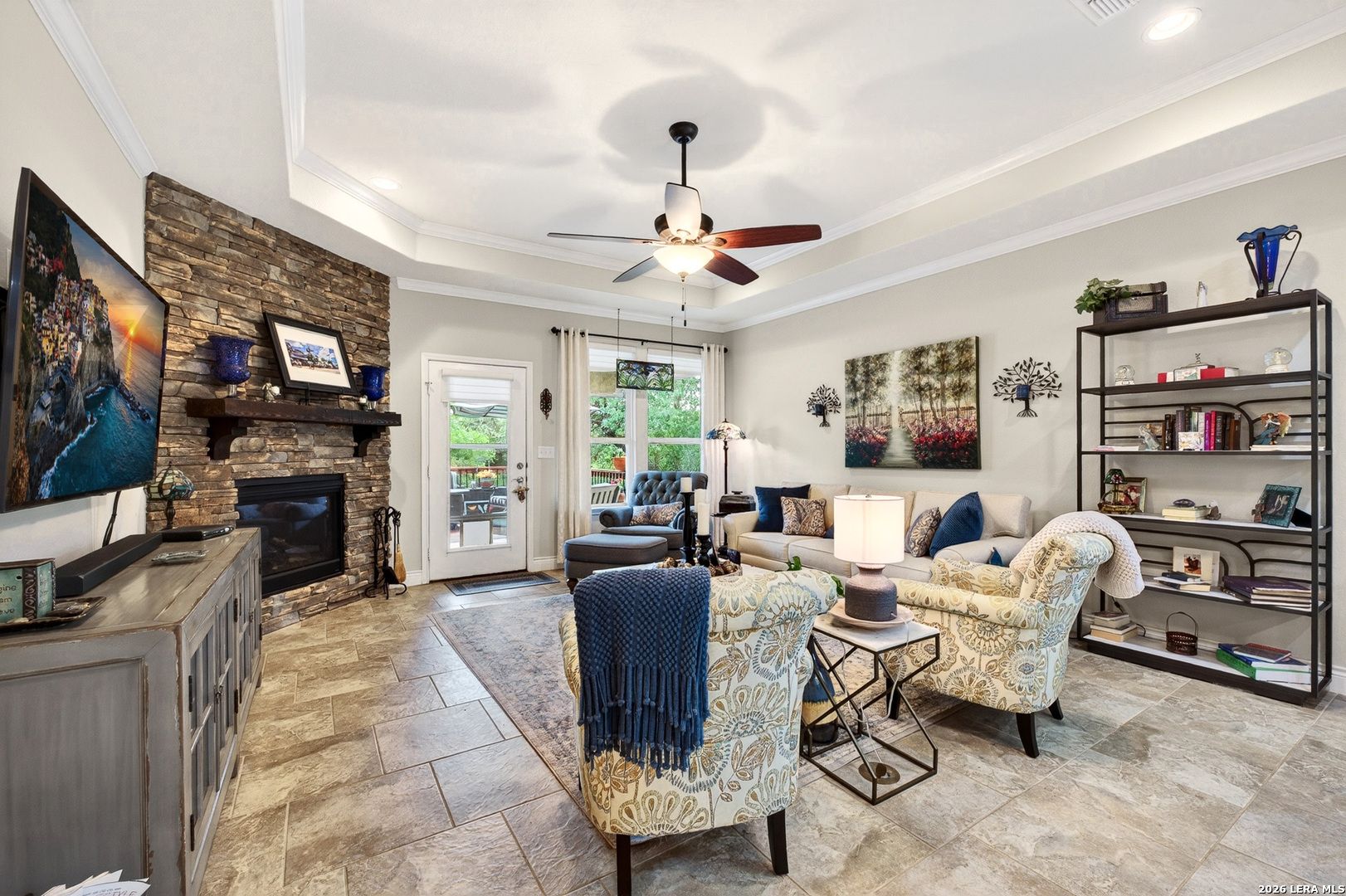 Exceptional upgrades and features are included in this home that sits on a beautiful greenbelt lot that backing onto a walking trail with easy access to the resort. The completely landscaped property features a large deck off the covered patio, as well as a covered front porch. The home boasts a rock fireplace with gas insert, tile floors throughout (except for the bedrooms which have Oak wood flooring), and tile on the front and back porches, as well as tile surrounding the large kitchen island. Stainless steel built-in appliances, refinished cabinets, soft-close drawers, and custom pullouts are featured in the kitchen. Gorgeous custom built-ins in the study include 4 file cabinets and adjustable shelves, and soft close built-in doors. Even the guest bath has been updated. The interior has been recently painted. No maintenance Leaf Guard gutters, and the property has iron fencing with three gates. Enjoy the amazing amenities in this resort-style community with amenities galore.