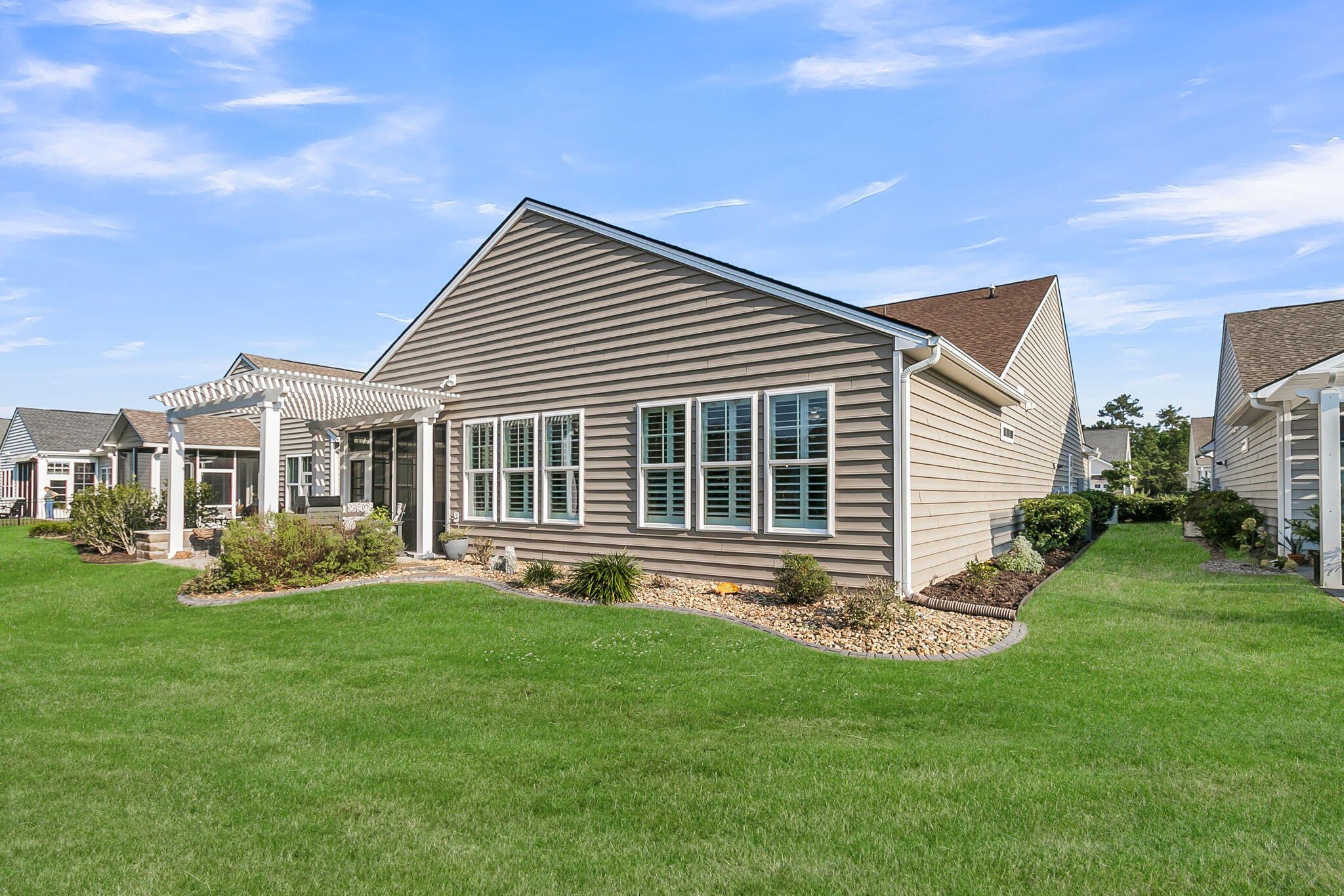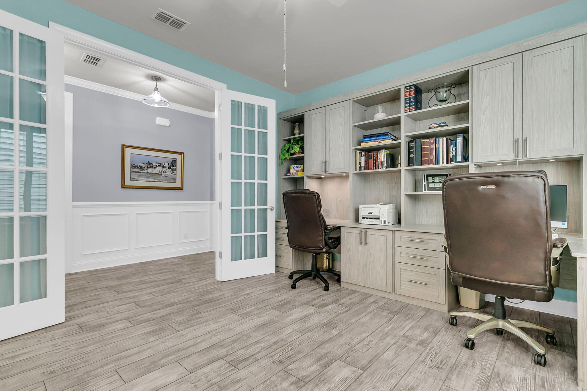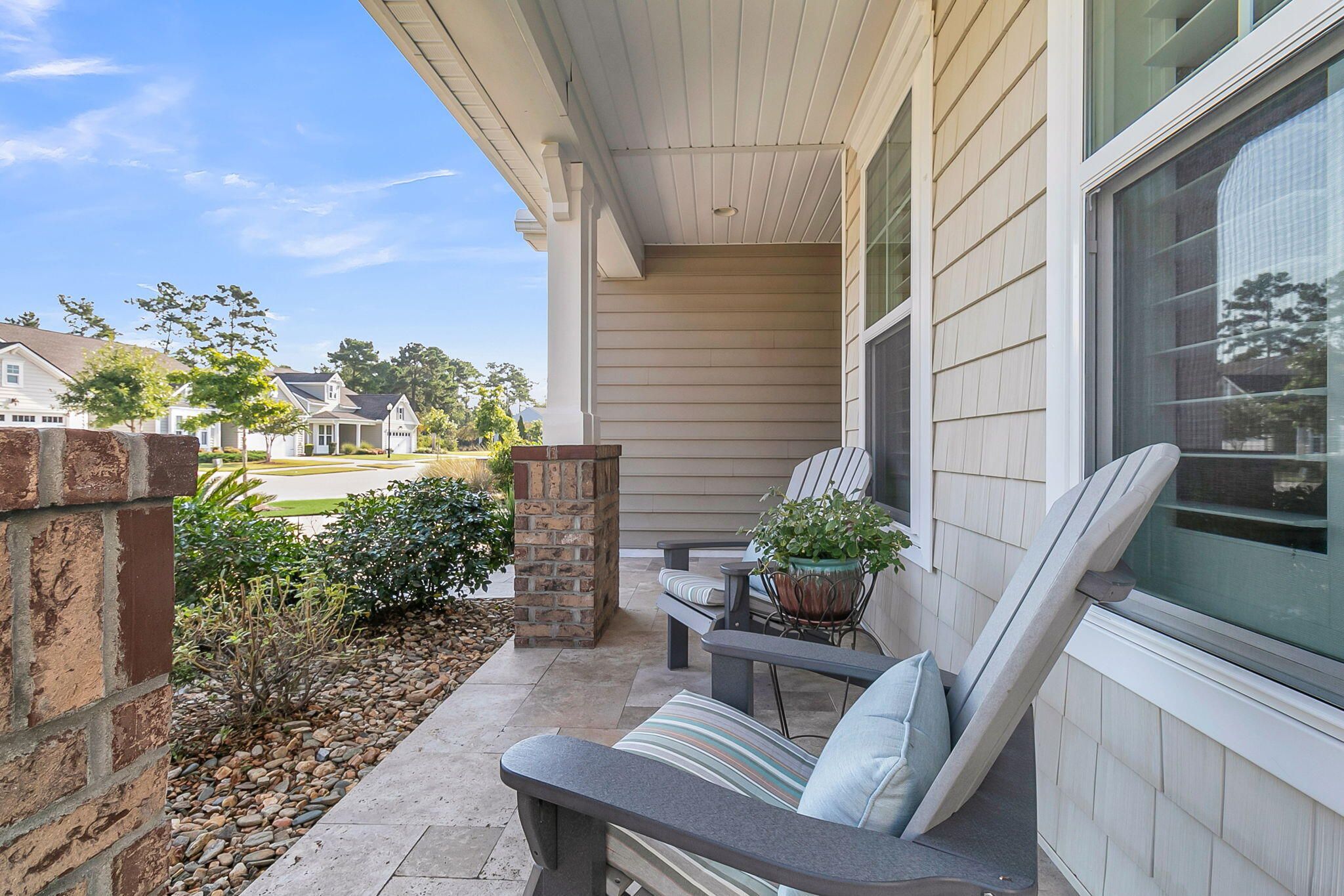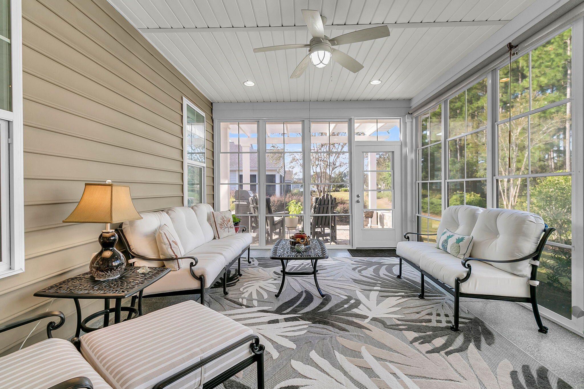 Pristinely-kept, and featuring numerous home updates, this 2 bedroom, 2 bath Killarney home with French door office is truly MOVE-IN READY! Stone pavers on each side of the driveway, a travertine walkway and extended front porch, and enhanced landscaping make an inviting curb appeal. Step inside to find laminate wood floors in all living areas and the owner's suite. Plantation shutters throughout and wood trim details enhance the interior space. Step into the heart of the home to find the luxury island kitchen with soft closing white cabinetry with single tray pull out storage, granite countertops, gourmet kitchen appliances with a 4-burner gas cooktop, double ovens, and included French door refrigerator, subway tile backsplash, pendant lighting, and custom storage in the corner pantry.The living area offers a custom built-in wall unit with electric fireplace, the perfect focal point for an inviting space. A large dining area sits adjacent and is accentuated by wainscotting and crown molding. Step outside to the incredible outdoor living spaces - an oversized screened-in porch with epoxy finished floor and retractable vinyl windows, making this a three-season room that you can enjoy nearly all year long! Additionally, a paver patio with built-in sitting walls and pergola above is the perfect place to enjoy the mild Carolina weather. Back inside, the Owner's Suite includes laminate floors and an ensuite bath with tile floors, a double sink granite vanity, walk-in tile shower with built-in bench and frameless shower door, walk-in closet with custom closet storage system, and linen closet with custom shelving. The guest bedroom sits on the opposite side of the home, and includes new carpet and a full guest bath with walk-in shower and a custom quartz vanity. A French door office with custom built-in desk with two work stations and ample room for extra furnishings is the perfect flex room! A mud room with built-in storage and laundry room with built-in cabinets, folding counter, and laundry sink finish the interior space. Don't miss the garage! A full third bay extends off the two-car garage and also has a double door storage closet and epoxy finish - this is the perfect space for storage, a golf cart, or workshop! This home also has a whole house generator! Be part of the beautiful lakeside community of Four Seasons - a private 300-acre lake for kayaking, canoeing, fishing, and more. Enjoy a full calendar of events and premier amenities at the 24,000 square foot Lake House - with indoor and outdoor pools, a full fitness center, billiard and card rooms, ball room, demonstration kitchen, plus pickle ball, tennis, and bocce courts and a launch area for your boats! Live your BEST LIFE in this beautiful community and home!