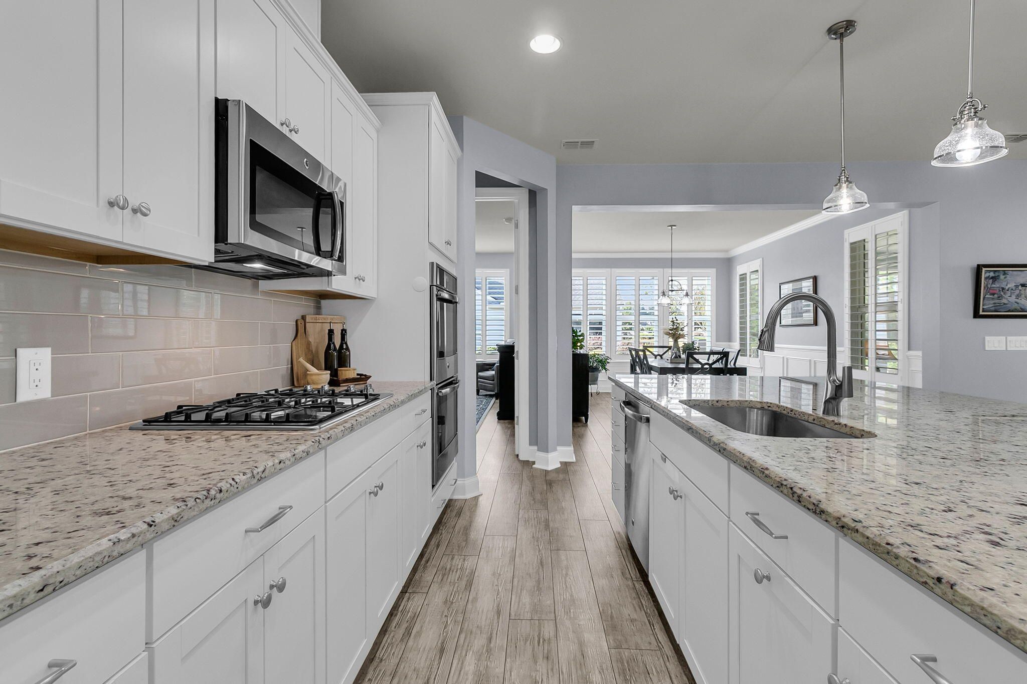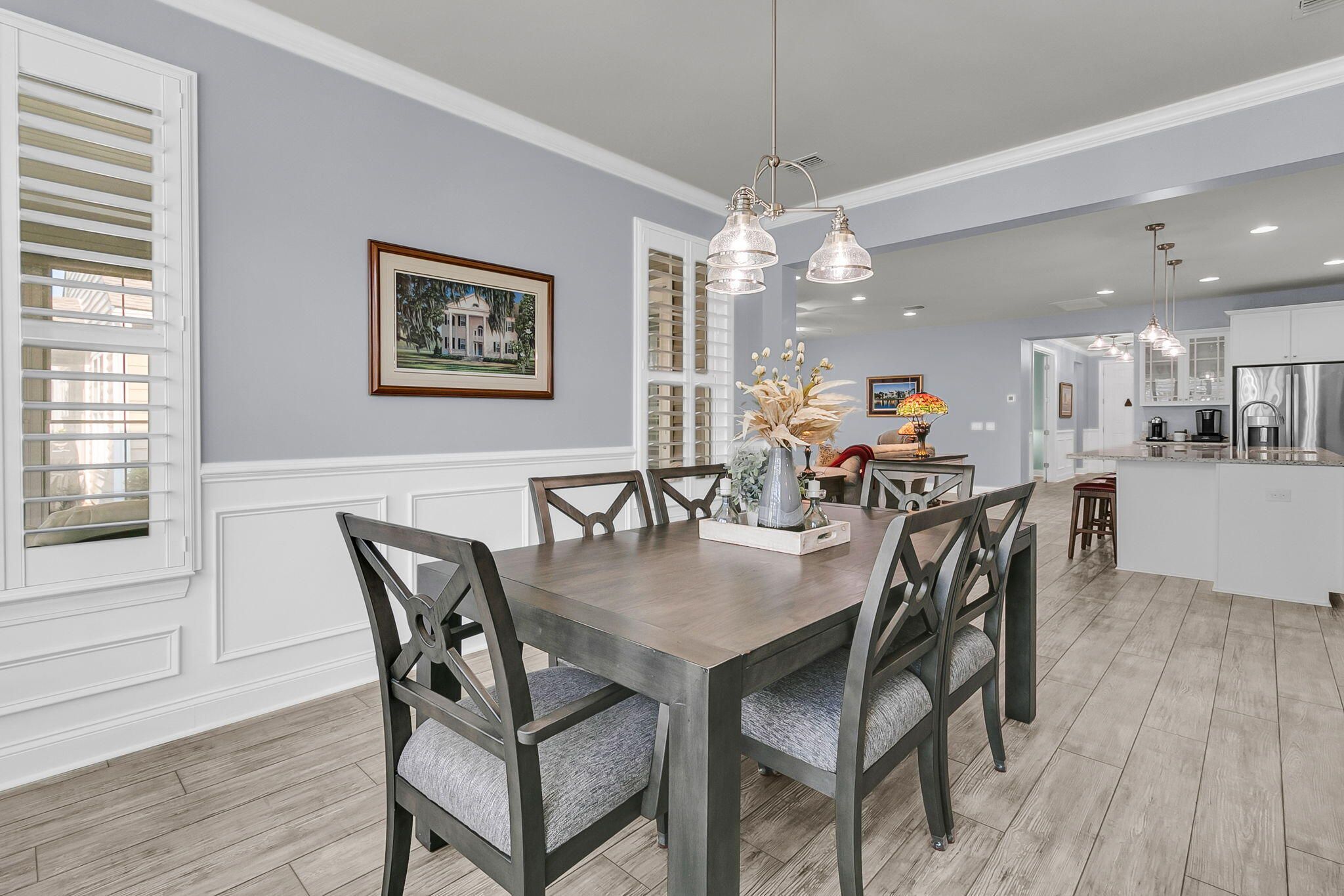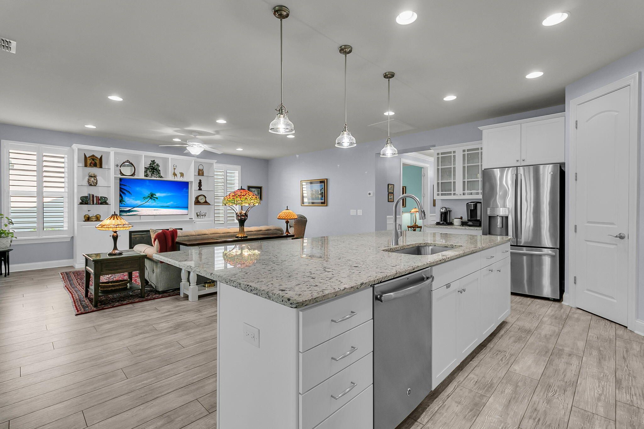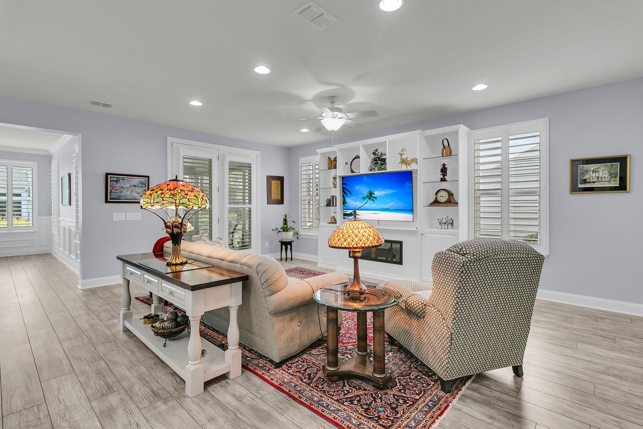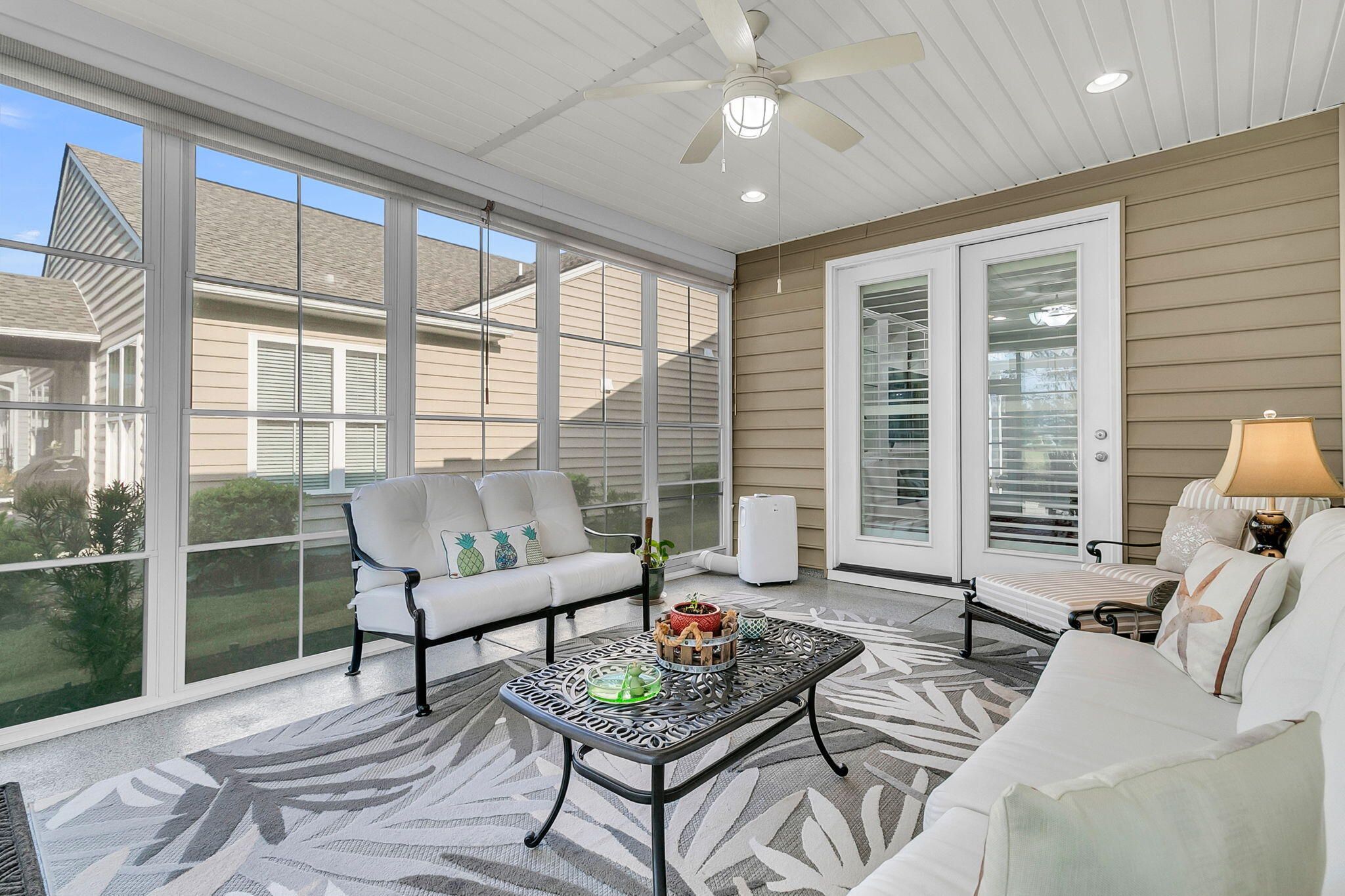 Pristinely-kept, and featuring numerous home updates, this 2 bedroom, 2 bath Killarney home with French door office is truly MOVE-IN READY! Stone pavers on each side of the driveway, a travertine walkway and extended front porch, and enhanced landscaping make an inviting curb appeal. Step inside to find laminate wood floors in all living areas and the owner's suite. Plantation shutters throughout and wood trim details enhance the interior space. Step into the heart of the home to find the luxury island kitchen with soft closing white cabinetry with single tray pull out storage, granite countertops, gourmet kitchen appliances with a 4-burner gas cooktop, double ovens, and included French door refrigerator, subway tile backsplash, pendant lighting, and custom storage in the corner pantry.The living area offers a custom built-in wall unit with electric fireplace, the perfect focal point for an inviting space. A large dining area sits adjacent and is accentuated by wainscotting and crown molding. Step outside to the incredible outdoor living spaces - an oversized screened-in porch with epoxy finished floor and retractable vinyl windows, making this a three-season room that you can enjoy nearly all year long! Additionally, a paver patio with built-in sitting walls and pergola above is the perfect place to enjoy the mild Carolina weather. Back inside, the Owner's Suite includes laminate floors and an ensuite bath with tile floors, a double sink granite vanity, walk-in tile shower with built-in bench and frameless shower door, walk-in closet with custom closet storage system, and linen closet with custom shelving. The guest bedroom sits on the opposite side of the home, and includes new carpet and a full guest bath with walk-in shower and a custom quartz vanity. A French door office with custom built-in desk with two work stations and ample room for extra furnishings is the perfect flex room! A mud room with built-in storage and laundry room with built-in cabinets, folding counter, and laundry sink finish the interior space. Don't miss the garage! A full third bay extends off the two-car garage and also has a double door storage closet and epoxy finish - this is the perfect space for storage, a golf cart, or workshop! This home also has a whole house generator! Be part of the beautiful lakeside community of Four Seasons - a private 300-acre lake for kayaking, canoeing, fishing, and more. Enjoy a full calendar of events and premier amenities at the 24,000 square foot Lake House - with indoor and outdoor pools, a full fitness center, billiard and card rooms, ball room, demonstration kitchen, plus pickle ball, tennis, and bocce courts and a launch area for your boats! Live your BEST LIFE in this beautiful community and home!
