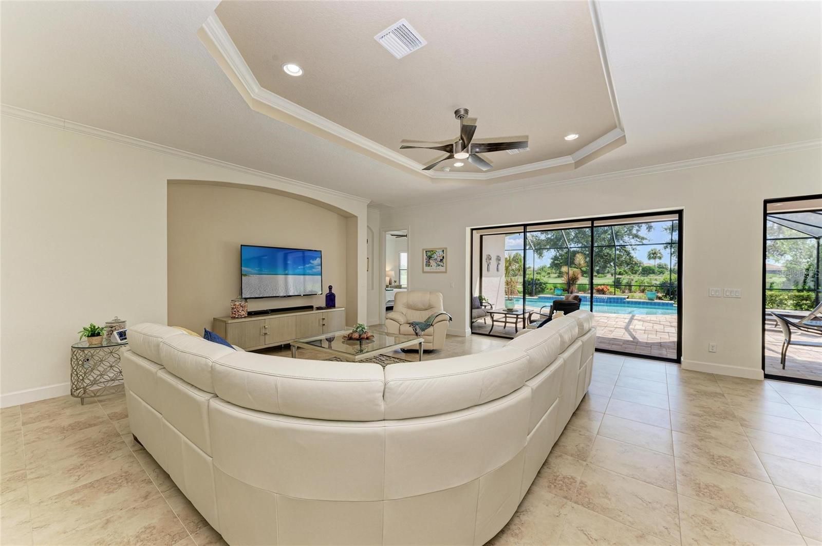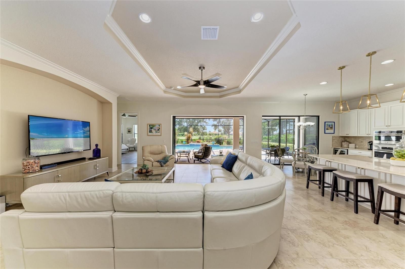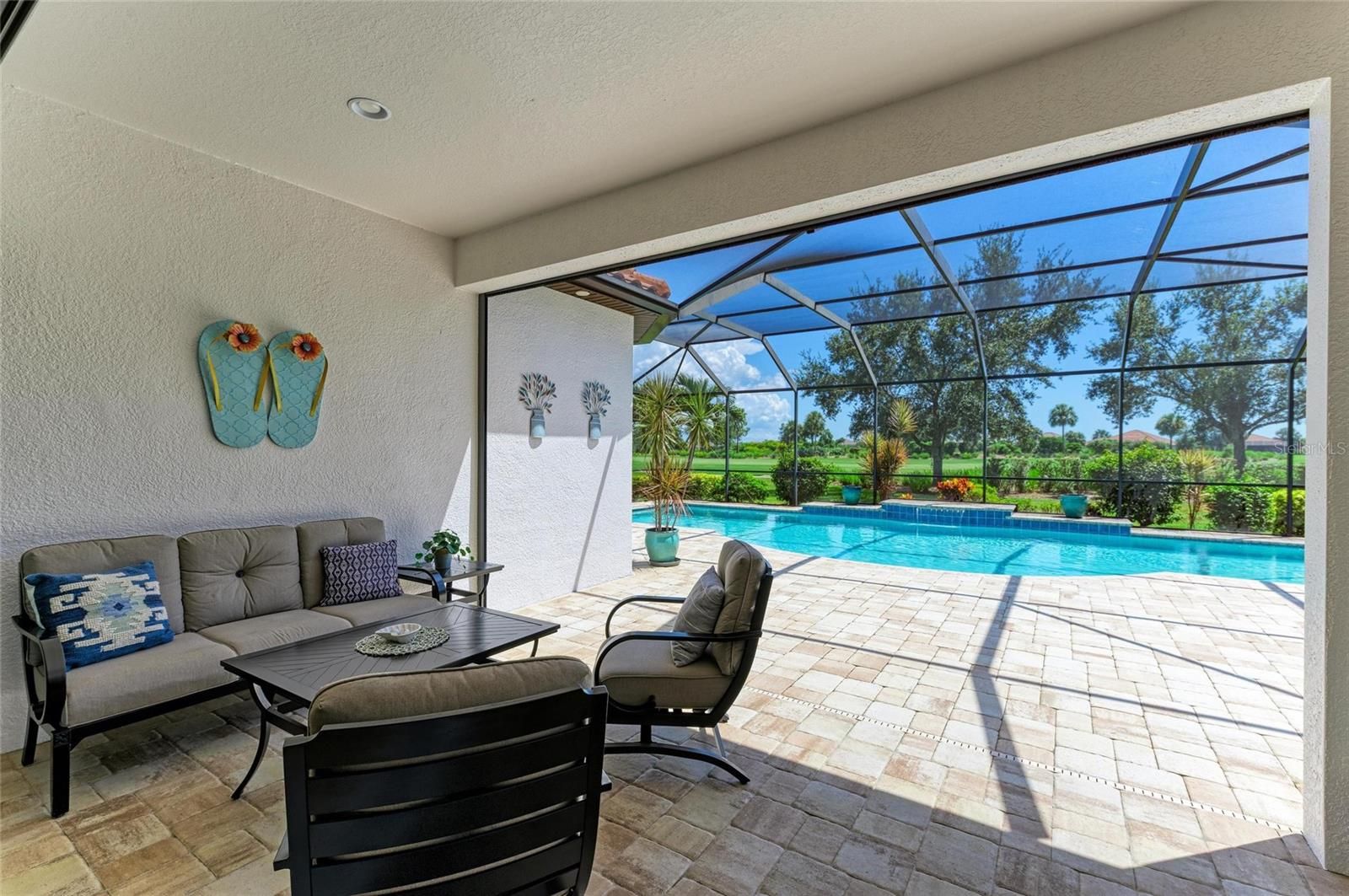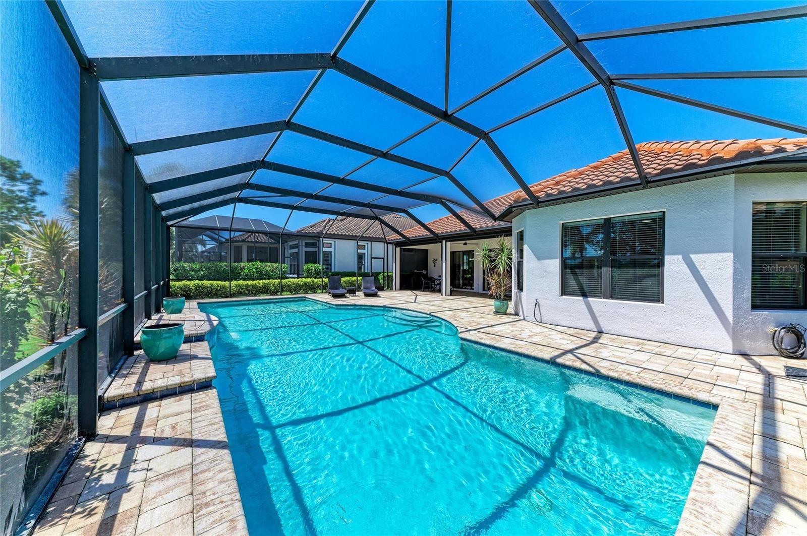 SELLER OFFERING $10K CREDIT FOR CLOSING COSTS WITH AN ACCEPTABLE CONTRACT! SELLER IS READY TO MOVE! HUGE PRICE IMPROVEMENT! Don’t miss this incredible opportunity to own the LOWEST priced Pallazio pool home ($280k in savings) on a GOLF-DEEDED LOT with direct views of golf course near hole #1 in Esplanade Golf & Country at Lakewood Ranch! True Play-In, Play-Out Convenience, here you can take advantage of the recent updates including new exterior and interior paint, upgraded landscaping and new LED lighting. This highly sought-after floor plan offers breathtaking southern exposure overlooking lush fairways. Enter through the grand double doors into a foyer with adorned columns, a tray ceiling, and soaring ceilings that flow into the expansive open-concept great room. Crown molding and disappearing pocket sliders fill the space with natural light and open to the lanai, showcasing an impressive 40-foot pool perfect for swimming laps or relaxing. The gourmet kitchen features Cambria quartz countertops, a crema marfil marble backsplash, stainless steel appliances including a natural gas cooktop and built-in oven, a wine refrigerator, and an oversized island with chic pendant lighting, ample storage, and generous workspace. The extended kitchen offers a separate breakfast area opens to the lanai, enhancing the home’s indoor-outdoor flow. The extended primary suite is privately located and offers a spa-like en-suite bath with dual sinks, frameless glass shower, soaking tub, private water closet, and a large walk-in closet. Two guest bedrooms provide comfort and privacy—one with an en-suite bath featuring a frameless glass shower and quartz countertops, and the other with access to a full bath with quartz countertops and a shower/tub combination. A generously sized study/den with double doors offers flexible use and can easily serve as a 4th bedroom. The extended screened lanai includes a large, covered area, expansive paver deck, and sweeping golf course views, with motorized hurricane Kevlar screens for added convenience. The professionally extended driveway accommodates 3-cars, and the epoxy-floored garage includes overhead storage racks. Additional features include a newer washer and dryer in the spacious laundry room with a utility sink, under-cabinet storage, and drop zone. Esplanade’s amenities include an 18-hole championship golf course, tennis and pickleball courts, two fitness centers, two resort-style pools, a full-service spa and salon, on-site dining at the Bahama Bar and Barrel House Bistro, bocce ball, a bark park, and an active social calendar. Lawn maintenance is included in the HOA fees. Located in Lakewood Ranch, near University Town Center, Sarasota Polo Club, farmers’ markets, trails, parks, award-winning beaches, and SRQ and TPA airports, this home offers the best of Florida living. Furniture is available by separate agreement. Take advantage of this rare chance to secure a beautiful home at an unbeatable value!
