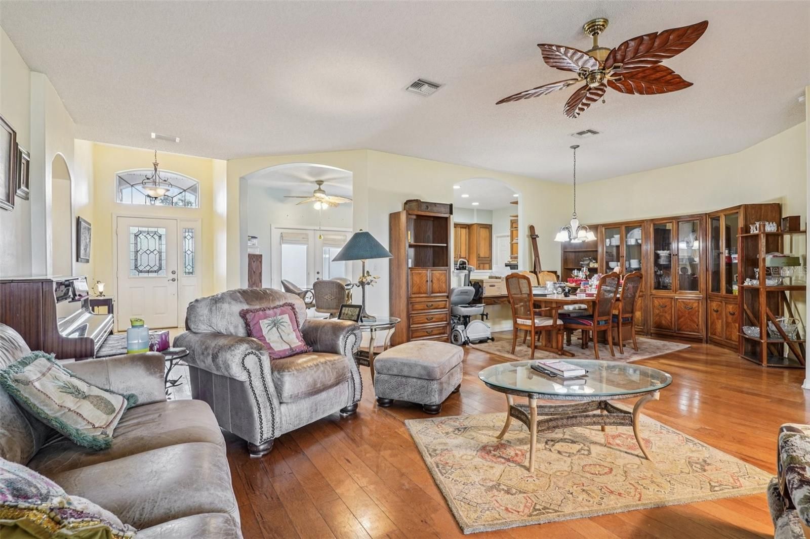 Experience the ultimate 55+ lifestyle in this impeccably maintained, one-owner retreat nestled within the gated, golf-cart-friendly community of Royal Highlands. This 3-bedroom home offers a bright and airy open floorplan, highlighted by hardwood floors that seamlessly connect the spacious living and dining areas. At the heart of the home, the eat-in kitchen features stainless steel appliances, a large island, tile backsplash, and direct access to a private, screened-in front courtyard. The primary suite boasts a generous walk-in closet and an ensuite with a dual vanity, garden soaking tub, and separate shower, all while opening onto the rear patio. Two additional guest bedrooms provide the perfect layout for a home office or overnight visitors, complemented by an updated hall bath with a stylish vessel sink. Outdoor living is effortless here, with a rear covered and screened patio plus an additional screened gazebo—perfect for entertaining against the backdrop of a generous lot with no rear neighbors and peaceful river views. For total peace of mind, the home is equipped with impact-rated windows and doors. Beyond your doorstep Royal Highlands is defined by its lush nature trails and abundant wildlife and four lakes. Enjoy world-class amenities including an 18-hole golf course, indoor and outdoor pool, pickleball, fitness center and a bustling Great Hall with over 75 clubs. With low POA fees covering cable, internet, and all recreational facilities, and a prime location near shopping and dining, this home offers the perfect balance of natural beauty and a vibrant social calendar. Schedule your tour today!