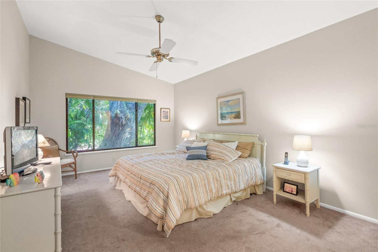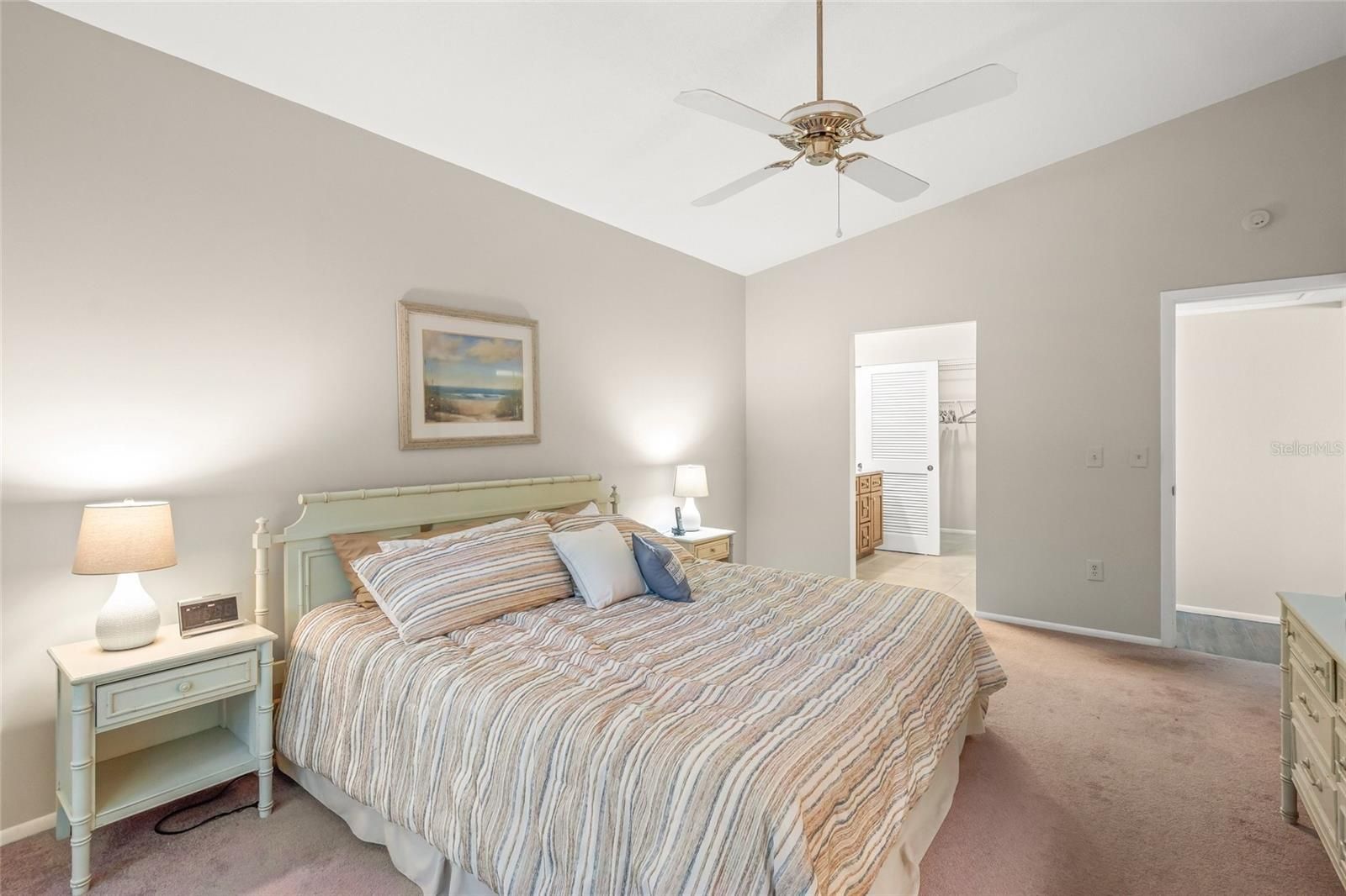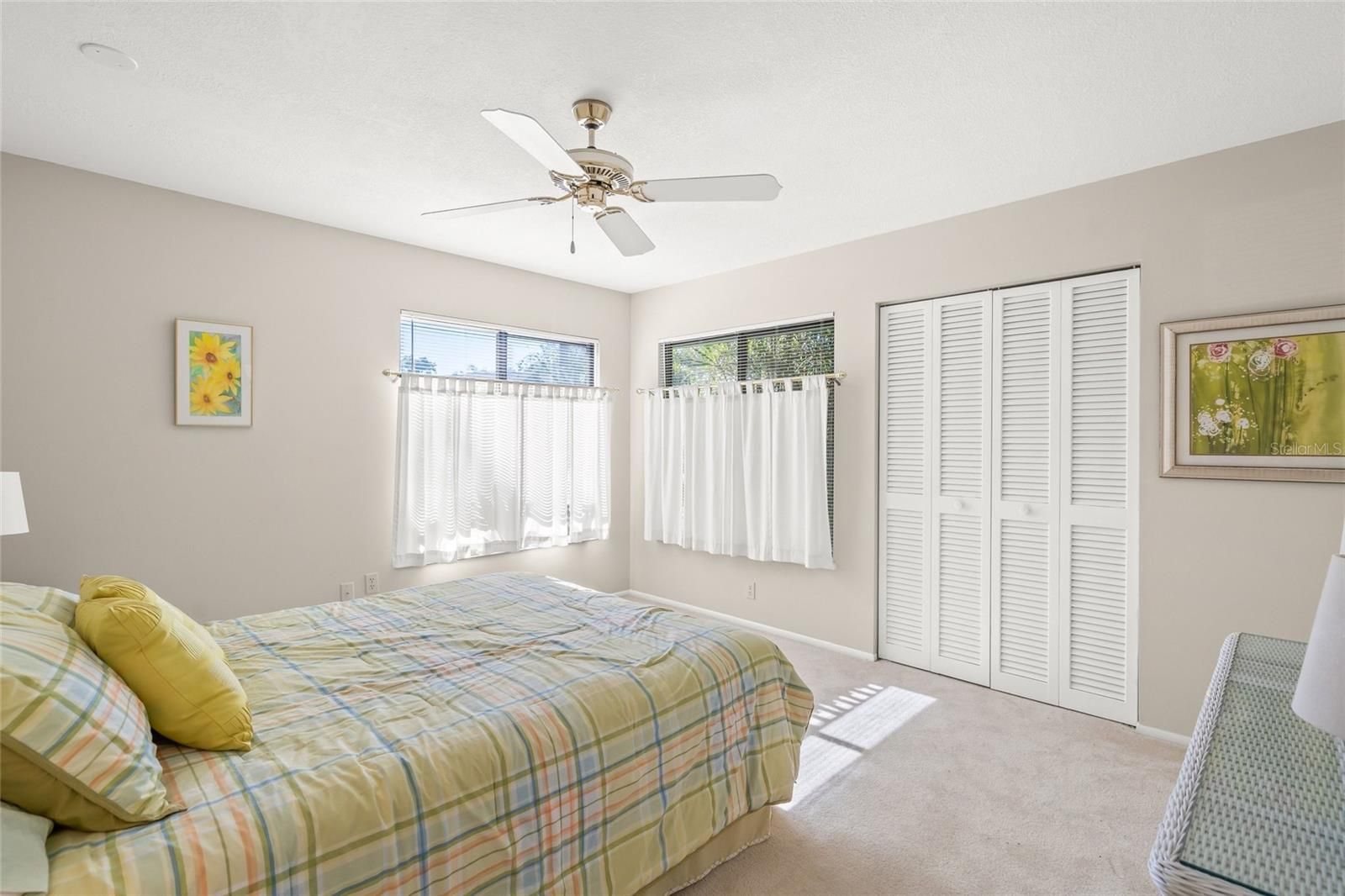 - Ceiling Fan(s), Eat-in Kitchen, Main Level Primary, Split Bedrooms, Thermostat, Vaulted Ceiling(s), Walk-In Closet(s), Window Treatments