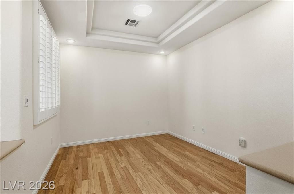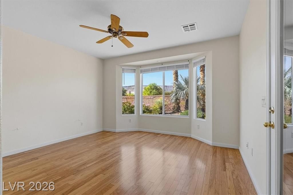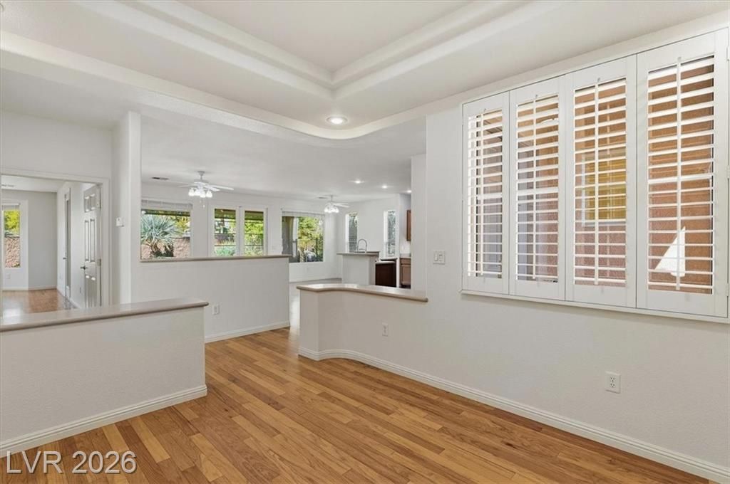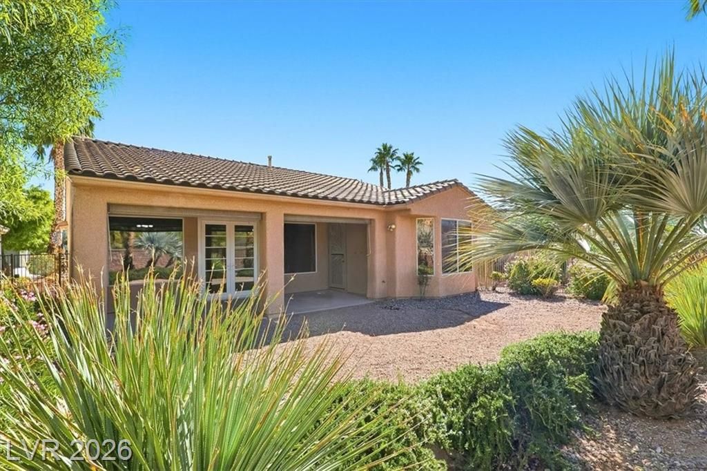 Enjoy sweeping mountain views, beautiful sunsets from the private backyard. This elegant single-story home in the exclusive 55+ guard-gated community of Siena. This Model 5130 offers 2 bedrooms, 2 bathrooms, and a den. Centrally located with easy access to shopping at Downtown Summerlin, freeways, and the world-class entertainment of the Las Vegas Strip. Elegant curb appeal welcomes you through a private courtyard into an open floor plan featuring custom wood flooring, plantation shutters, and ceiling fans throughout. The gourmet kitchen opens to spacious living areas, perfect for entertaining. The primary suite includes a spa like bath. Enjoy sweeping mountain views, beautiful sunsets from the private backyard. Siena offers resort-style amenities including a clubhouse, fitness center, pools, tennis, pickleball, and championship golf — blending luxury, comfort, and convenience.