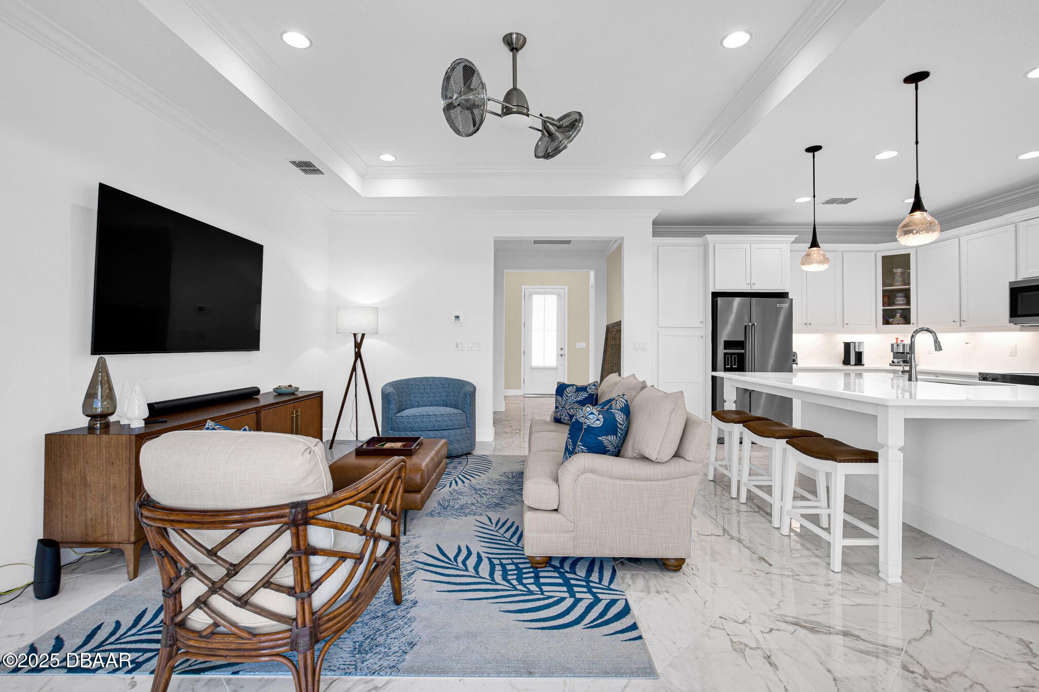PRICE REDUCTION!!! This light, bright and beautiful 3 bedroom 2 bath COCONUT model home is situated on a preserve lot in popular phase 6 of Latitude Margaritaville, Florida's premier 55 and better resort community. Elegance meets you at the door with gorgeous white marble look ceramic tile floors throughout. The kitchen is a chef's dream with top of the line Kitchenaid appliances, white cabinets with soft close/dove tail drawers and doors, 42'' uppers and white quartz countertops and backsplash. 4 panel sliding glass doors help to bring the outdoors in and lead to a beautiful extended screened lanai. Master suite is oversized with a ship lap feature wall and a huge floor to ceiling tile shower in the master bath. Large walk-in closet with custom shelving. VA FINANCING WELCOME. Enjoy the Beach Club with pool on the ocean in Ormond Beach, on-site resort style pool, restaurant/bar, fitness center, theater, pickleball, tennis courts, daily music, & weekend concerts!