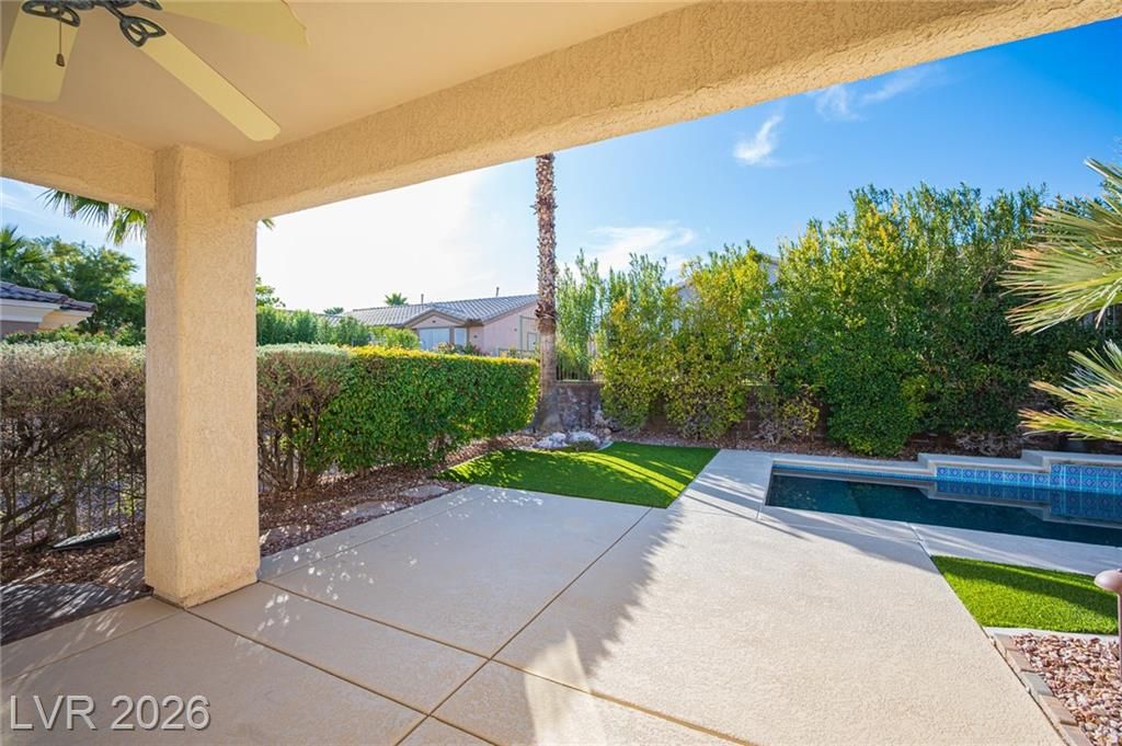 Located within the guard-gated Siena community in the heart of Summerlin, this home offers a resort-style lifestyle defined by privacy, security, and active living. Siena is known for its championship golf course, clubhouse, fitness center, pools, tennis and pickleball courts, and beautifully maintained streetscapes—creating a true community feel. Set on an oversized lot with HOA-maintained easement space along the south side, the home enjoys rare separation and openness. The private backyard is designed for everyday enjoyment, featuring a pool and spa with solar heat and mood lighting, plus stamped concrete patios front and back. Inside, plantation shutters provide filtered natural light throughout the open living space, complemented by a separate flex room. The kitchen is thoughtfully updated with top-tier appliances complemented by a whole-home water softener and filtration system. Enjoy secure, low-maintenance living just minutes from Downtown Summerlin, dining, and recreation.