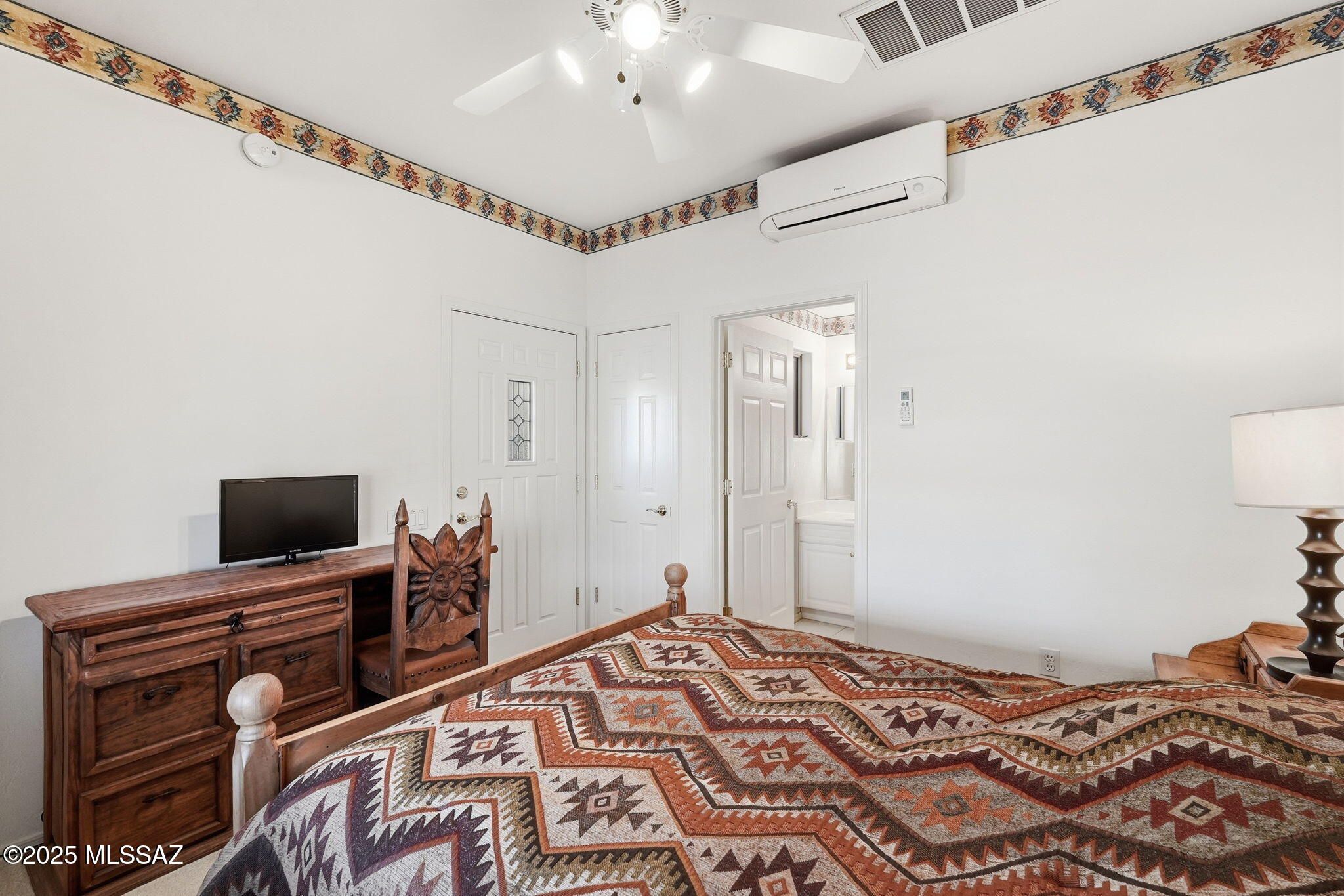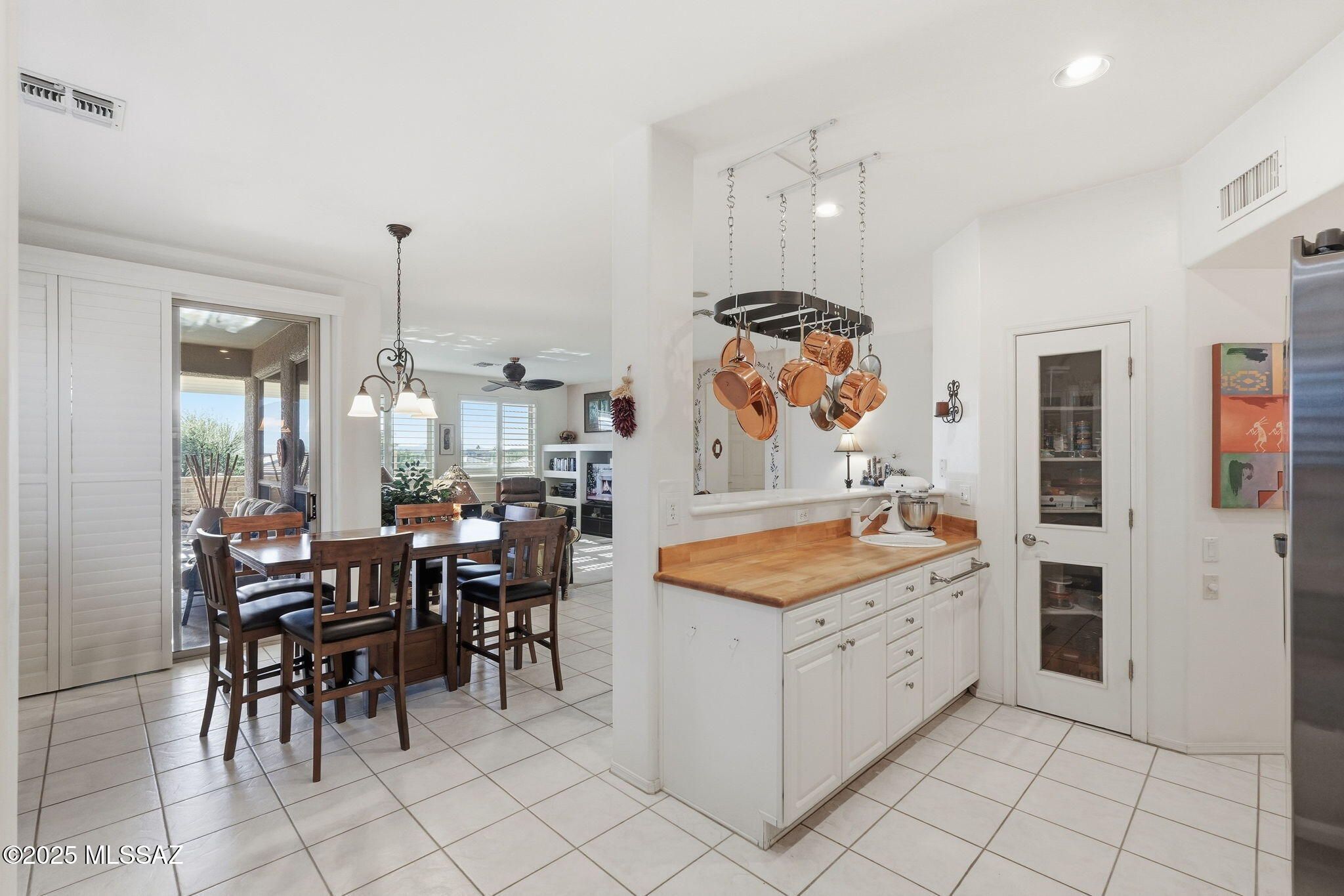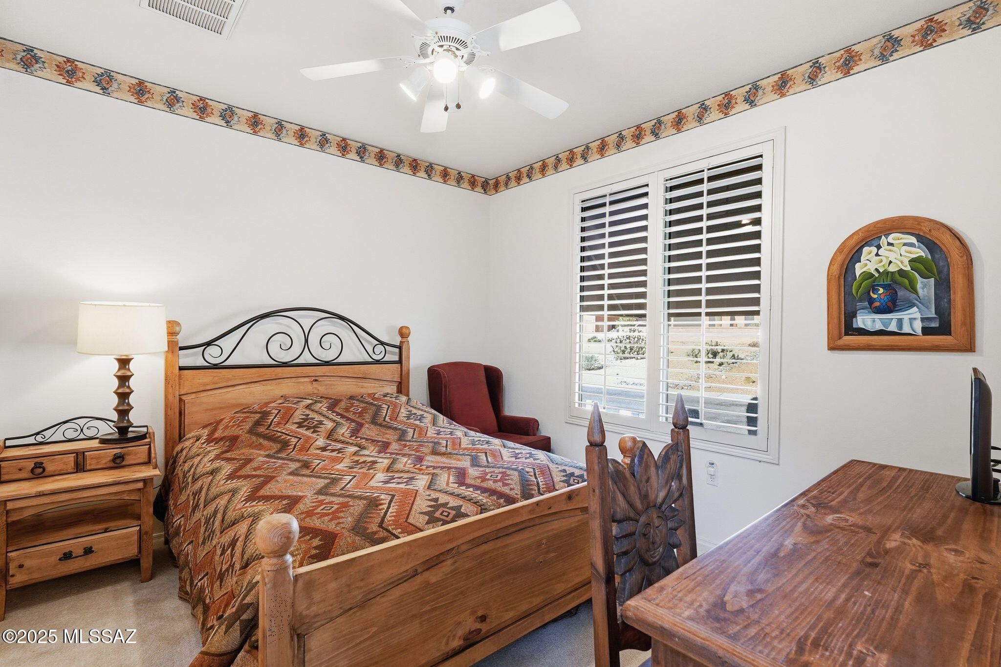 Located in desirable San Ignacio Vistas II, this beautifully maintained 1,893 SqFt home offers 2BR, 2BA, a den, and a private casita. Offered completely furnished, it's ideal for full-time living or a seasonal retreat .The kitchen features Corian and butcher block countertops, farmhouse sink, walk-in pantry, ceiling-mounted pot rack, separate sink setups for versatile cooking needs, and new stainless steel appliances (2023). A split floorplan provides privacy, with a spacious primary suite showcasing stunning mountain views and a walk-in shower with grab bars. The den/office includes built-in desk and shelving, while plantation shutters enhance much of the home. The casita offers a full bath, private courtyard entrance, and mini-split heat pump (2018).