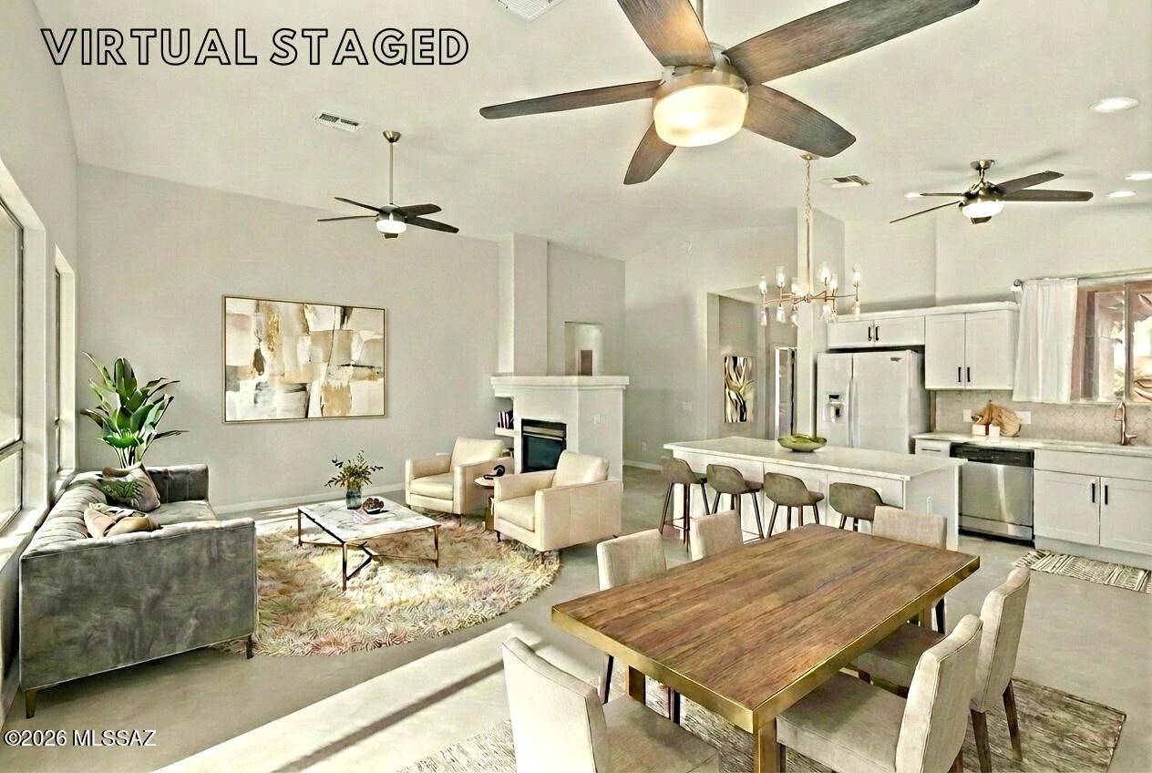 Newly UPDATED & PRICED TO SELL! Gorgeous 2-bedroom, 2-bath 1556 sq ft home located in San Ignacio Vistas 55+ Community with a sun screened ARIZONA ROOM & breathtaking MOUNTAIN VIEWS! The kitchen shines with new modern granite countertops, new soft touch cabinetry, a feature backsplash, high cathedral ceilings, recessed lighting, new ceiling fans, fresh interior paint, and a sleek polished concrete overlay. Other features include a gas fireplace, wide hallways, large walk-in closet, a reverse osmosis system and a bonus office space to provide flexibility & fruit trees. Enjoy the nearby recreation amenities: golf courses, pickleball courts, walking trails, and Green Valley Recreation community activities and facilities, you'll have endless opportunities to embrace in the lifestyle that