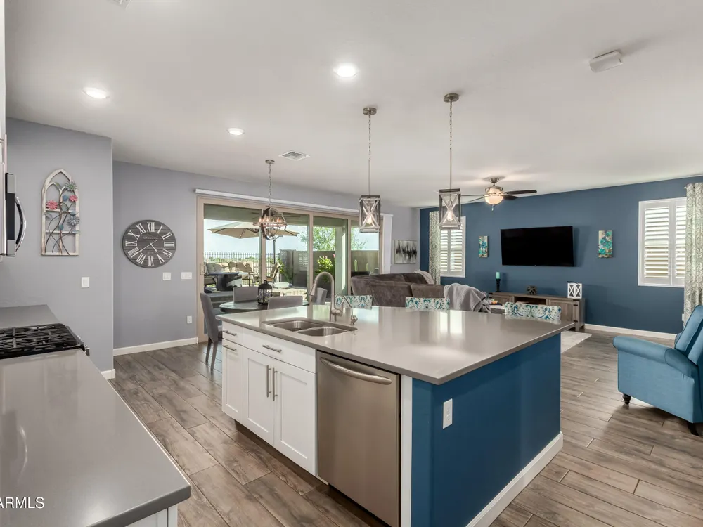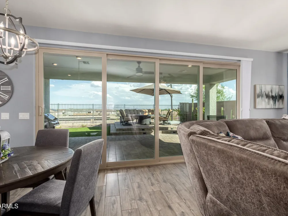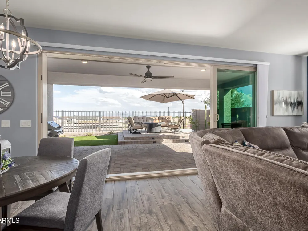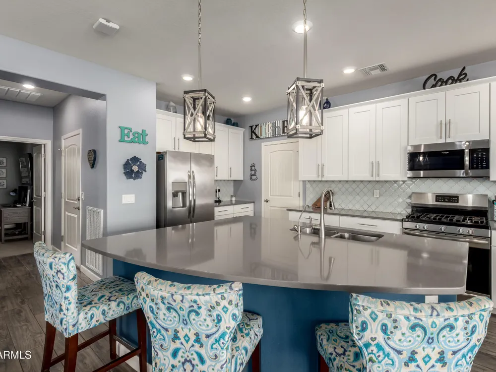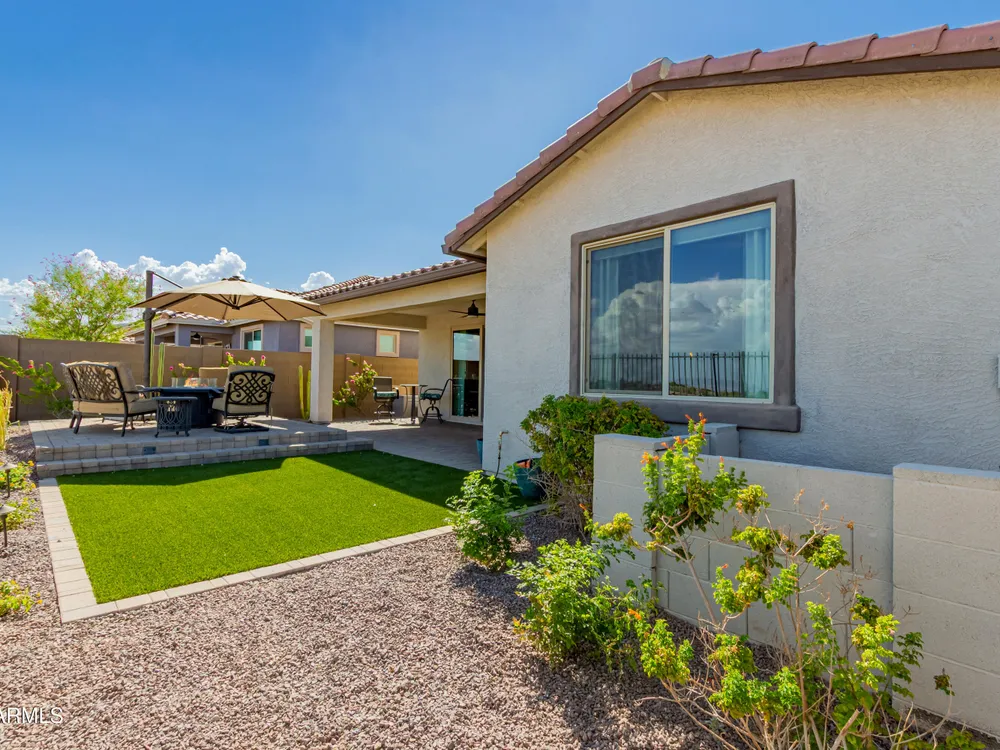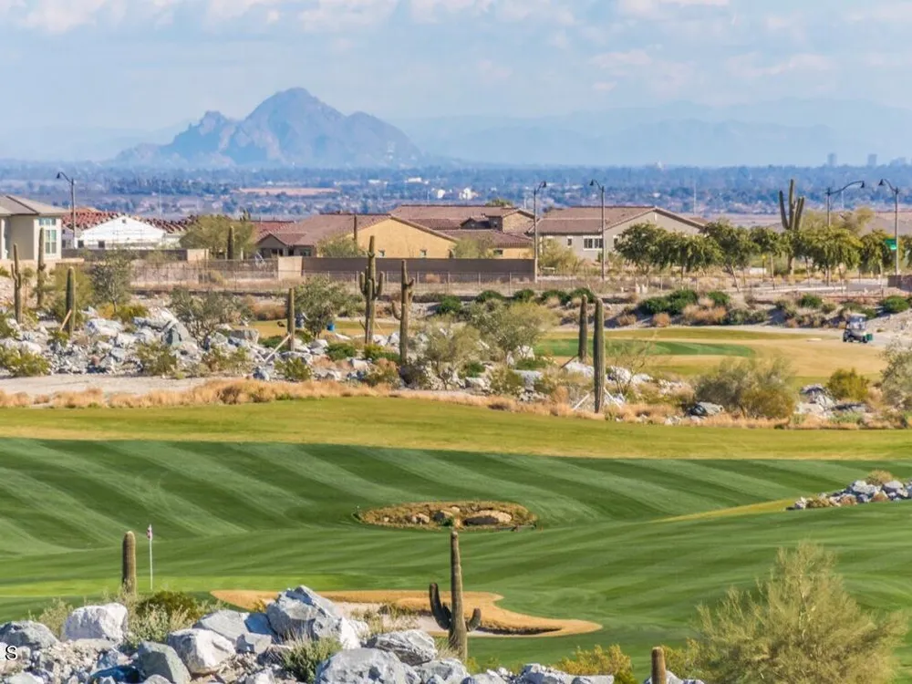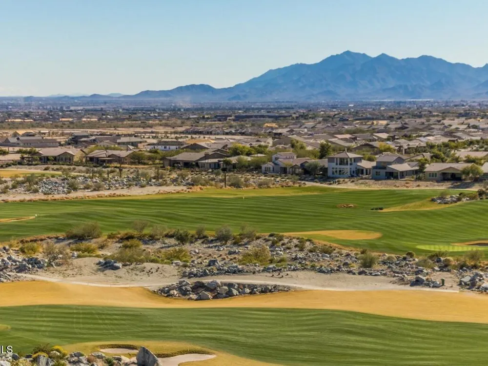 Welcome to Victory, a 55+ community in the master planned community of Verrado! 2 championship golf courses wind their way through the mountains, 90+ parks, 20+ hiking and biking paths, 4 community pools, fitness center, shopping, dinning, pickle ball and tennis courts and more! Find this home on one of Victory's quiet streets. Stunning mountain and city view home with premium upgrades! Features plantation shutters, custom kitchen backsplash, and custom closets for elegant organization. Enjoy an elevated backyard patio with new landscaping, perfect for soaking in scenic vistas. Expansive 16' sliding bay doors blend indoor-outdoor living. Garage includes storage cabinets and seal coated floor. Full house water filtration plus separate R/O drinking water system ensure pure water throughout.
