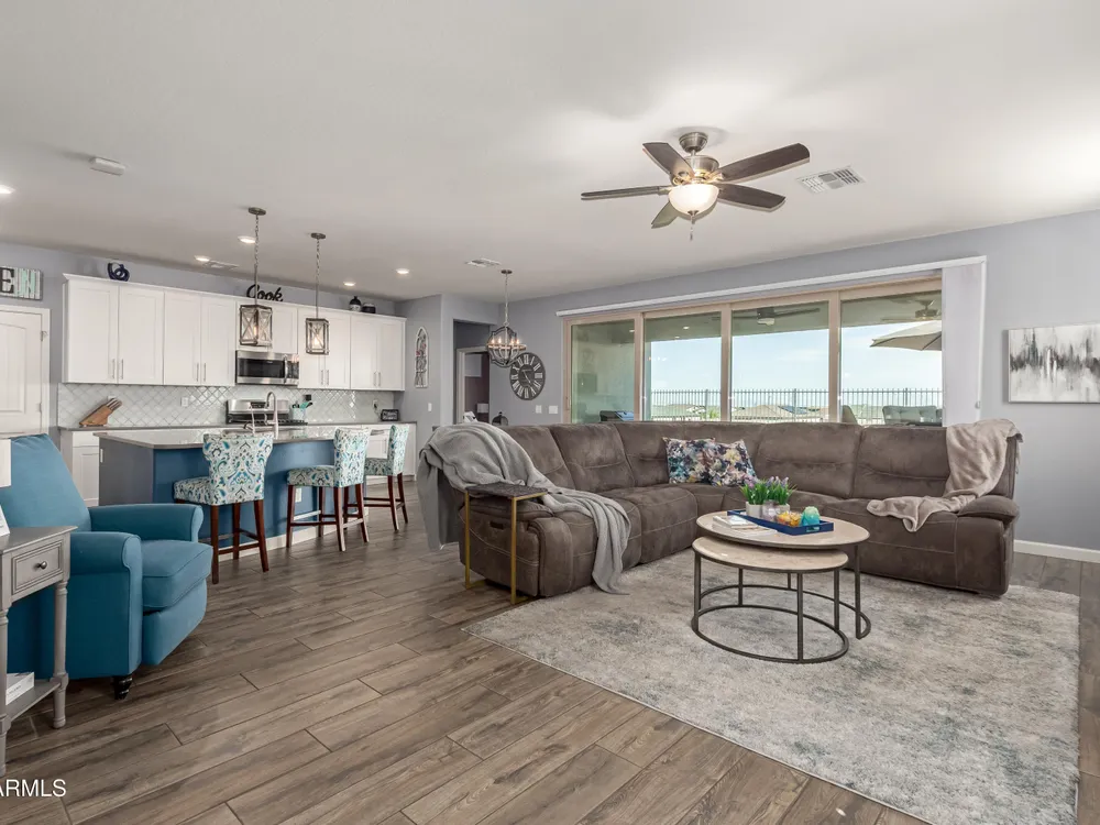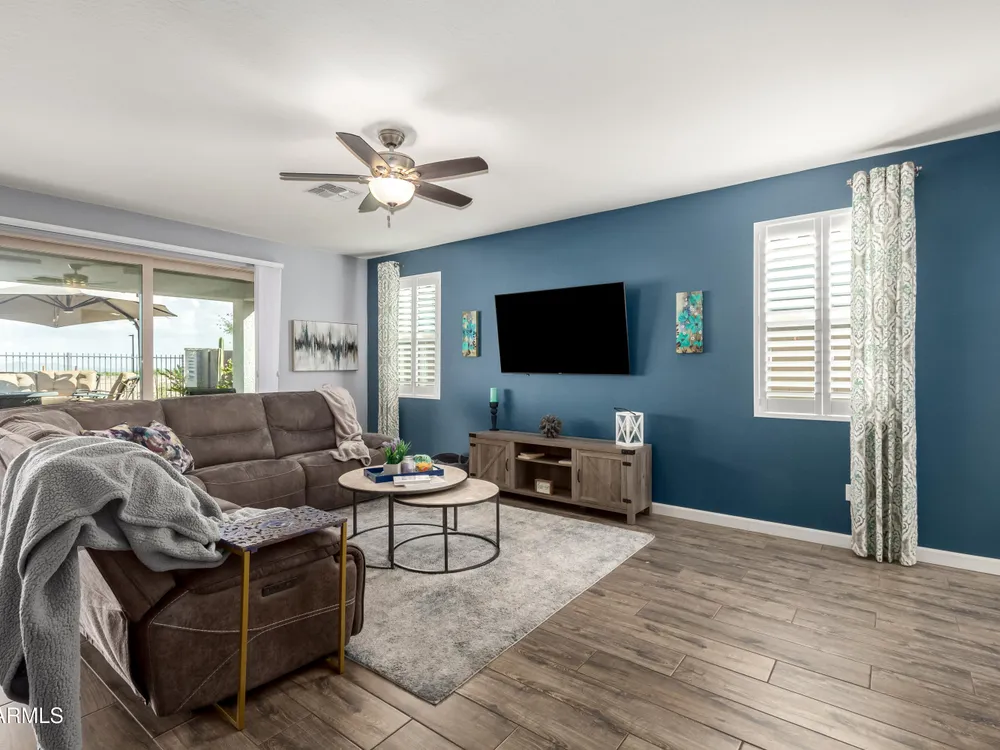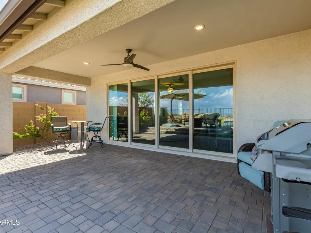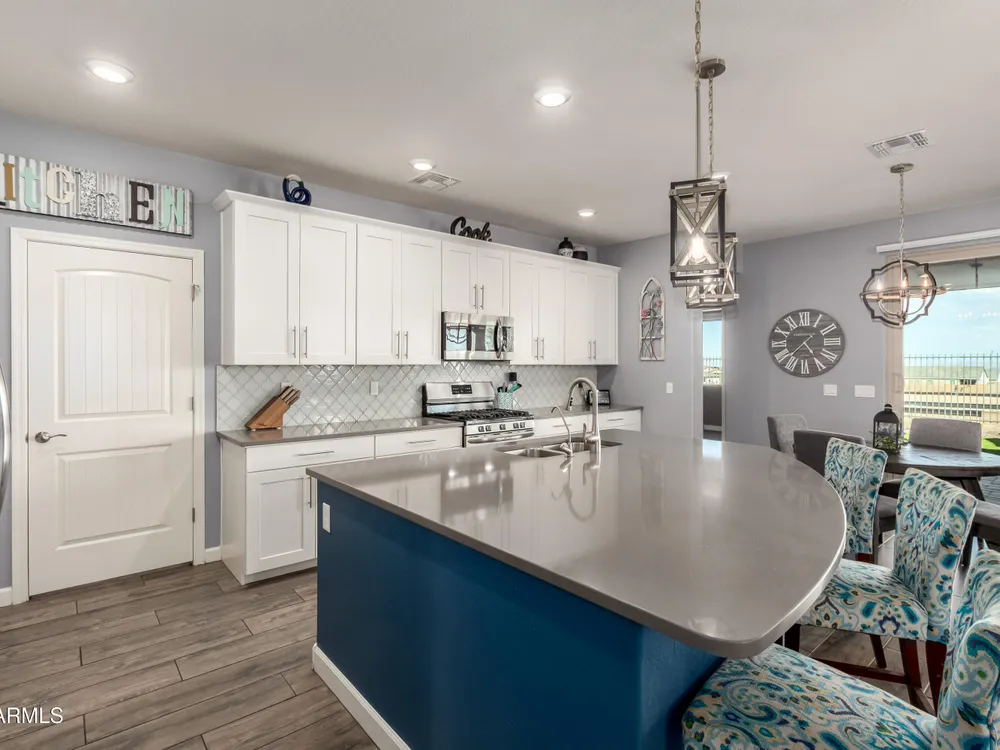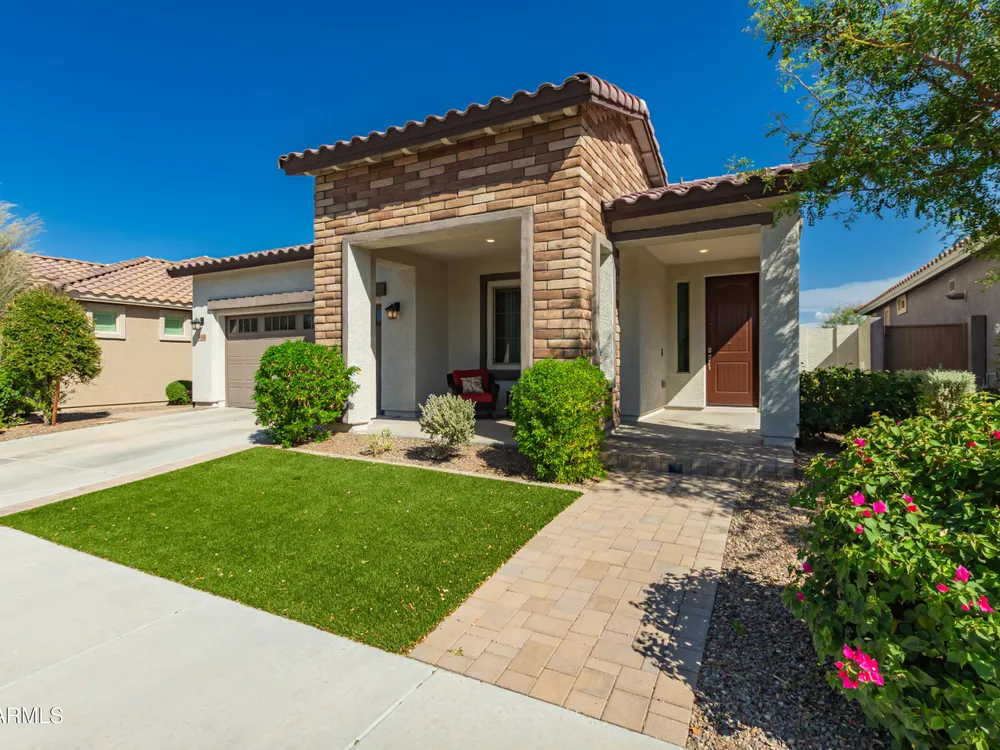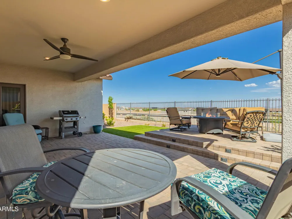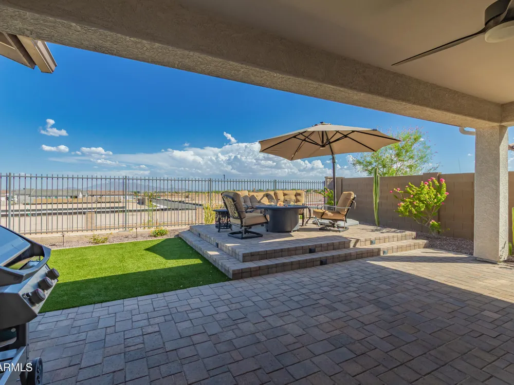 Welcome to Victory, a 55+ community in the master planned community of Verrado! 2 championship golf courses wind their way through the mountains, 90+ parks, 20+ hiking and biking paths, 4 community pools, fitness center, shopping, dinning, pickle ball and tennis courts and more! Find this home on one of Victory's quiet streets. Stunning mountain and city view home with premium upgrades! Features plantation shutters, custom kitchen backsplash, and custom closets for elegant organization. Enjoy an elevated backyard patio with new landscaping, perfect for soaking in scenic vistas. Expansive 16' sliding bay doors blend indoor-outdoor living. Garage includes storage cabinets and seal coated floor. Full house water filtration plus separate R/O drinking water system ensure pure water throughout.