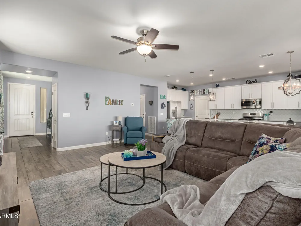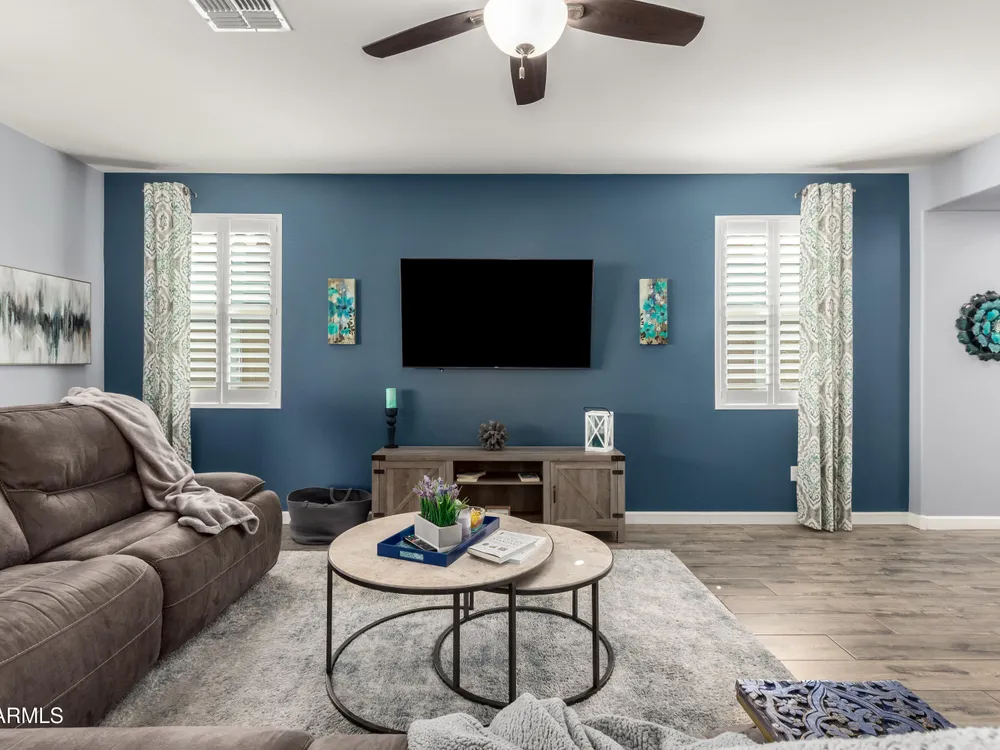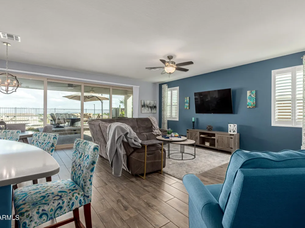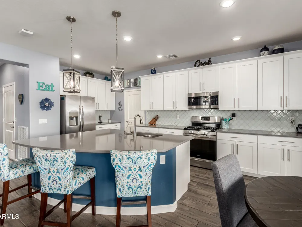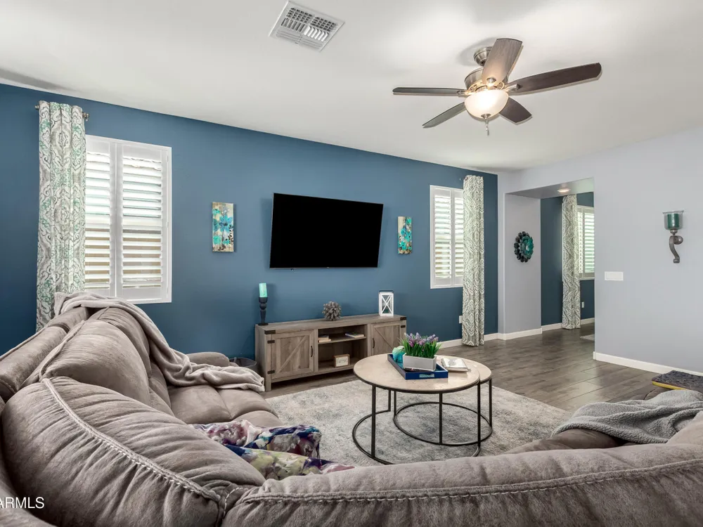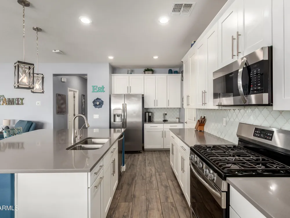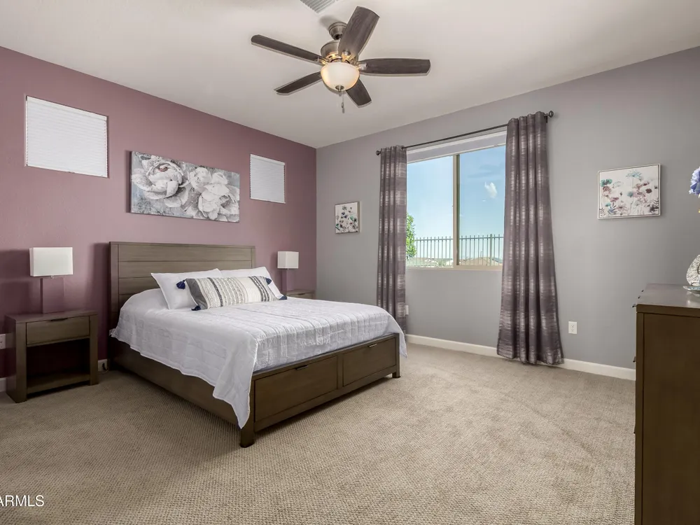 Welcome to Victory, a 55+ community in the master planned community of Verrado! 2 championship golf courses wind their way through the mountains, 90+ parks, 20+ hiking and biking paths, 4 community pools, fitness center, shopping, dinning, pickle ball and tennis courts and more! Find this home on one of Victory's quiet streets. Stunning mountain and city view home with premium upgrades! Features plantation shutters, custom kitchen backsplash, and custom closets for elegant organization. Enjoy an elevated backyard patio with new landscaping, perfect for soaking in scenic vistas. Expansive 16' sliding bay doors blend indoor-outdoor living. Garage includes storage cabinets and seal coated floor. Full house water filtration plus separate R/O drinking water system ensure pure water throughout.