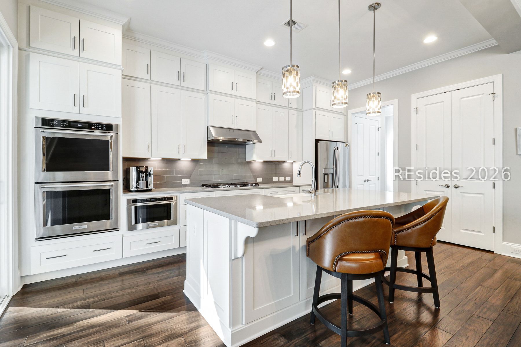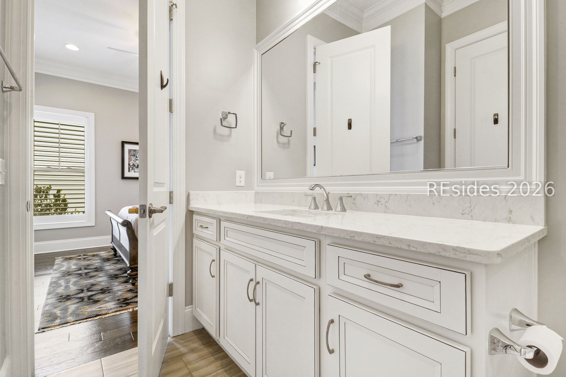 Beautifully appointed 3-bedroom, 2-bath home offering an exceptional blend of style, comfort, and functionality. The open concept floor plan features quartz countertops, hardwood floors throughout the main living areas and bedrooms, and tile in both bathrooms. Elegant double crown molding adds a refined touch throughout the home. Designed for effortless indoor-outdoor living, two large sliders open to a paver patio and a screen enclosure with a heated saltwater pool, perfect for entertaining or relaxing in your private backyard surrounded by mature landscaping. The extended primary suite offers a true retreat, featuring two walk-in closets, dual vanities, and a spacious walk-in tiled shower. Two guest bedrooms with tons of space and a guest bath, which includes a walk-in shower. Off the kitchen is a large laundry room with a folding station and extra storage. An extended garage provides space for two cars, along with a golf cart, and offers abundant storage throughout the home. Located in the sought-after Hampton Lake community, residents enjoy a resort-style lifestyle featuring a lazy river, two community pools, a scenic lake, golf-cart-friendly streets, a dog park, and an array of additional amenities.