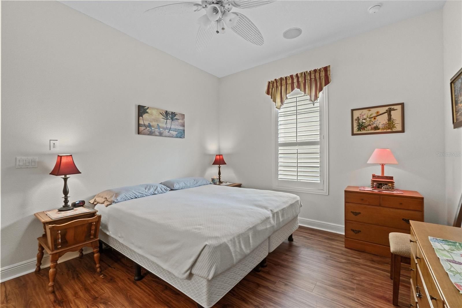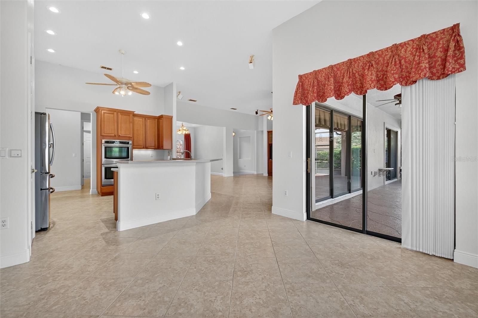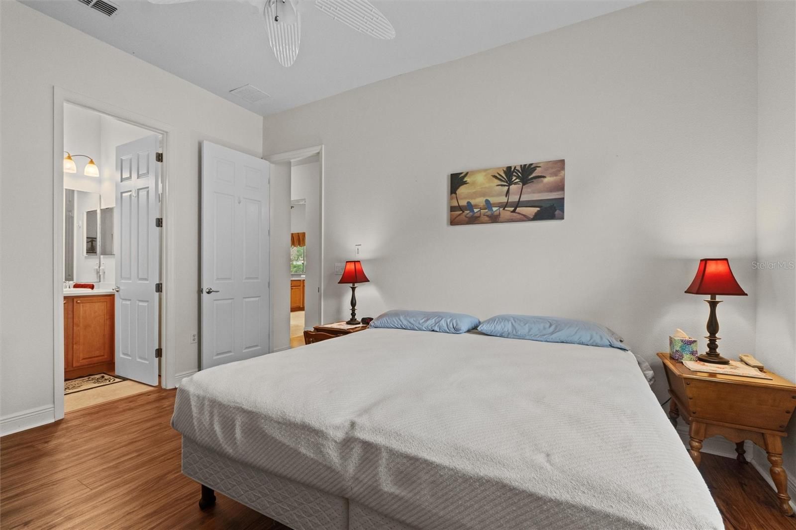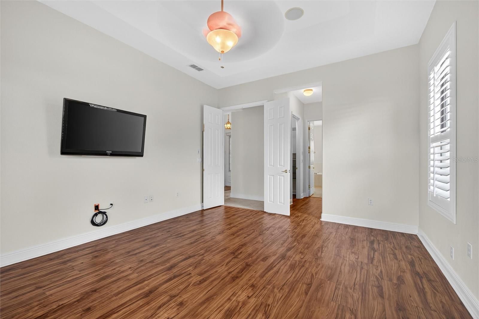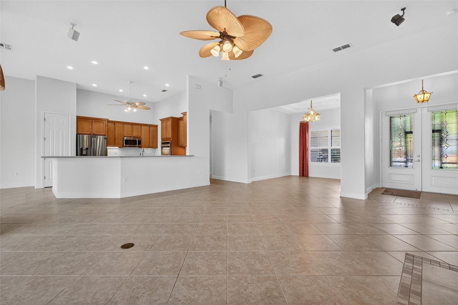 - Ceiling Fan(s), Eat-in Kitchen, Kitchen/Family Room Combo, Open Floorplan, Main Level Primary, Solid Surface Counters, Split Bedrooms, Tray Ceiling(s), Walk-In Closet(s)
