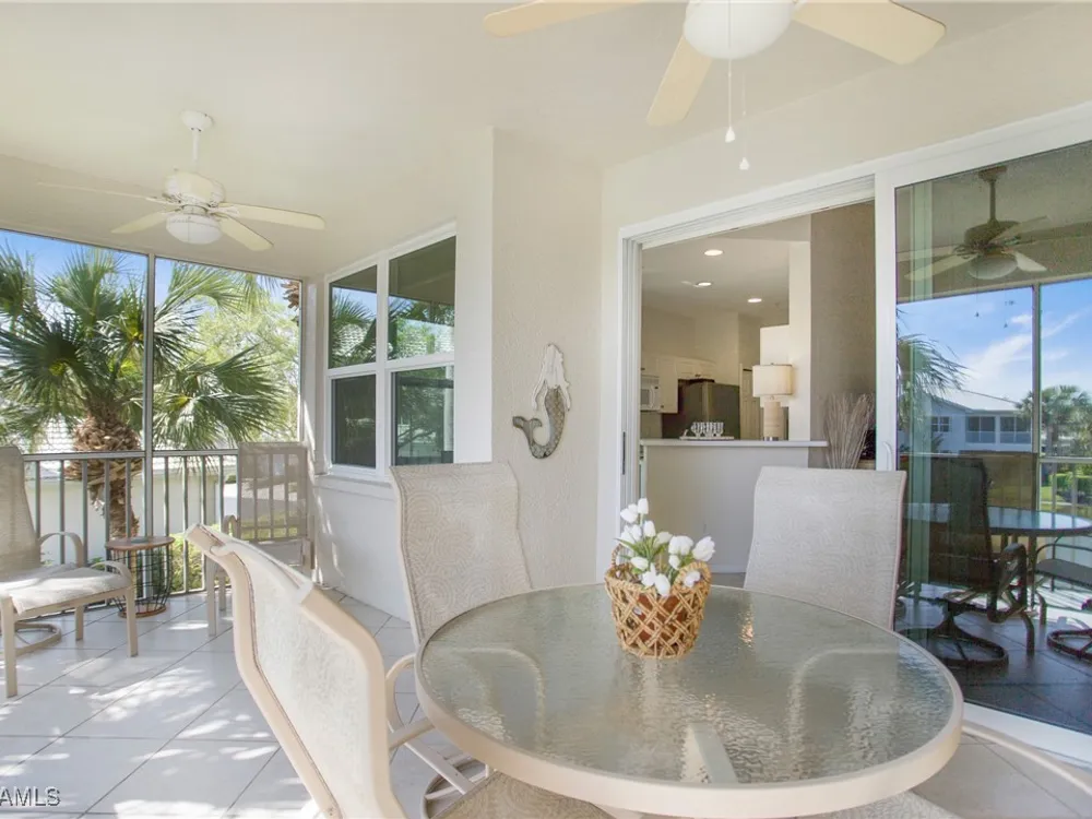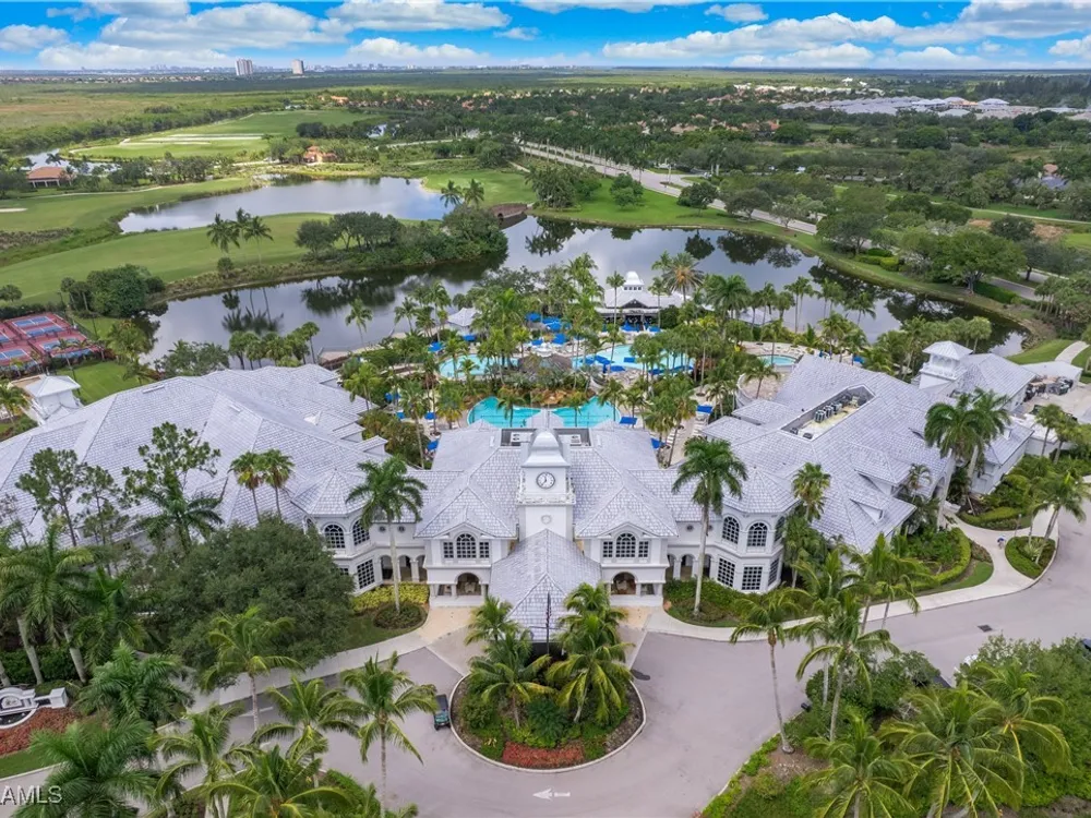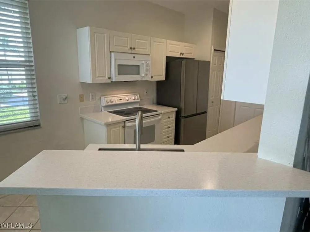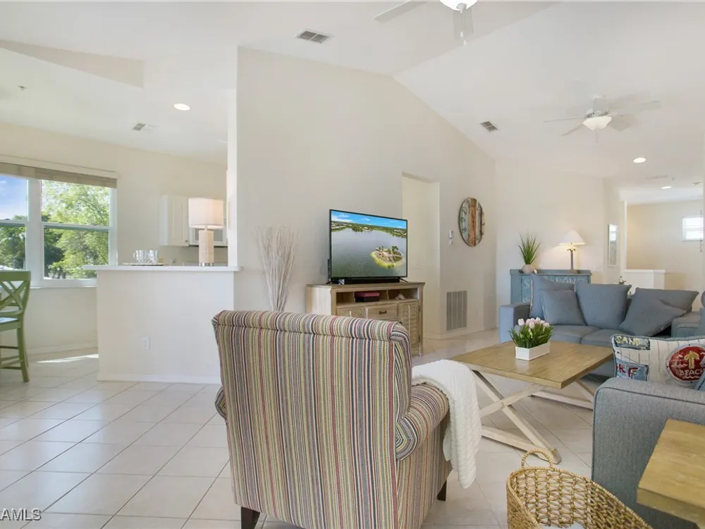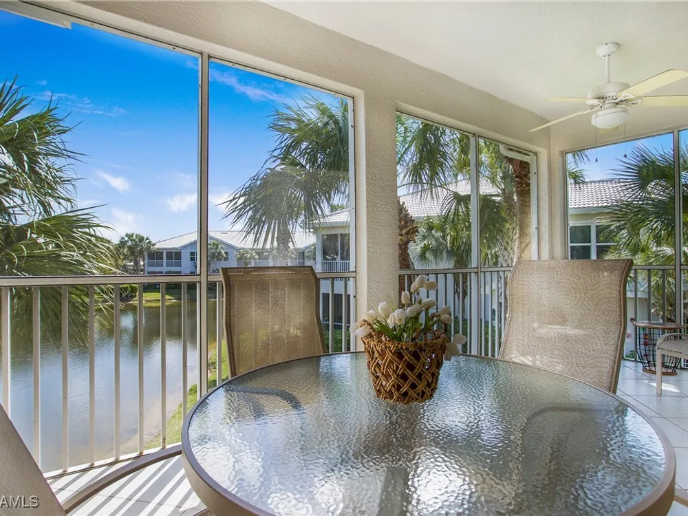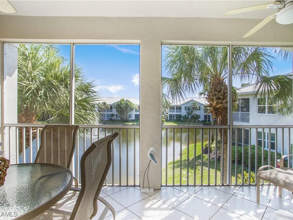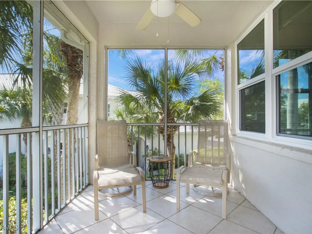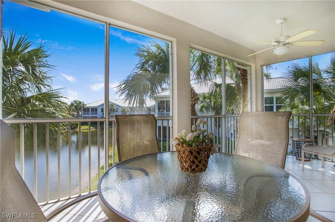 NEW KITCHEN COUNTERTOPS and SINGLE BASIN STAINLESS STEEL KITCHEN SINK. Corner TOP FLOOR UNIT & HIGH CEILINGS! The current owners are using the spacious den with solid french doors as a THIRD BEDROOM. *ONE YEAR HOME WARRANTY INCLUDED WITH PURCHASE* Step into luxury living with this second-floor coach home boasting 2 Bedrooms Plus a Den. This end unit captures the essence of elegance. This condo is turnkey, move-in-ready, with a one car garage, and plenty of guest parking for your friends and family! Bathed in natural light, the open floor plan of this beautiful sanctuary invites you to indulge in a lifestyle of comfort and serenity. You will enjoy the spaciousness of the primary bedroom, featuring a walk-in closet, dual sinks, and a large shower. As you step onto the private screened lanai, be greeted by captivating views of the tranquil lake and enchanting fountain, transforming every moment into a picturesque escape. This stunning unit boasts modern amenities, including a newer roof and recently installed impact glass windows and sliders, ensuring both safety and sophistication. But the luxuries extend far beyond your doorstep. Elevate your lifestyle with exclusive access to the 54,000-square-foot club and spa, where opulence knows no bounds. Maintain your well-being in the state-of-the-art fitness center, or unleash your competitive spirit on the six tennis courts, pickleball, and bocce facilities. Engage in a vibrant social scene with a myriad of activities, or explore the sprawling jogging and bike paths that wind through the community's lush surroundings. Dining becomes an experience unto itself, with options ranging from casual to fine dining, promising culinary delights to tantalize every palate. Optional memberships offer coveted access to golf, beach, and marina privileges, ensuring a lifestyle tailored to your desires. Conveniently located near Marco and Naples airports, beaches, shopping, restaurants, and boating, with quick access to Naples' iconic 5th Avenue, this community offers the epitome of convenience without compromising on luxury. Embrace a life where every moment is infused with peace, elegance, and the promise of a grand lifestyle.