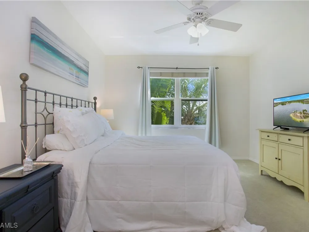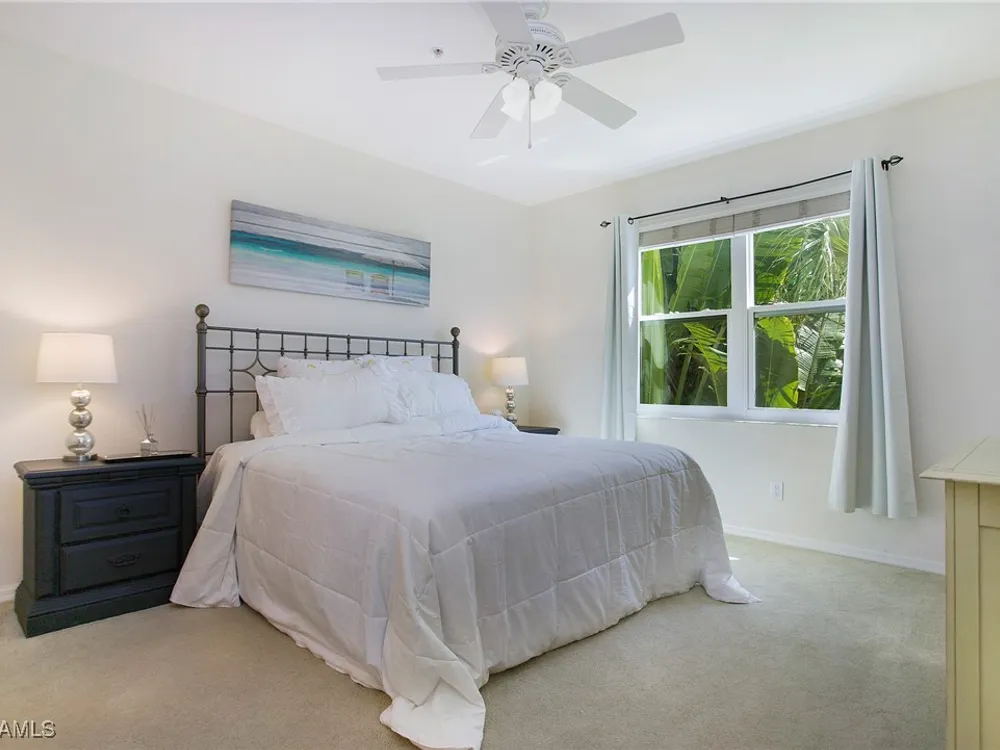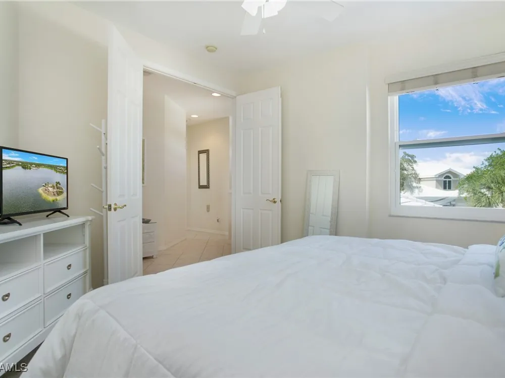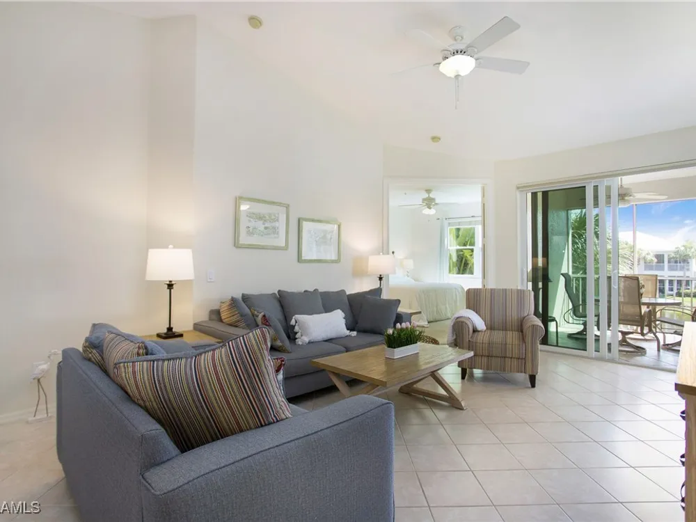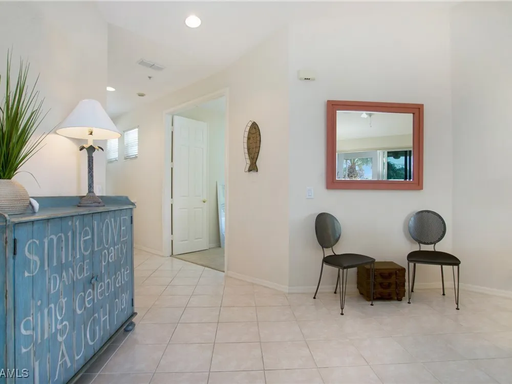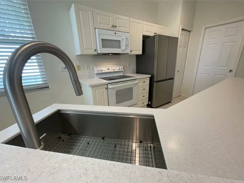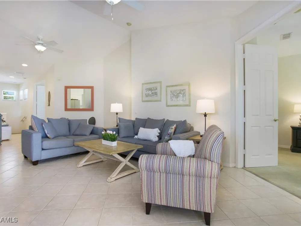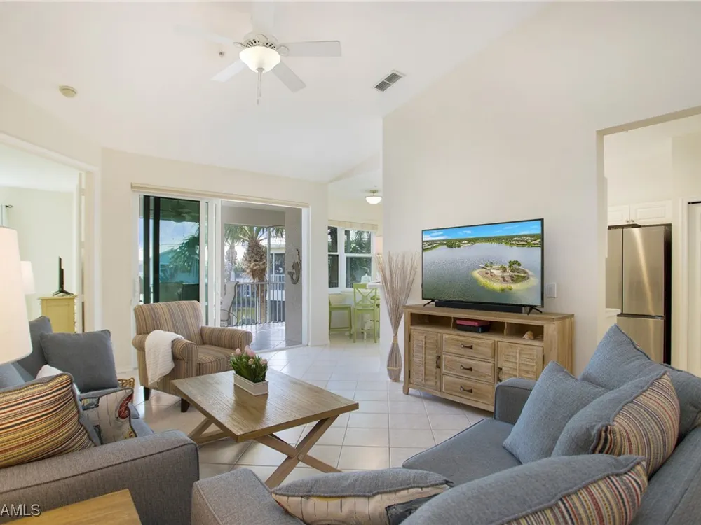 NEW KITCHEN COUNTERTOPS and SINGLE BASIN STAINLESS STEEL KITCHEN SINK. Corner TOP FLOOR UNIT & HIGH CEILINGS! The current owners are using the spacious den with solid french doors as a THIRD BEDROOM. *ONE YEAR HOME WARRANTY INCLUDED WITH PURCHASE* Step into luxury living with this second-floor coach home boasting 2 Bedrooms Plus a Den. This end unit captures the essence of elegance. This condo is turnkey, move-in-ready, with a one car garage, and plenty of guest parking for your friends and family! Bathed in natural light, the open floor plan of this beautiful sanctuary invites you to indulge in a lifestyle of comfort and serenity. You will enjoy the spaciousness of the primary bedroom, featuring a walk-in closet, dual sinks, and a large shower. As you step onto the private screened lanai, be greeted by captivating views of the tranquil lake and enchanting fountain, transforming every moment into a picturesque escape. This stunning unit boasts modern amenities, including a newer roof and recently installed impact glass windows and sliders, ensuring both safety and sophistication. But the luxuries extend far beyond your doorstep. Elevate your lifestyle with exclusive access to the 54,000-square-foot club and spa, where opulence knows no bounds. Maintain your well-being in the state-of-the-art fitness center, or unleash your competitive spirit on the six tennis courts, pickleball, and bocce facilities. Engage in a vibrant social scene with a myriad of activities, or explore the sprawling jogging and bike paths that wind through the community's lush surroundings. Dining becomes an experience unto itself, with options ranging from casual to fine dining, promising culinary delights to tantalize every palate. Optional memberships offer coveted access to golf, beach, and marina privileges, ensuring a lifestyle tailored to your desires. Conveniently located near Marco and Naples airports, beaches, shopping, restaurants, and boating, with quick access to Naples' iconic 5th Avenue, this community offers the epitome of convenience without compromising on luxury. Embrace a life where every moment is infused with peace, elegance, and the promise of a grand lifestyle.