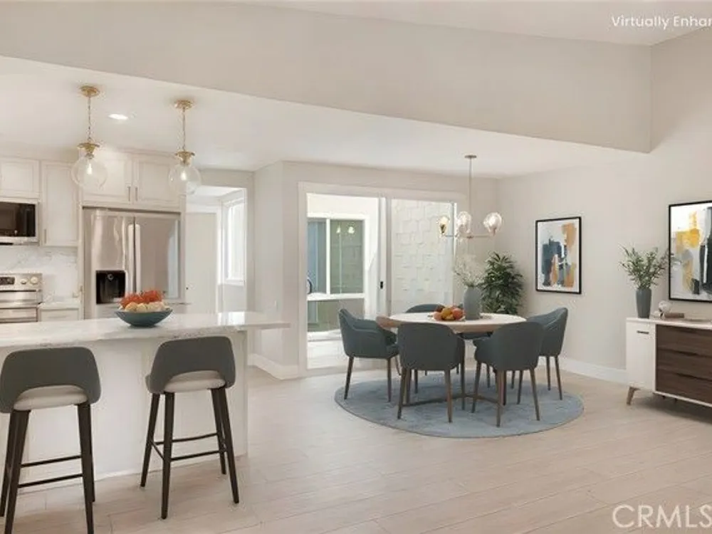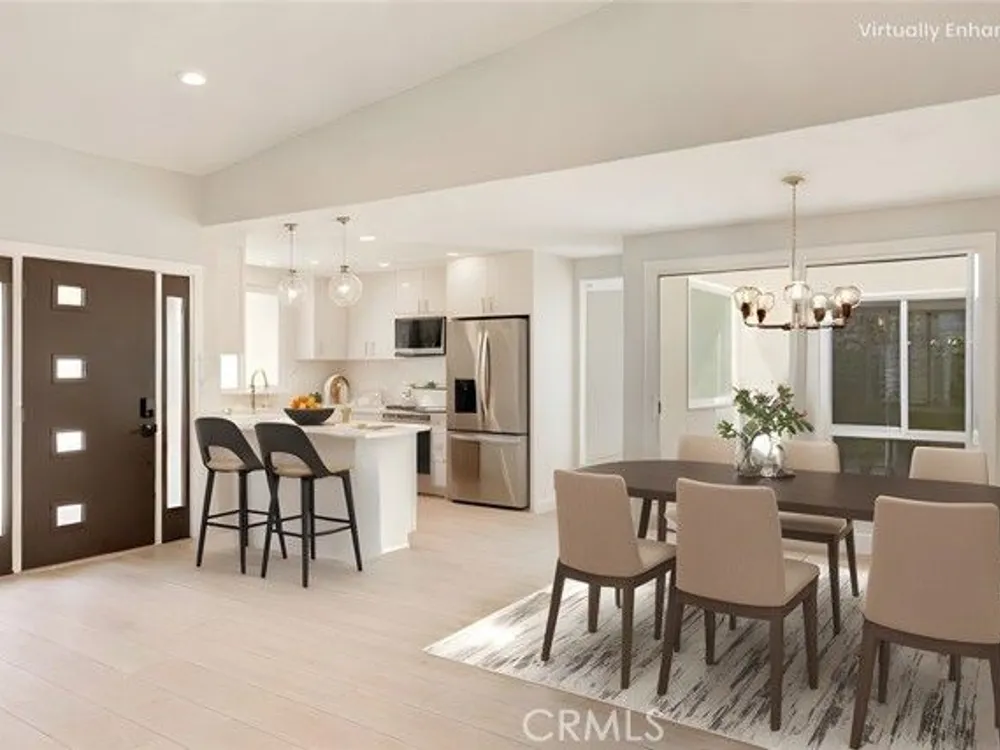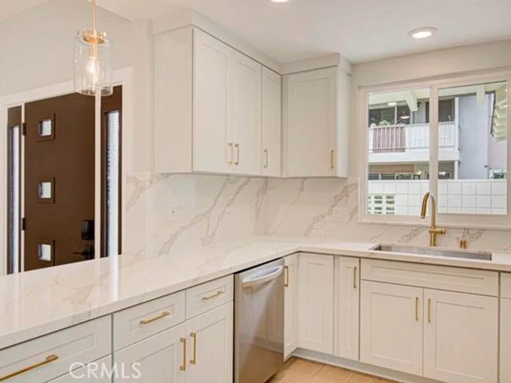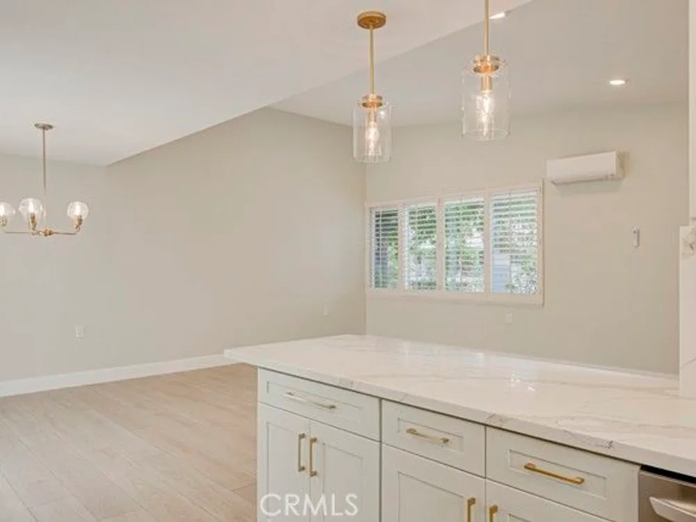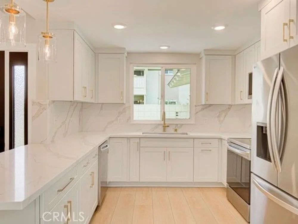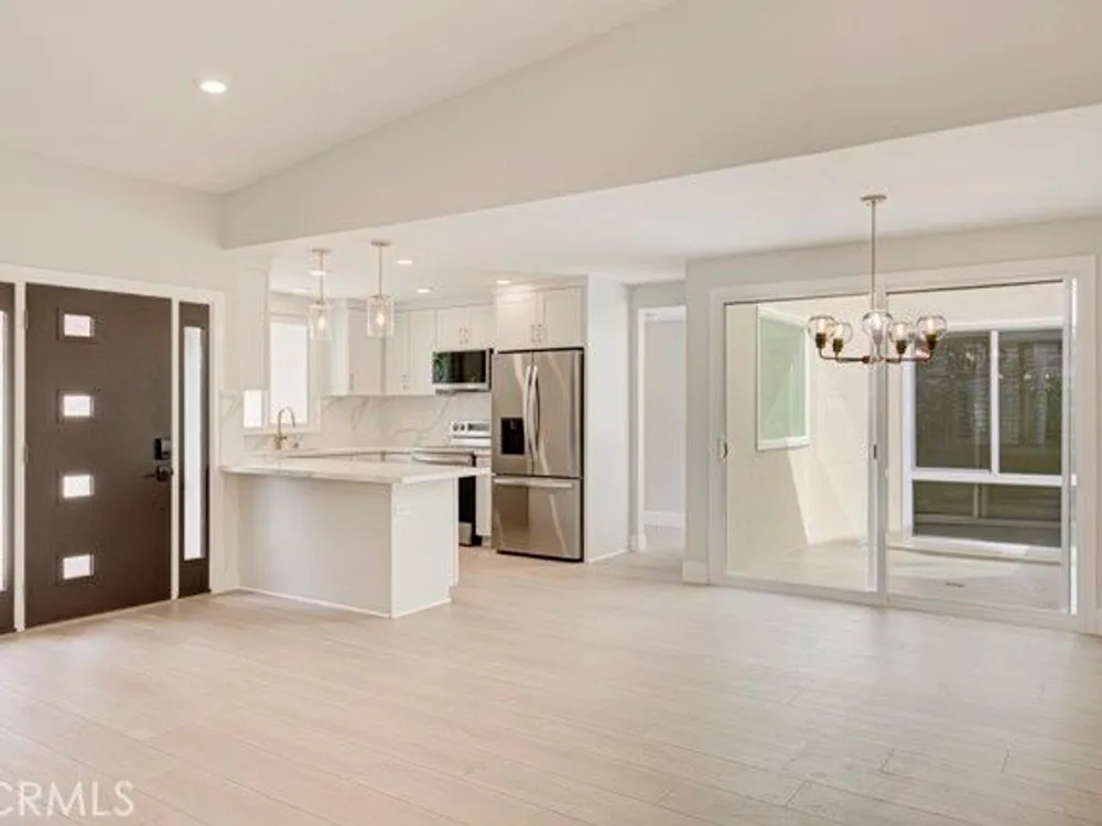 Welcome to 47-D Calle Aragon, a stunning end-unit 2 bedroom, 1 bath VALENCIA model nestled in the heart of the vibrant 55+ community of Laguna Woods Village. This completely remodeled, single-story home blends style, comfort, and functionality in all the right ways. Step inside to find gorgeous light-toned plank flooring, smooth ceilings, and recessed lighting throughout. The open-concept kitchen is a showstopper, featuring quartz countertops, soft-close cabinets, stylish pendant lighting, and brand-new LG appliances—perfect for entertaining or everyday living. Stay comfortable year-round with energy-efficient mini-split systems in the living room and both bedrooms. The spa-like bathroom offers a luxurious retreat with gold fixtures and accents that add a touch of elegance. Enjoy your morning coffee or unwind in the serene open-air atrium, a private oasis perfect for relaxation. Additional highlights include dual-pane windows and slider, and an in-unit washer & dryer for added convenience.
