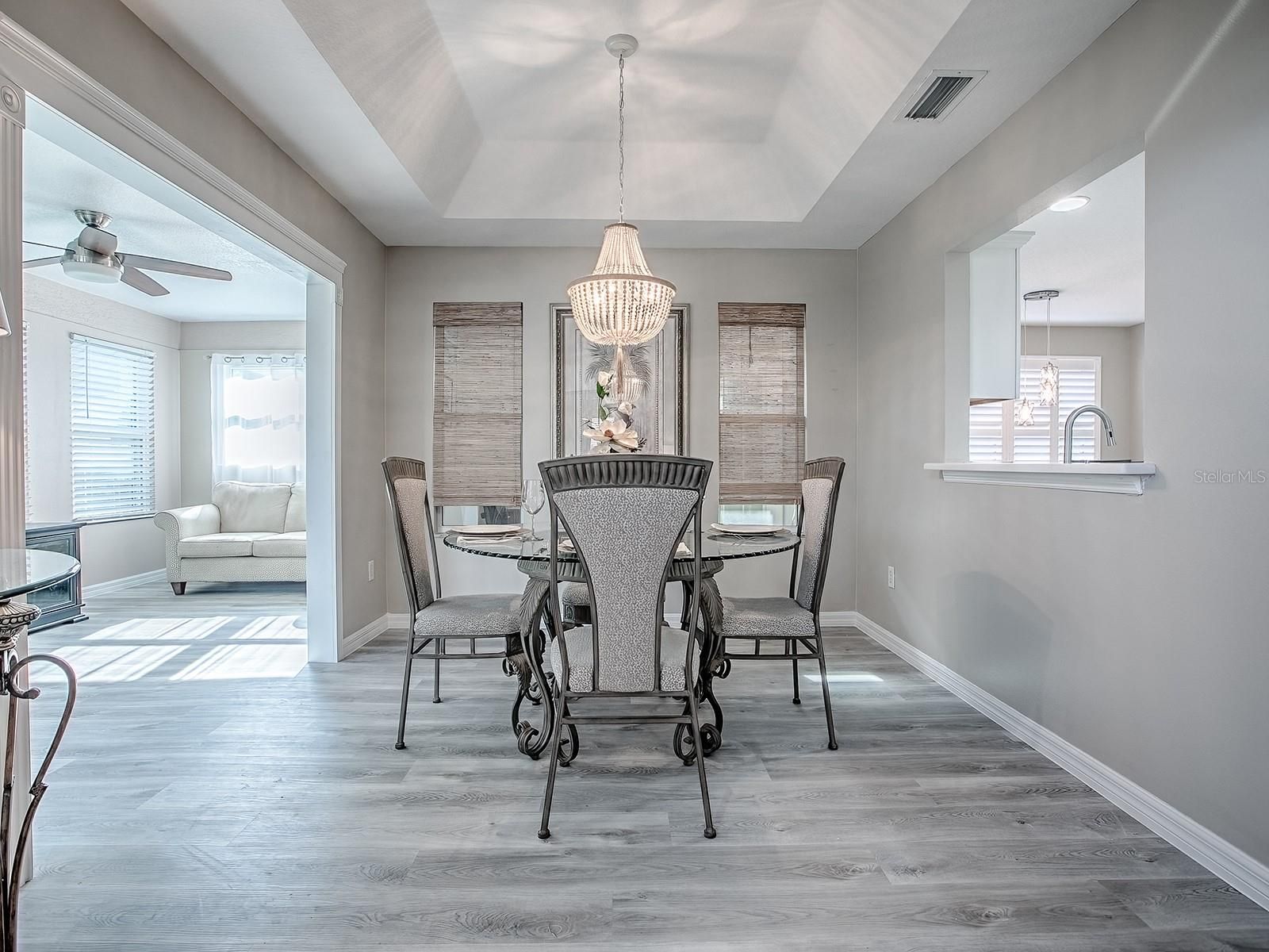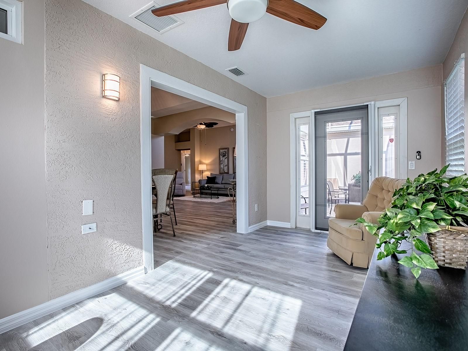 LOVELY UPDATED 3/2 DESIGNER HOME - STUCCO OLEANDER MODEL - LOCATED IN THE VILLAGE OF MALLORY, VERY CLOSE PROXIMITY TO LAKE SUMTER MARKET SQUARE! ROOF 2022, HVAC 2015. THE OLEANDER MODEL offers Timeless Architectural Themes with Modern Style to create a truly GORGEOUS HOME. FRESHLY PAINTED Interior, NEW LUXURY VINYL FLOORING throughout with TILE in the wet areas. A LARGE, OPEN LIVING AREA, with LOTS of WINDOWS, PLANTATION SHUTTERS and VOLUME CEILINGS create a LIGHT & BRIGHT HOME. Designated Dining Room flows seamlessly from the main living area, and has a pass thru to the kitchen. The EAT-IN Kitchen has WHITE Cabinetry, QUARTZ Counters, STAINLESS APPLIANCES (GAS Range), Large Kitchen Island, and Plantation Shutters. Just off the kitchen you will find a unique Multi-purpose Room - making for a great home Office or Craft Room! There is a nice sized FLORIDA ROOM creating additional living space! Access the SCREENED LANAI from the FLORIDA ROOM when you are looking to enjoy the outdoors. French Doors open to a LARGE PRIMARY ENSUITE, HIGH TRAY CEILINGS, DUAL WALK-IN CLOSETS, and DUAL VANITY WITH QUARTZ COUNTERTOP. SPLIT FLOOR PLAN design with the GUEST BEDROOMS on the front side of the home. Spacious Guest Bathroom includes Tub/Shower combo and Large Vanity with Quartz Countertops. The Village of Mallory Square offers beautiful homes and several recreational options in this very special neighborhood. The Mallory Hill Country Club is perched among 27 holes of fabulous championship golf. There are several executive courses nearby as well. WHAT A FANTASTIC PLACE TO CALL HOME!! **BONUS- FURNISHINGS STAY WITH THE HOME IF DESIRED**
