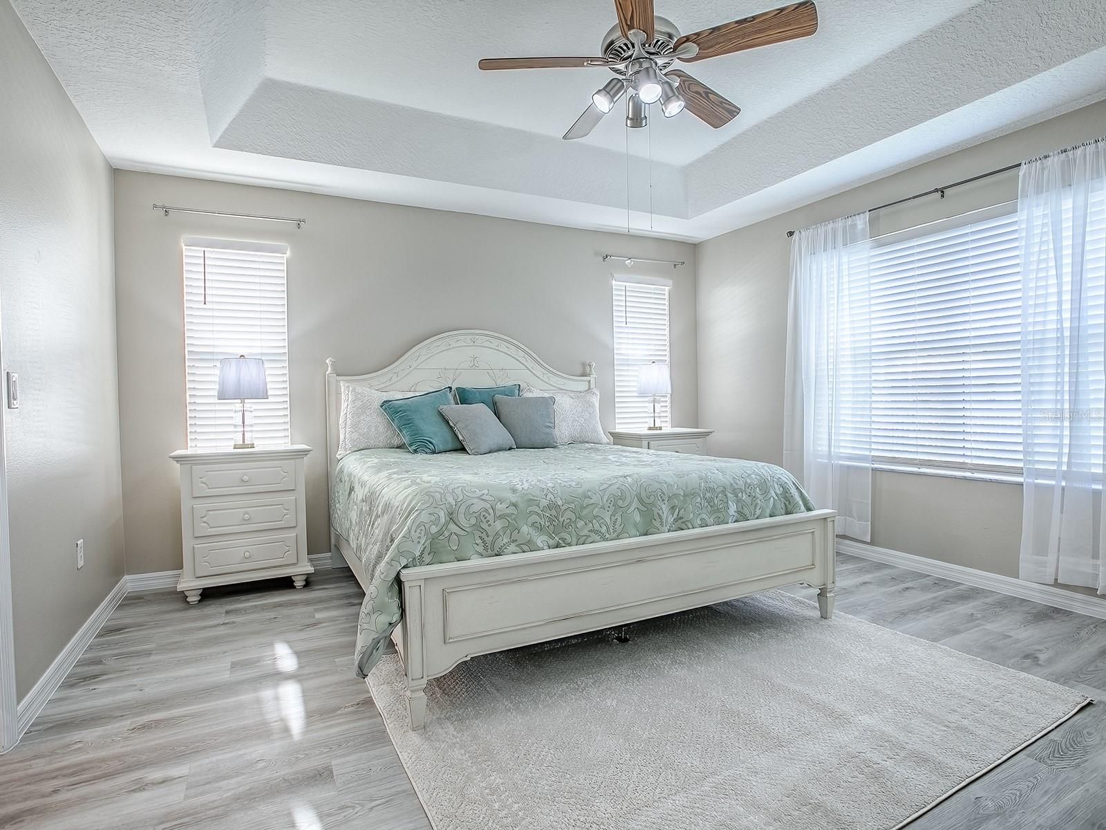 - Ceiling Fan(s), Eat-in Kitchen, High Ceilings, Upper Level Primary, Split Bedrooms, Thermostat, Walk-In Closet(s), Window Treatments