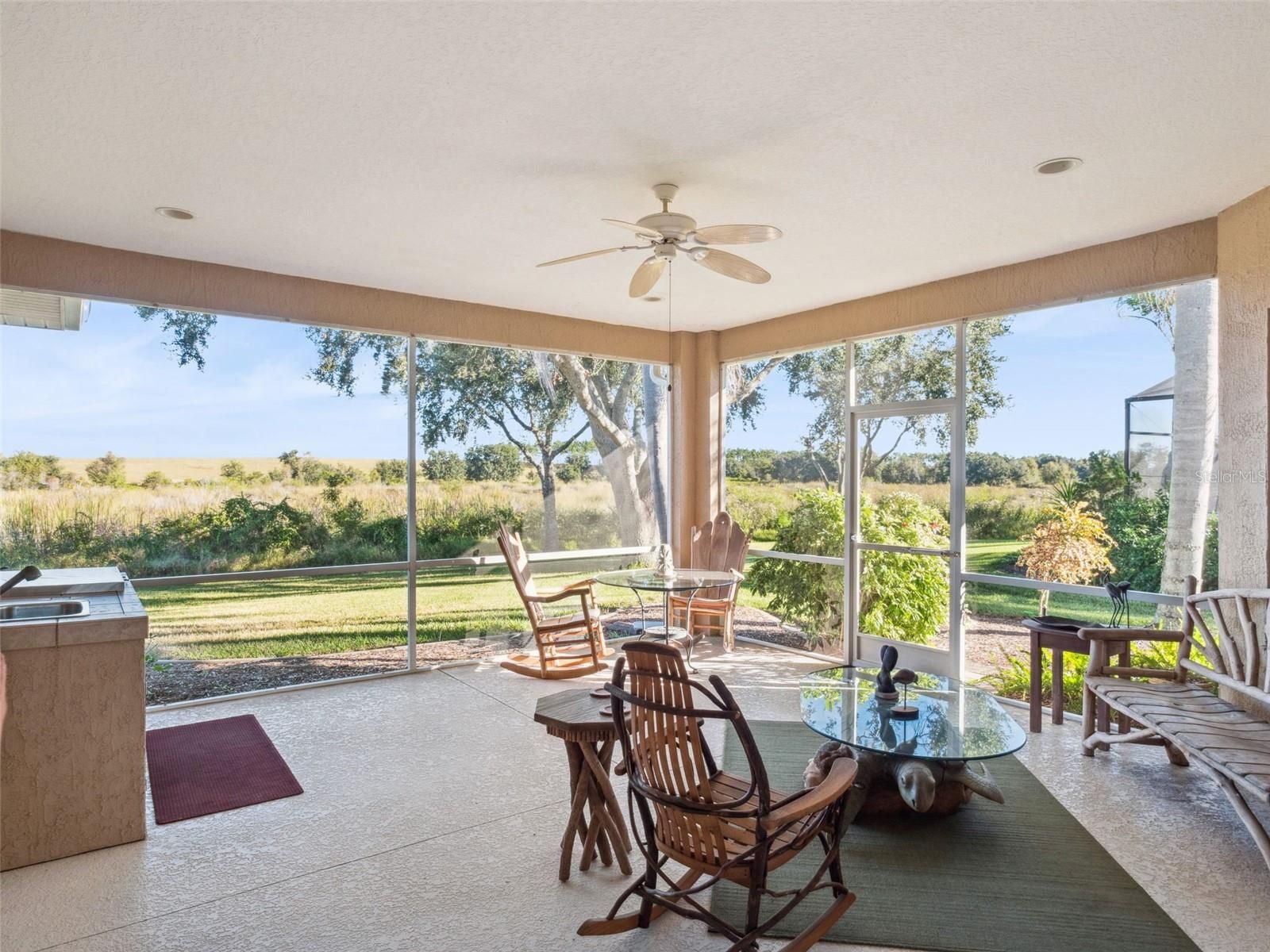 A Bird Lovers Paradise: Exquisite Huntly Model Home in the Royal Highlands 55+ Community! We are proudly offering this three Bedroom, Two Bath, stunning home with Conservation Views—A Serene Oasis Awaits You! Discover the ultimate sanctuary for bird enthusiasts and nature lovers in this beautifully modified and meticulously maintained Huntly model home. Nestled in the sought-after Royal Highlands community, this residence offers tranquility, luxury, and a breathtaking view of the vast conservation area—all from the comfort of your expansive screened lanai. This home boasts three spacious bedrooms designed for comfort and privacy, and two ample baths, including a primary suite with a soaker tub, step-in shower, and dual vanity. The open-concept floor plan features inviting architecture, high ceilings, and crown molding throughout, creating an airy and welcoming atmosphere. The lanai’s summer kitchen is equipped with a premium Jenn-Air gas cooktop, storage, sink and counter area. The kitchen boasts lovely Corian counters, and all appliances are included. You can enjoy both formal and casual dining areas, perfect for entertaining guests or enjoying cozy family meals. Gorgeous hardwood floors run throughout the main living spaces, adding warmth and sophistication, while the screened entry porch provides a welcoming and secure space to enjoy the outdoors year-round. The beautifully landscaped exterior features low-maintenance lava rock accents and fresh new screening. The oversized garage offers ample storage, built-in cabinets, attic access, a new door opener, and a utility sink for convenient clean-up. This home comes with valuable updates, including a brand new 2025 roof providing peace of mind for years to come, a 2022 water heater, and a 2016 HVAC system for improved energy efficiency. Throughout the home, you'll find updated fans, screening, and Plantation Shutters, enhancing comfort and style. Royal Highlands offers an impressive array of resort-style features, beginning with its 18-hole golf course, and catch & release fishing lakes. Residents enjoy access to two resort-style pools, pickleball, tennis, and softball courts, as well as a theater stage and a fully equipped fitness center. With hundreds of clubs and activities for every interest, an on-campus restaurant, a driving range, and scenic nature trails just steps from your door, the community truly caters to an active lifestyle. Make This Paradise Yours with its exceptional features, stunning conservation views, and access to unparalleled amenities. Our Royal Highlands Huntly model home is truly a bird lover’s paradise. Schedule your private tour today and experience serenity, comfort, and community at its finest!