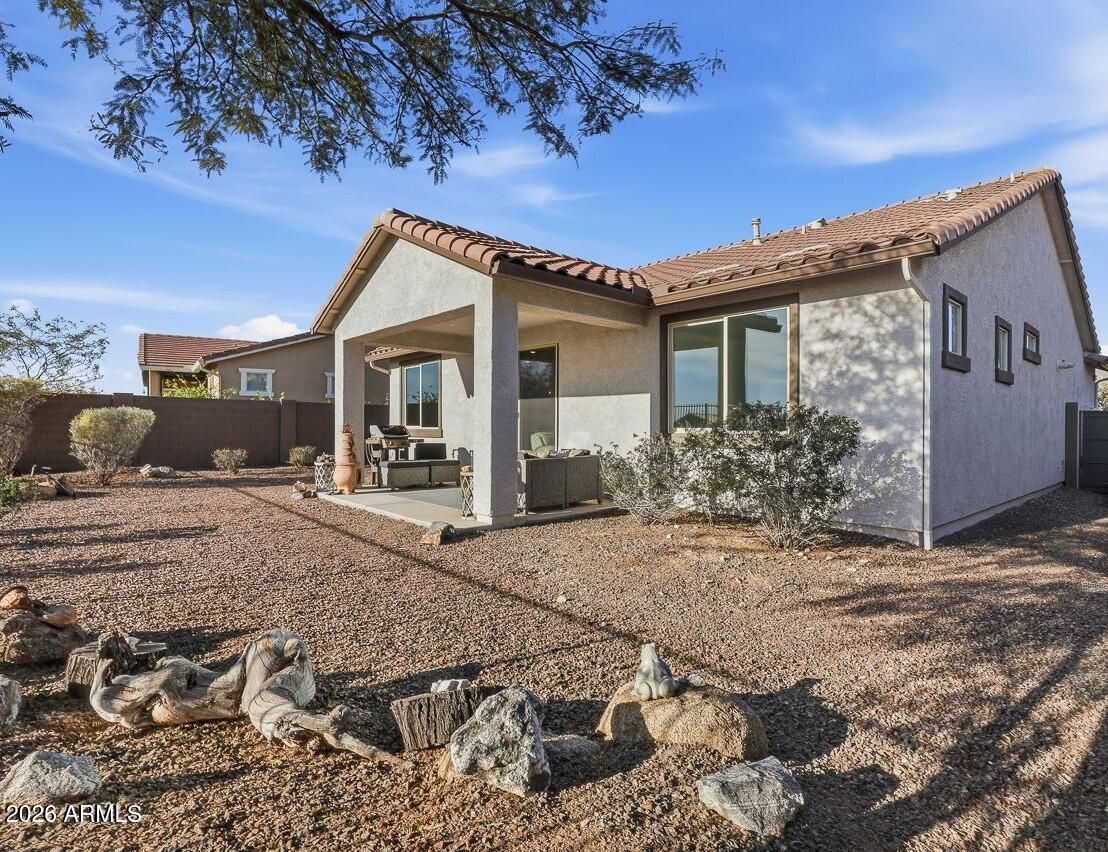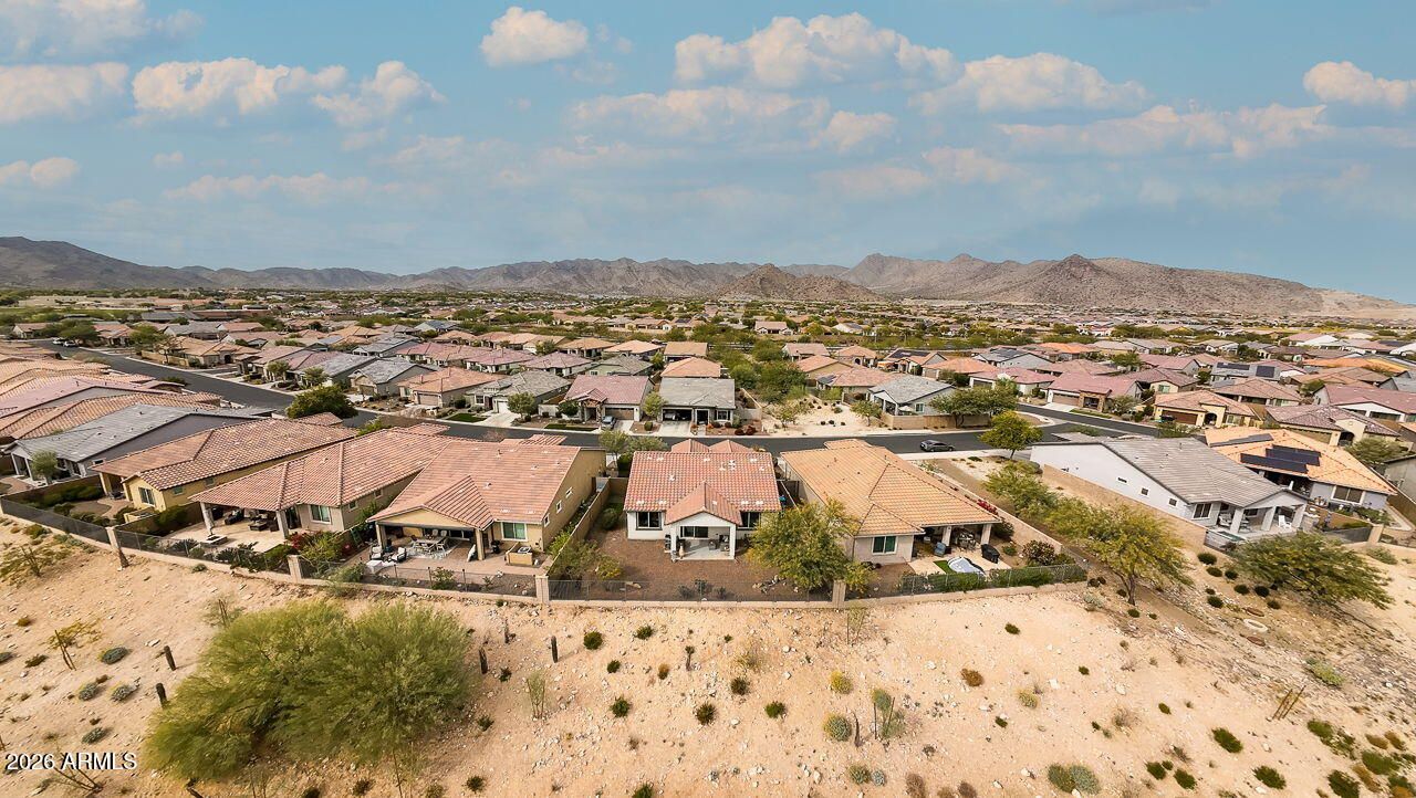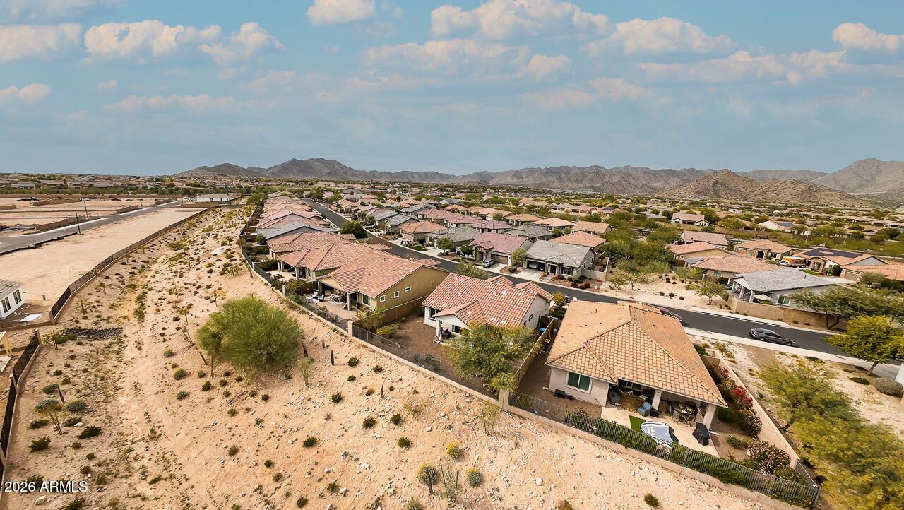 This welcoming bungalow offers low-maintenance desert landscaping and exceptional privacy on an elevated lot with beautiful views of the White Tank Mountains. A custom front door and upgraded windows create an inviting first impression for both residents and guests. The thoughtfully designed kitchen features a closet pantry, generous granite counter space, and a center island ideal for everyday living and entertaining. A full appliance package including refrigerator, stovetop/oven, dishwasher, and microwave, makes for an easy, move-in-ready experience. The primary suite is a comfortable retreat with a spacious walk-in closet, dual sinks, a separate water closet & large walk-in shower. The guest bedroom, located at the front of the home, enjoys mountain views and its own walk-in closet. perfect for visitors or a home office. A conveniently located indoor laundry area is discreetly tucked behind closet doors and includes shelving along with a stackable washer and dryer. The neighborhood features a charming sitting area with a wooden bench and grassy green space, adding to the home's welcoming atmosphere. Residents of Victory at Verrado enjoy an impressive array of resort-style amenities, including a private fitness center, clubhouse with pools and spa, billiards, on-site dining, tennis and pickleball courts, golf, exclusive clubs, parks, and miles of scenic hiking trails. Living in Victory at Verrado offers a lifestyle centered on connection, convenience, and elevated desert living perfect for those seeking more than just a home, but a vibrant, active community designed for easy living.