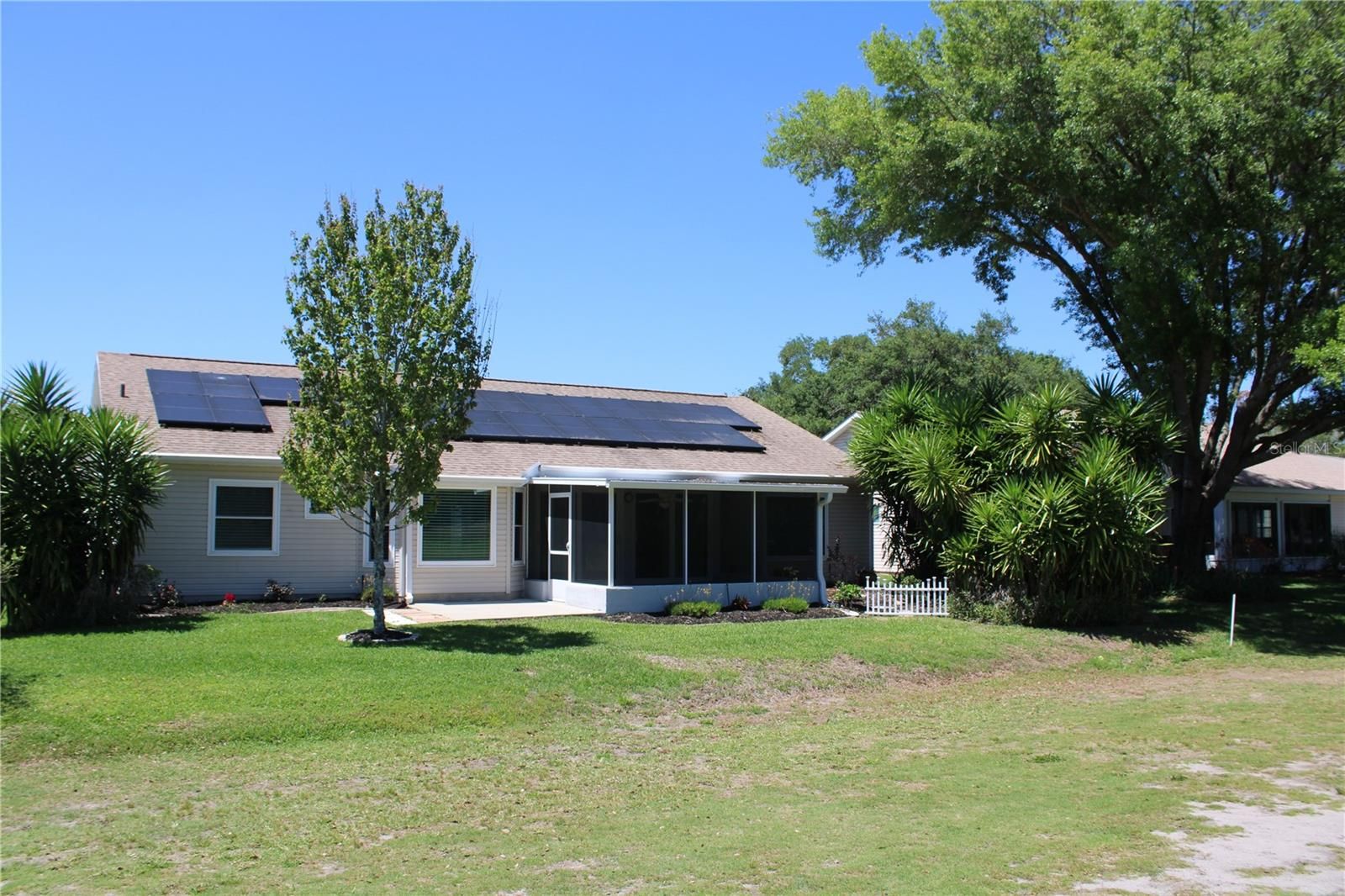 NO ELECTRIC BILLS and NO REAR NEIGHBORS! The home's Solar Energy System includes 38-SOLAR Panels (2023) and TESLA POWERWALL (2024) installed by SunVena Solar in Sanford, Florida, and ELIMINATES YOUR ELECTRIC BILL, allowing for a 5-DAY ELECTRIC SUPPLY in the event of an outage. Water is delivered through the WHOLE HOUSE WATER SOFTENER & CHARCOLE FILTER SYSTEM, INCLUDING exterior hose bibs (2025), and is the ONLY UTILITY you’ll pay. Enjoy Clean Air, as the HVAC AND DUCTWORK was CHANGEDOUT (2020). This is a one-of-a-kind customized home that sits off of Otter Creek’s 6th Fairway, and offers many quality upgrades that allow for an affordable and comfortable lifestyle. The home’s modifications include the 2’ wall extension on the left side of the structure and a 9’ wall extension on the left rear of the home, creating additional living space. You enter the home into an open combined Living and Dining Room area, which leads to the additional bright Bonus Area. The Custom Designed Kitchen has pull-out shelves, soft-close cabinet doors, white cottage cabinetry, one-piece granite counter tops, SS appliances, under-counter lighting, a family-sized breakfast bar, white classic chair rail, and an expanded Dinette featuring three bay windows. High ceilings allow for an abundance of natural light, which adds to the appeal of this luxurious open floor plan. The Primary Bedroom, Guest Bedroom and Bedroom #3 have Pergo wood laminate flooring. Bedroom #3 has the 9’ rear extension and can be used as an office, game room or study. The Primary and Guest Bathrooms were remodeled (2020) to include ACCESSIBLE BATHROOM SHOWERS and granite countertops. ADDITIONAL UPGRADES include Double Pane and Double Hung windows throughout, Pergo Laminate Flooring (excluding the bathrooms, laundry room and bonus room), a 50-gallon Water Heater (2019), and a seasonal storm door for the main entry. The Garage has been extended by 2’ and houses the Tesla Powerwall, which accommodates the home’s Solar Energy System. The Attic has extra insulation throughout, and a metal pull-down ladder. Double Pane insulated sliding glass doors allow access to the custom & private screened Lanai, which has an insulated ceiling, floor drain, and is rated to 125 MPH sustainable wind speeds. Facing East, you’ll enjoy year-round comfortability and viewing the rocket launches from Cape Canaveral. The Plantation at Leesburg, situated in Central Florida, is a well-established, access-controlled community that fosters neighborly interaction. The community has 3 fully staffed activity centers equipped with heated pools and spas, fitness facilities, two 18-hole golf courses, a driving range & putting green, Restaurant & Tavern, Pro Shop, woodworking shop, optional RV & Boat Storage, courts for tennis & pickleball, and a variety of activities. The entire community's design encourages residents to get out, meet people, and stay active. Only a short drive to main highways, shopping, health care facilities, attractions and beaches. EASY TO SHOW! Equal Opportunity Housing.