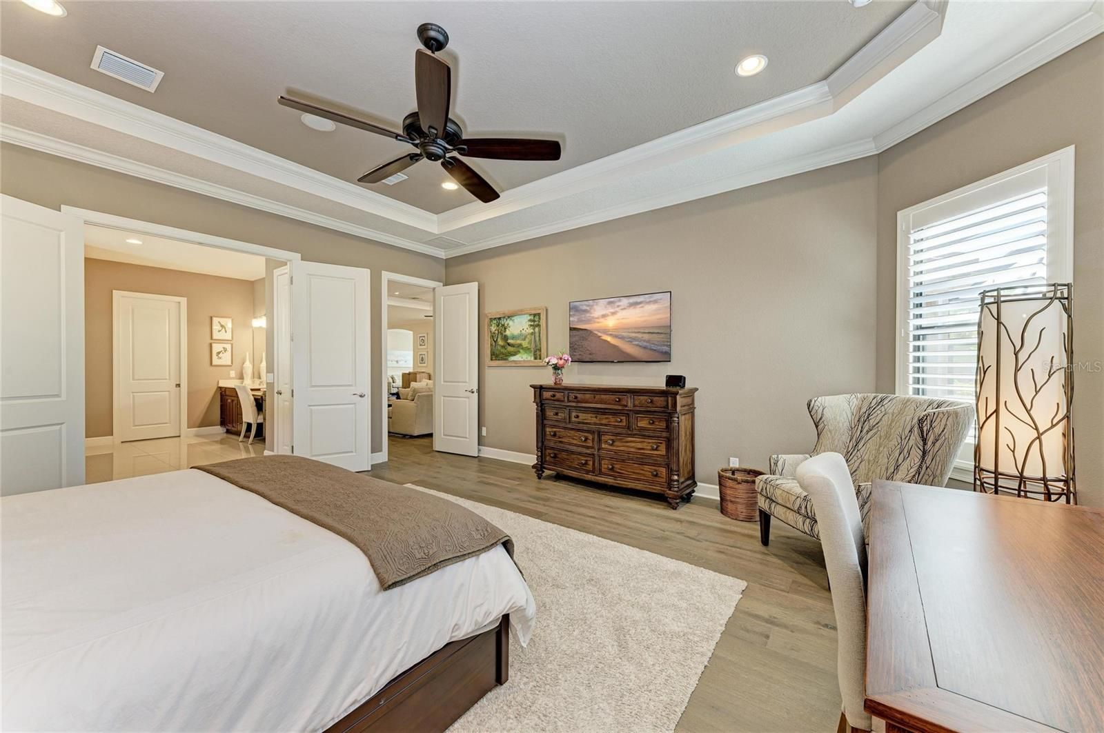 - Ceiling Fan(s), Crown Molding, Eat-in Kitchen, High Ceilings, Kitchen/Family Room Combo, Living/Dining Room, Open Floorplan, Main Level Primary, Solid-Wood Cabinets, Stone Counters, Thermostat, Tray Ceiling(s), Walk-In Closet(s), Window Treatments