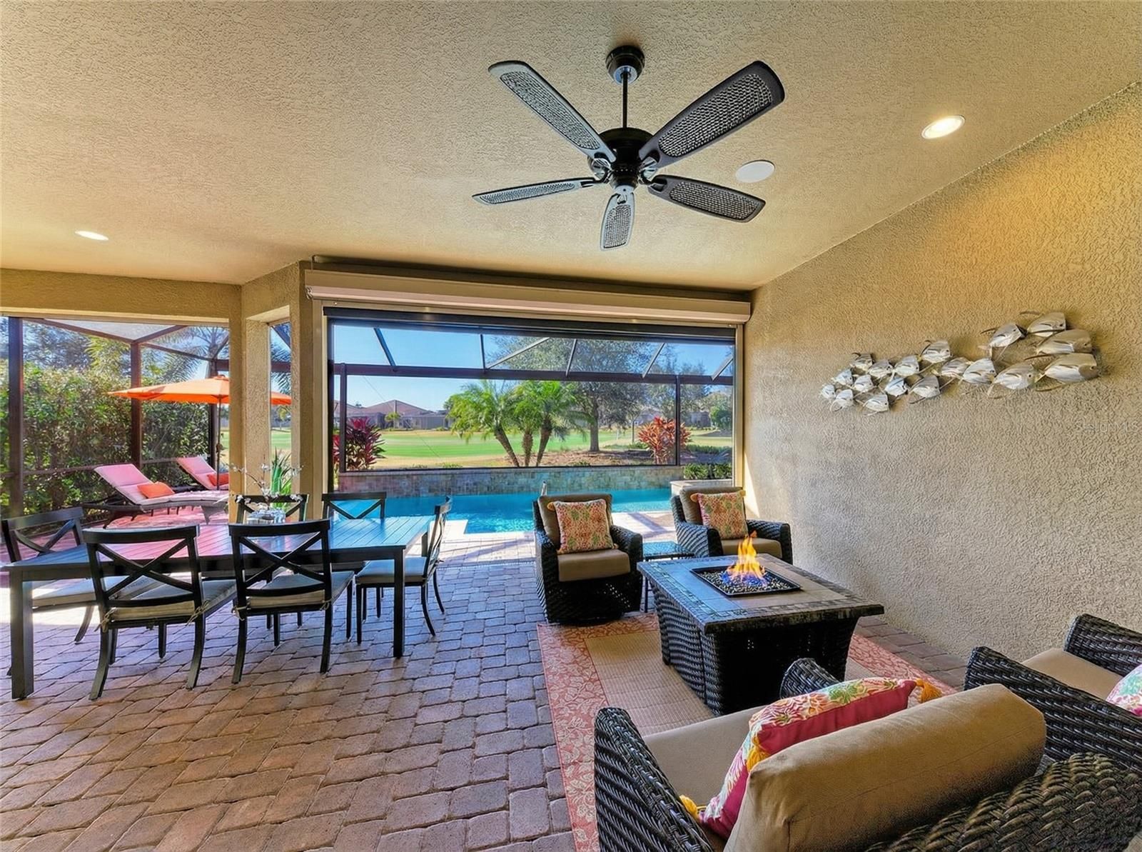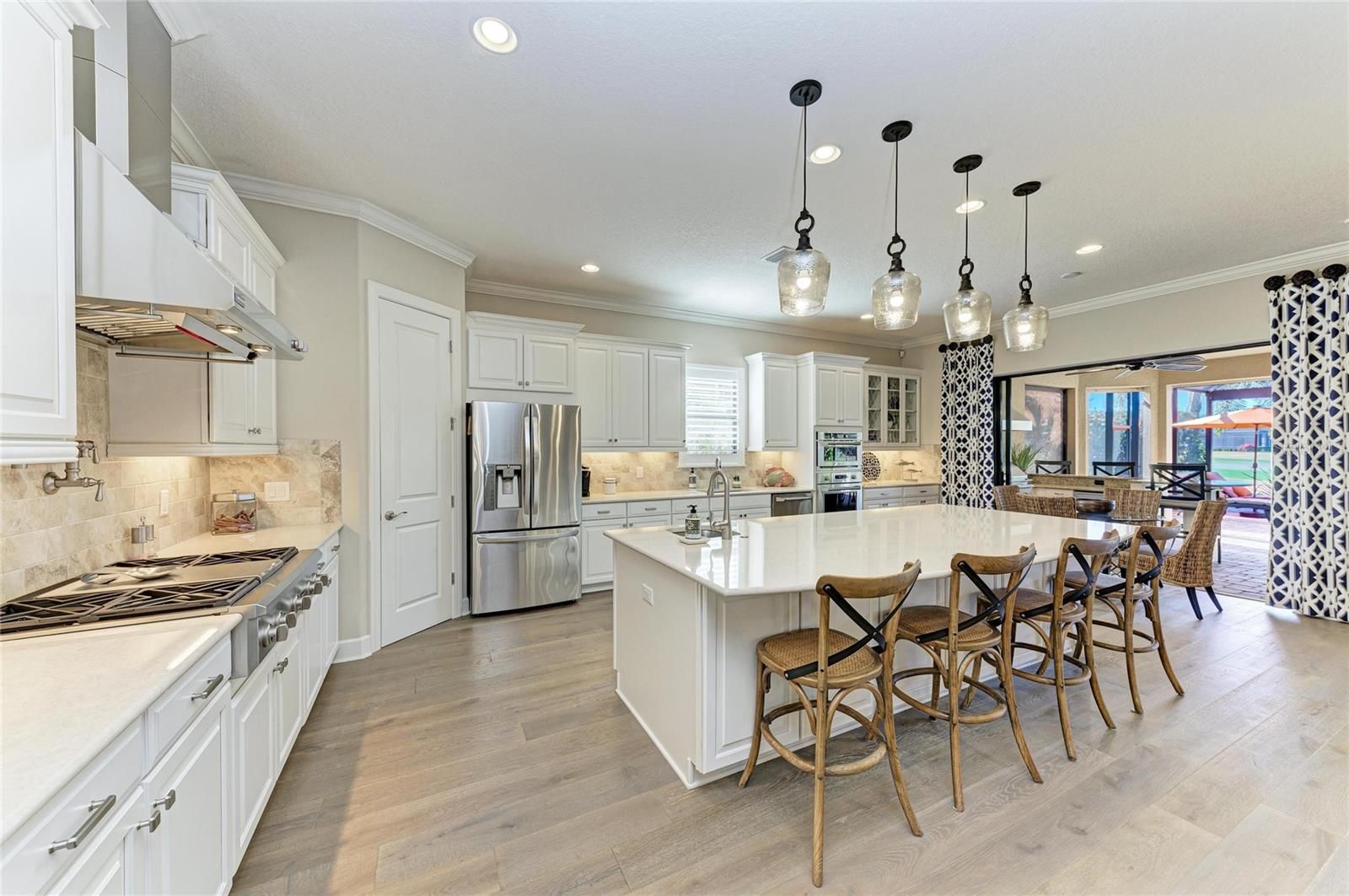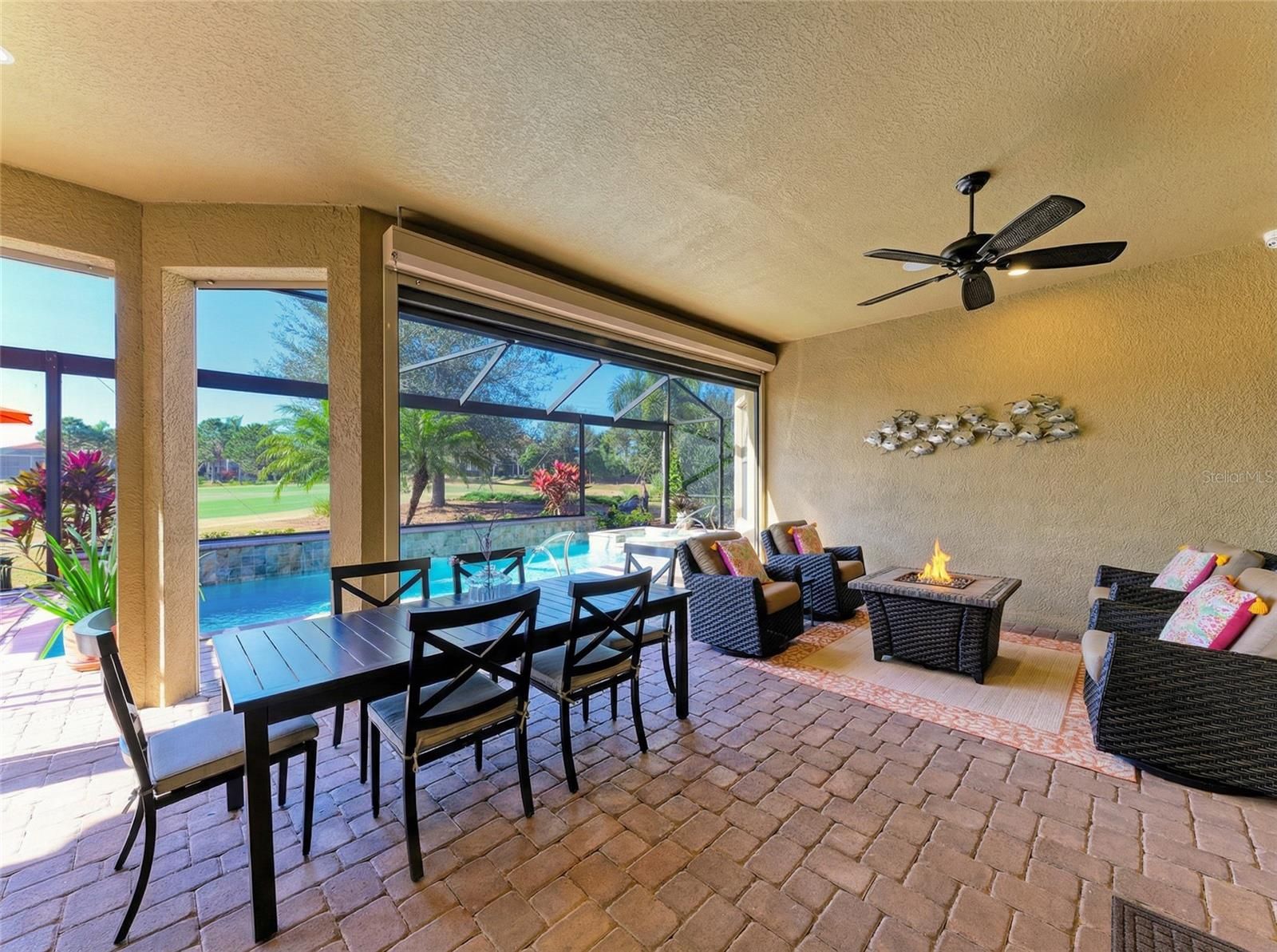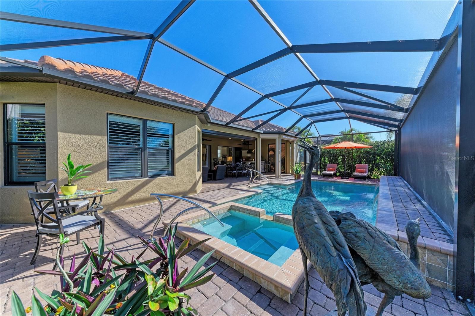 Experience resort-style living at its finest in the Highly sought after gated community of Esplanade at Lakewood Ranch. This beautifully upgraded Pallazio VII, is perfectly situated on a premium golf course view lot with sparkling heated saltwater pool & spa. Located on a quiet cul-de-sac street you will enjoy exceptional privacy with no homes directly across the street. This stunning property features a gated and paved courtyard entry. From the moment you arrive, the home impresses with decorative stacked stone accents, manicured landscaping, and elegant rustic double entry doors. Inside, a welcoming foyer opens to stunning wide-plank engineered hardwood flooring throughout the main living areas and study, with abundant natural light and a desirable open-concept design. At the heart of the home is the spacious gathering area, seamlessly connecting the living room, formal dining space, and an fabulous designer gourmet kitchen with upgraded breakfast nook extension. This chef’s kitchen is a true showpiece, featuring a massive center island with Quartz countertops, breakfast bar with pendant lighting, 42-inch upper cabinets with crown molding, under-cabinet lighting, soft close drawers, upgraded stainless steel appliances, gas cooktop with pot filler, stainless vent hood, built-in microwave and oven, wine refrigerator, and closet pantry. Designed for seamless indoor-outdoor living, double pocket sliders open from both the living area and kitchen to the extended lanai. The outdoor oasis features a summer kitchen & bar with built in grill, sink, and refrigerator, generous covered seating areas, and a panoramic screened lanai, offering plenty of room for outdoor dining and entertaining. Relax in the heated saltwater pool and spa while enjoying peaceful golf course views. The remote-controlled privacy screen provides protection from sun, cooler weather, and added seclusion when desired. The elegant primary suite offers a private retreat with tray ceilings and an optional bay window for added space. The spa-like primary bath includes dual sinks with makeup/vanity area in between, a frameless glass walk-in shower with rain showerhead, private water closet, and an oversized custom walk-in closet with built-ins and separate “his & hers” areas. This thoughtfully designed 3-way split floor plan provides two additional guest bedrooms for comfort and privacy—one with an en-suite bath (second master). The spacious office/den offers the perfect space to work from home or relax. Additional upgrades include hurricane-impact front windows, hurricane shutters and motorized screens in lanai, outdoor surveillance system with front and rear cameras, 4' garage extension with acrylic-sealed floor, upgraded Quartz countertops in the kitchen and all bathrooms, upgraded engineered hardwood flooring. The owners spared no expense in creating this exceptional home. Located in the gated and highly desirable Esplanade Golf & Country Club, residents enjoy world-class amenities including an 18-hole championship private golf course (full golf membership included with this home), Barrel House Bistro Bar/Restaurant, tennis, pickleball, bocce ball, spa and salon services, state-of-the-art fitness center, resort-style pools, cabanas, fire pits, and the popular Bahama Bar & Restaurant for casual poolside dining and handcrafted cocktails. Lawn care is fully maintained by the community association. This home shows like a model and delivers the Ultimate Florida lifestyle!