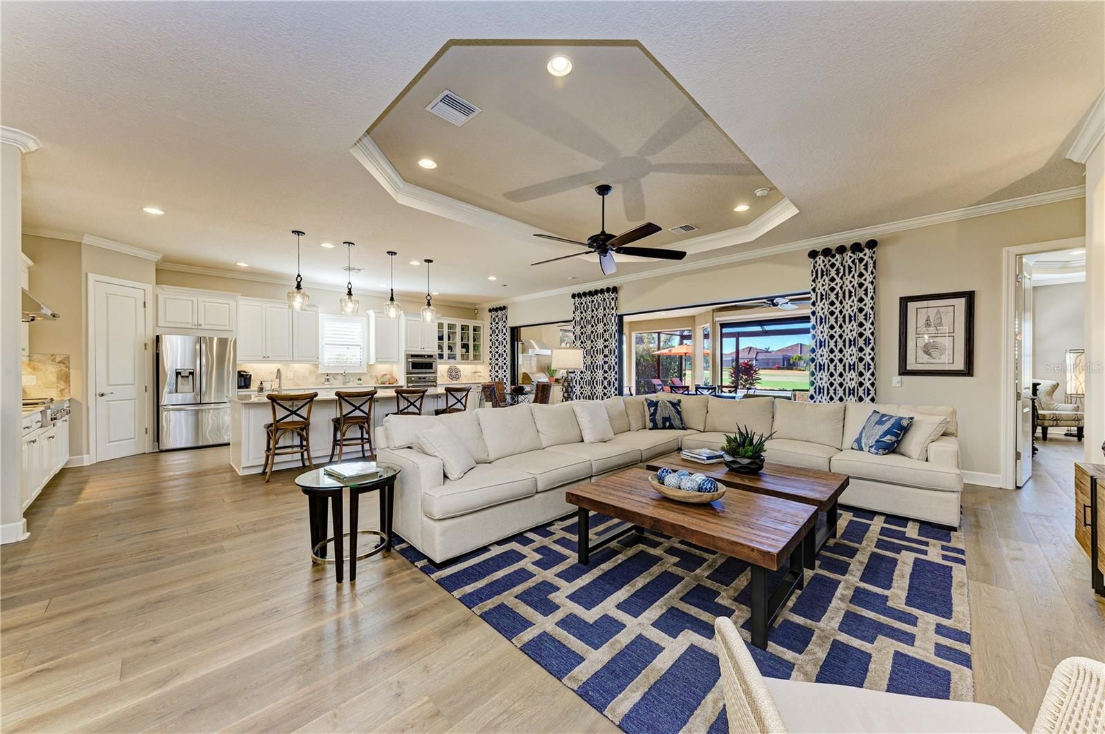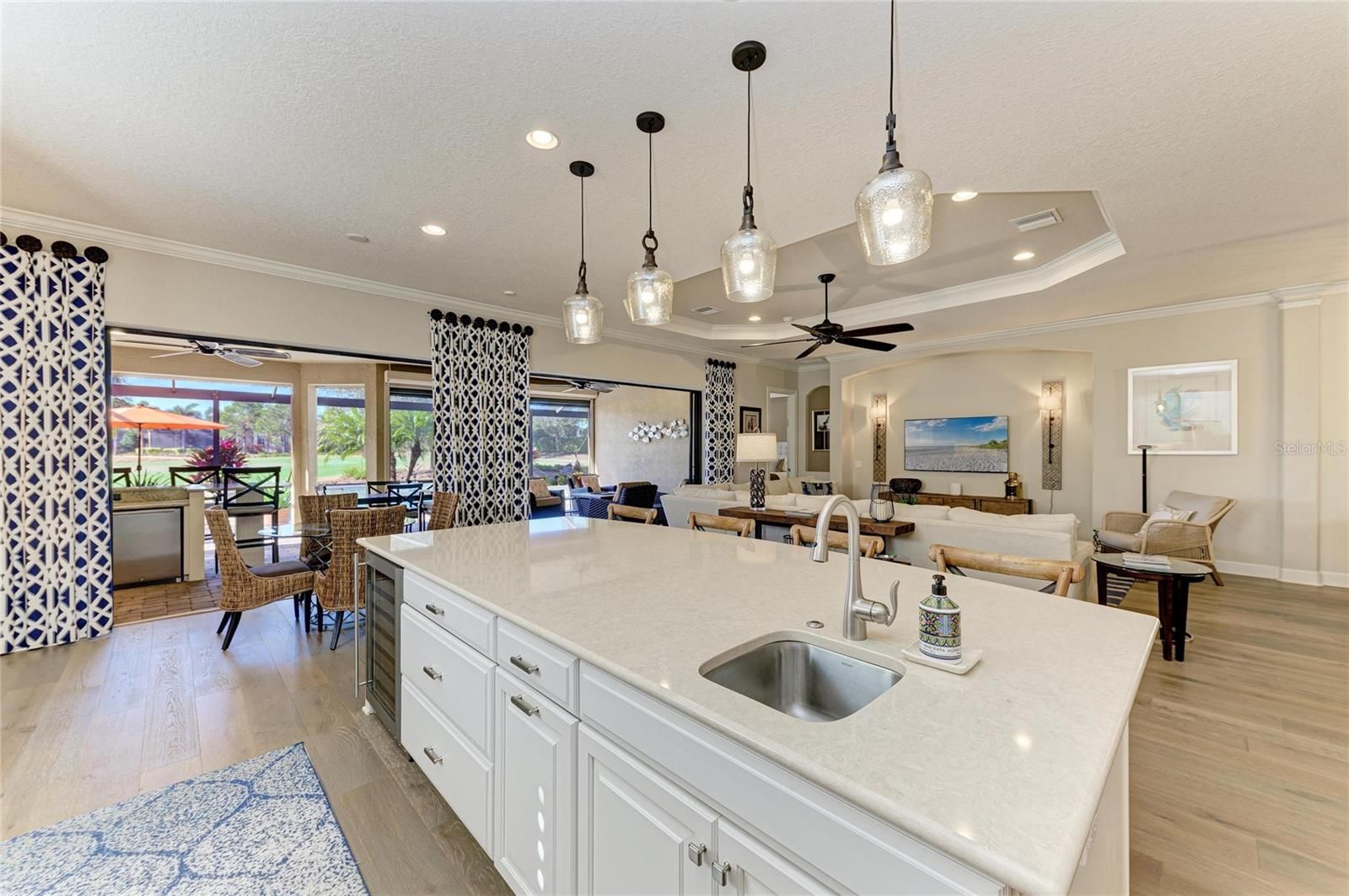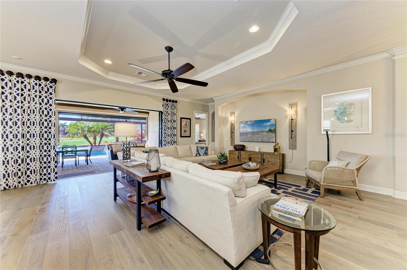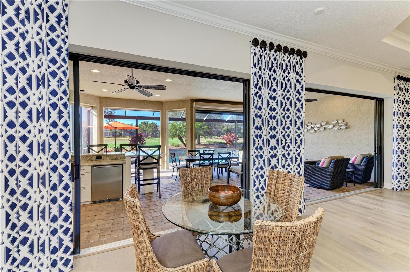 Experience resort-style living at its finest in the Highly sought after gated community of Esplanade at Lakewood Ranch. This beautifully upgraded Pallazio VII, is perfectly situated on a premium golf course view lot with sparkling heated saltwater pool & spa. Located on a quiet cul-de-sac street you will enjoy exceptional privacy with no homes directly across the street. This stunning property features a gated and paved courtyard entry. From the moment you arrive, the home impresses with decorative stacked stone accents, manicured landscaping, and elegant rustic double entry doors. Inside, a welcoming foyer opens to stunning wide-plank engineered hardwood flooring throughout the main living areas and study, with abundant natural light and a desirable open-concept design. At the heart of the home is the spacious gathering area, seamlessly connecting the living room, formal dining space, and an fabulous designer gourmet kitchen with upgraded breakfast nook extension. This chef’s kitchen is a true showpiece, featuring a massive center island with Quartz countertops, breakfast bar with pendant lighting, 42-inch upper cabinets with crown molding, under-cabinet lighting, soft close drawers, upgraded stainless steel appliances, gas cooktop with pot filler, stainless vent hood, built-in microwave and oven, wine refrigerator, and closet pantry. Designed for seamless indoor-outdoor living, double pocket sliders open from both the living area and kitchen to the extended lanai. The outdoor oasis features a summer kitchen & bar with built in grill, sink, and refrigerator, generous covered seating areas, and a panoramic screened lanai, offering plenty of room for outdoor dining and entertaining. Relax in the heated saltwater pool and spa while enjoying peaceful golf course views. The remote-controlled privacy screen provides protection from sun, cooler weather, and added seclusion when desired. The elegant primary suite offers a private retreat with tray ceilings and an optional bay window for added space. The spa-like primary bath includes dual sinks with makeup/vanity area in between, a frameless glass walk-in shower with rain showerhead, private water closet, and an oversized custom walk-in closet with built-ins and separate “his & hers” areas. This thoughtfully designed 3-way split floor plan provides two additional guest bedrooms for comfort and privacy—one with an en-suite bath (second master). The spacious office/den offers the perfect space to work from home or relax. Additional upgrades include hurricane-impact front windows, hurricane shutters and motorized screens in lanai, outdoor surveillance system with front and rear cameras, 4' garage extension with acrylic-sealed floor, upgraded Quartz countertops in the kitchen and all bathrooms, upgraded engineered hardwood flooring. The owners spared no expense in creating this exceptional home. Located in the gated and highly desirable Esplanade Golf & Country Club, residents enjoy world-class amenities including an 18-hole championship private golf course (full golf membership included with this home), Barrel House Bistro Bar/Restaurant, tennis, pickleball, bocce ball, spa and salon services, state-of-the-art fitness center, resort-style pools, cabanas, fire pits, and the popular Bahama Bar & Restaurant for casual poolside dining and handcrafted cocktails. Lawn care is fully maintained by the community association. This home shows like a model and delivers the Ultimate Florida lifestyle!