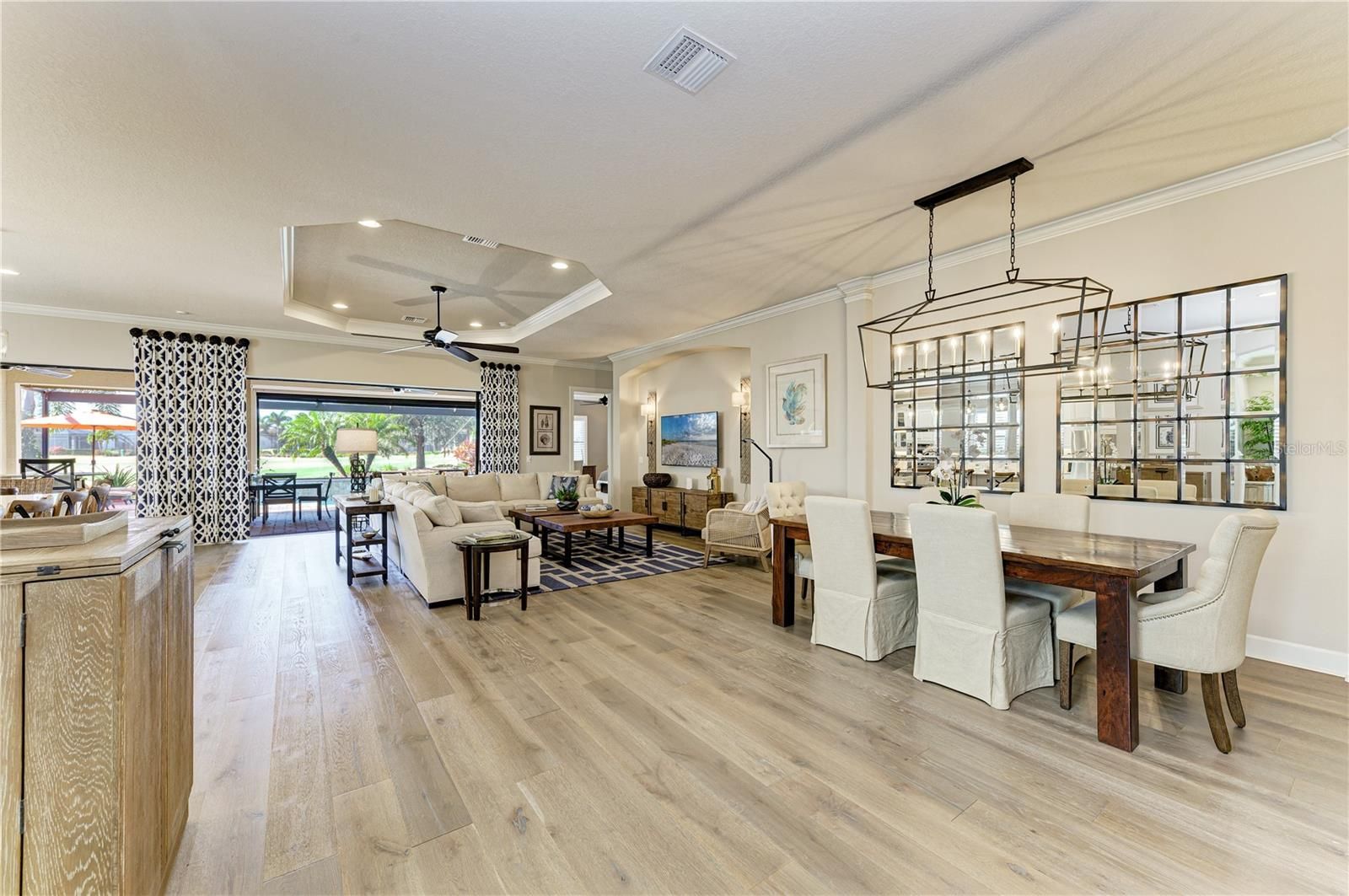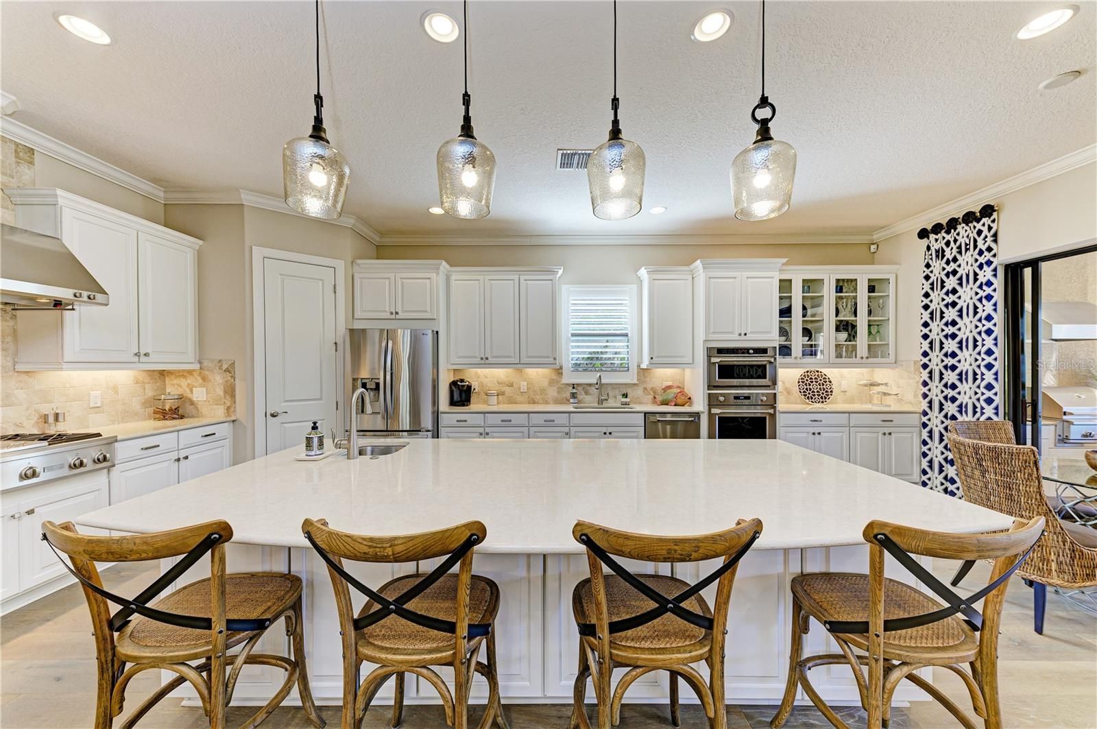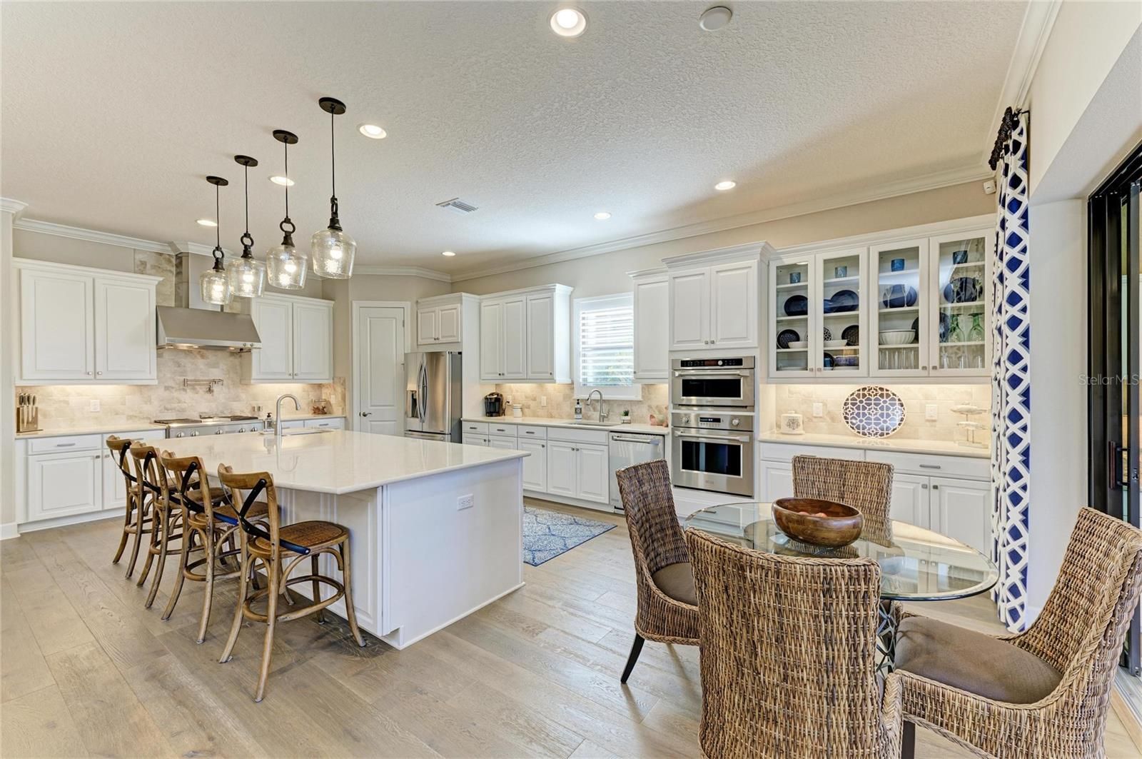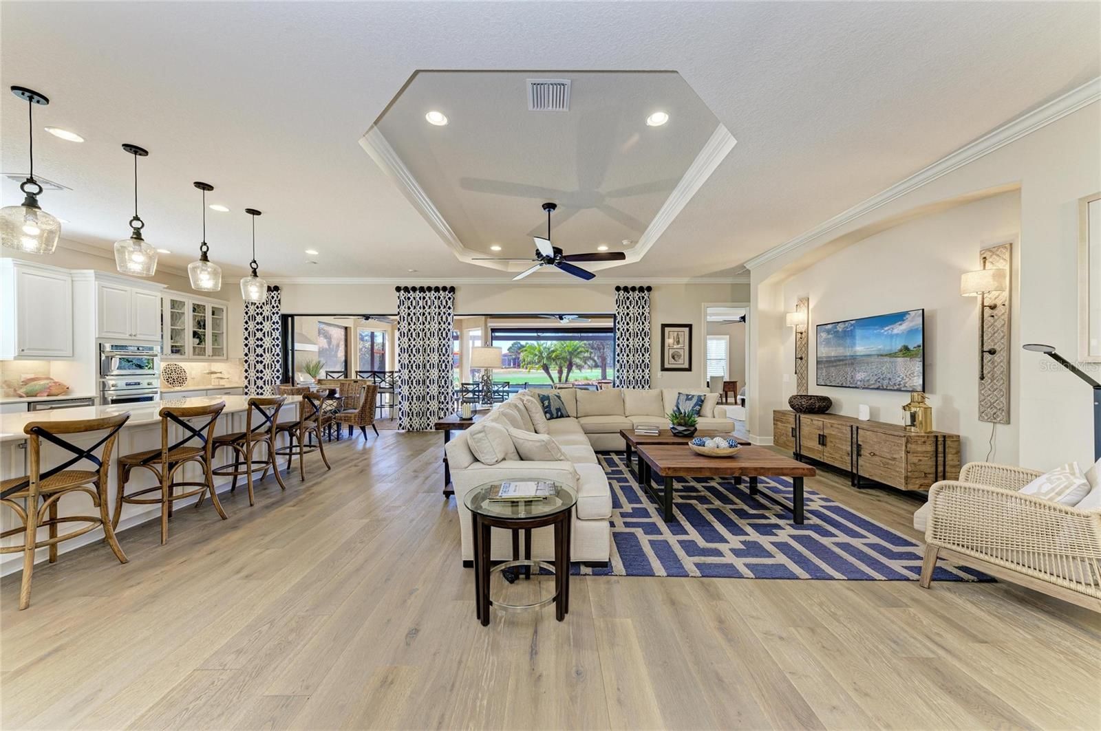 Experience resort-style living at its finest in the Highly sought after gated community of Esplanade at Lakewood Ranch. This beautifully upgraded Pallazio VII, is perfectly situated on a premium golf course view lot with sparkling heated saltwater pool & spa. Located on a quiet cul-de-sac street you will enjoy exceptional privacy with no homes directly across the street. This stunning property features a gated and paved courtyard entry. From the moment you arrive, the home impresses with decorative stacked stone accents, manicured landscaping, and elegant rustic double entry doors. Inside, a welcoming foyer opens to stunning wide-plank engineered hardwood flooring throughout the main living areas and study, with abundant natural light and a desirable open-concept design. At the heart of the home is the spacious gathering area, seamlessly connecting the living room, formal dining space, and an fabulous designer gourmet kitchen with upgraded breakfast nook extension. This chef’s kitchen is a true showpiece, featuring a massive center island with Quartz countertops, breakfast bar with pendant lighting, 42-inch upper cabinets with crown molding, under-cabinet lighting, soft close drawers, upgraded stainless steel appliances, gas cooktop with pot filler, stainless vent hood, built-in microwave and oven, wine refrigerator, and closet pantry. Designed for seamless indoor-outdoor living, double pocket sliders open from both the living area and kitchen to the extended lanai. The outdoor oasis features a summer kitchen & bar with built in grill, sink, and refrigerator, generous covered seating areas, and a panoramic screened lanai, offering plenty of room for outdoor dining and entertaining. Relax in the heated saltwater pool and spa while enjoying peaceful golf course views. The remote-controlled privacy screen provides protection from sun, cooler weather, and added seclusion when desired. The elegant primary suite offers a private retreat with tray ceilings and an optional bay window for added space. The spa-like primary bath includes dual sinks with makeup/vanity area in between, a frameless glass walk-in shower with rain showerhead, private water closet, and an oversized custom walk-in closet with built-ins and separate “his & hers” areas. This thoughtfully designed 3-way split floor plan provides two additional guest bedrooms for comfort and privacy—one with an en-suite bath (second master). The spacious office/den offers the perfect space to work from home or relax. Additional upgrades include hurricane-impact front windows, hurricane shutters and motorized screens in lanai, outdoor surveillance system with front and rear cameras, 4' garage extension with acrylic-sealed floor, upgraded Quartz countertops in the kitchen and all bathrooms, upgraded engineered hardwood flooring. The owners spared no expense in creating this exceptional home. Located in the gated and highly desirable Esplanade Golf & Country Club, residents enjoy world-class amenities including an 18-hole championship private golf course (full golf membership included with this home), Barrel House Bistro Bar/Restaurant, tennis, pickleball, bocce ball, spa and salon services, state-of-the-art fitness center, resort-style pools, cabanas, fire pits, and the popular Bahama Bar & Restaurant for casual poolside dining and handcrafted cocktails. Lawn care is fully maintained by the community association. This home shows like a model and delivers the Ultimate Florida lifestyle!