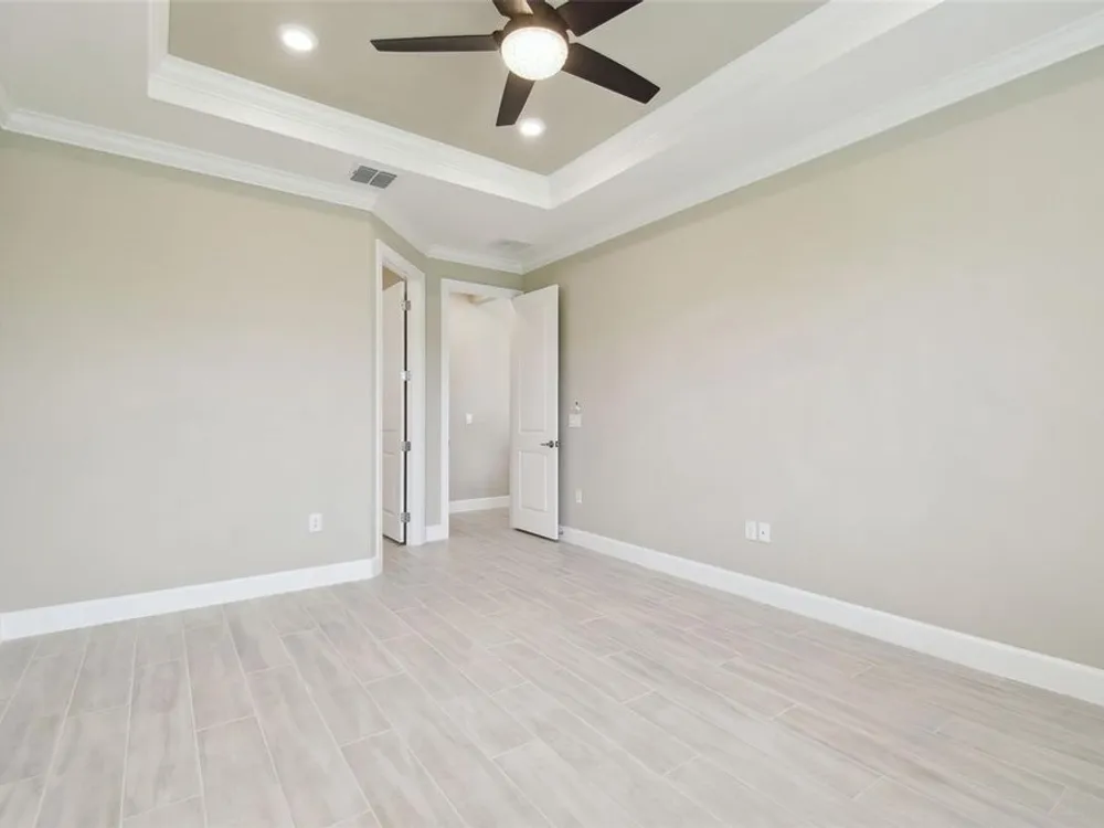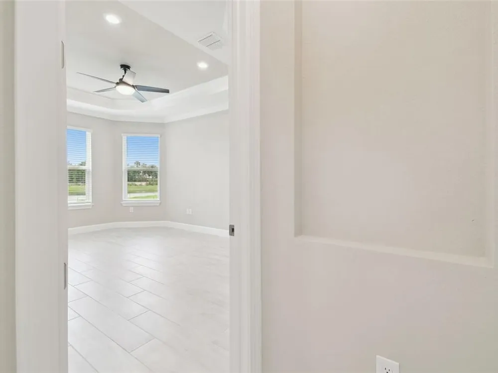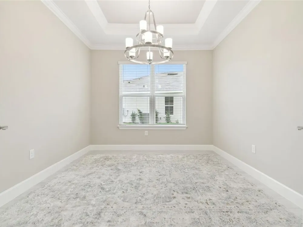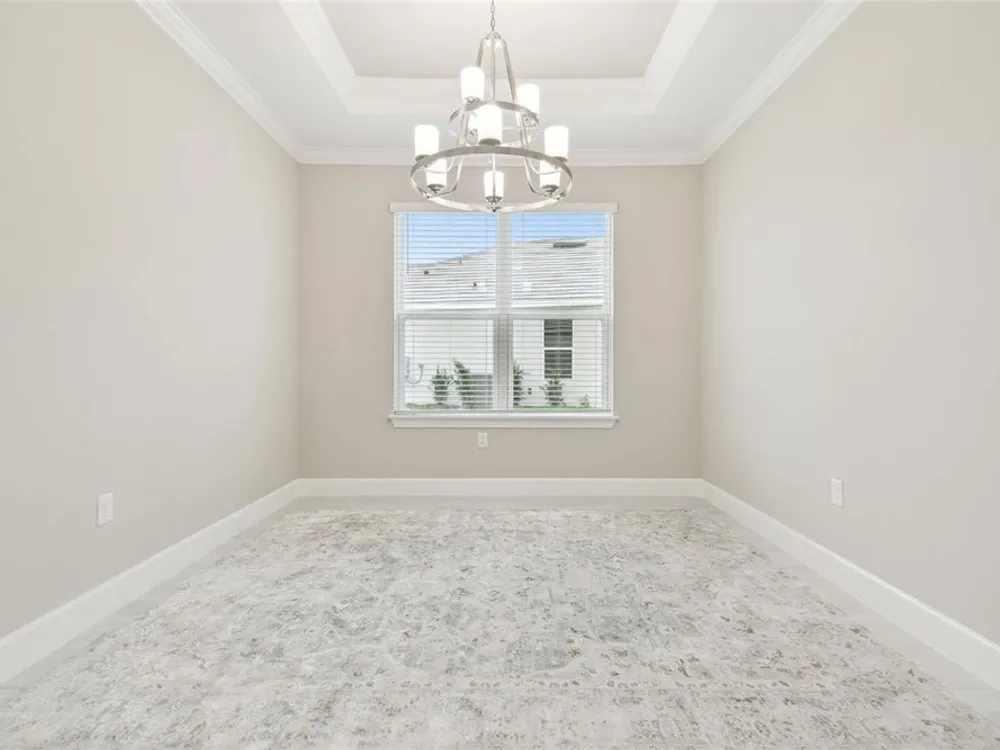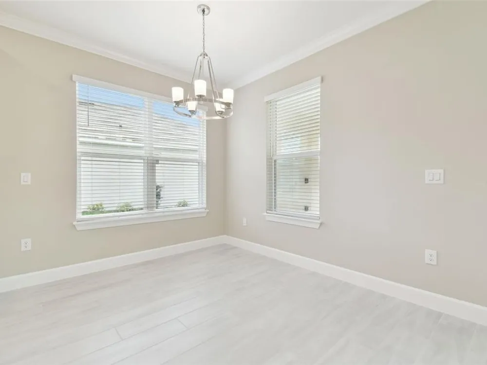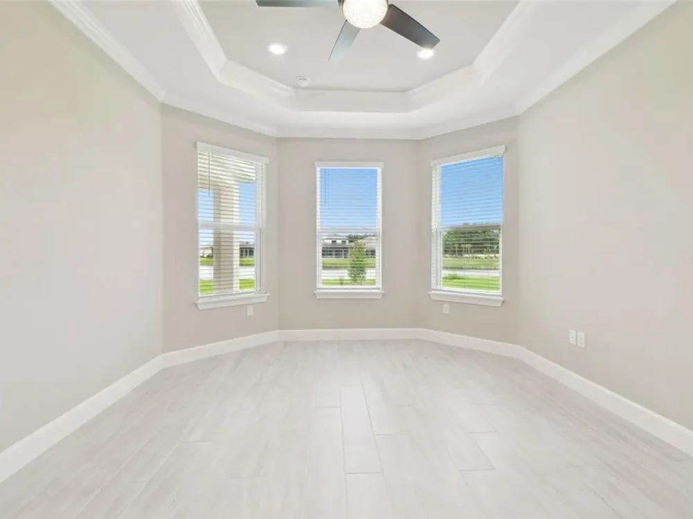- Crown Molding, Eat-in Kitchen, High Ceilings, Kitchen/Family Room Combo, Open Floorplan, Main Level Primary, Solid Surface Counters, Solid-Wood Cabinets, Split Bedrooms, Thermostat, Tray Ceiling(s), Walk-In Closet(s), Window Treatments