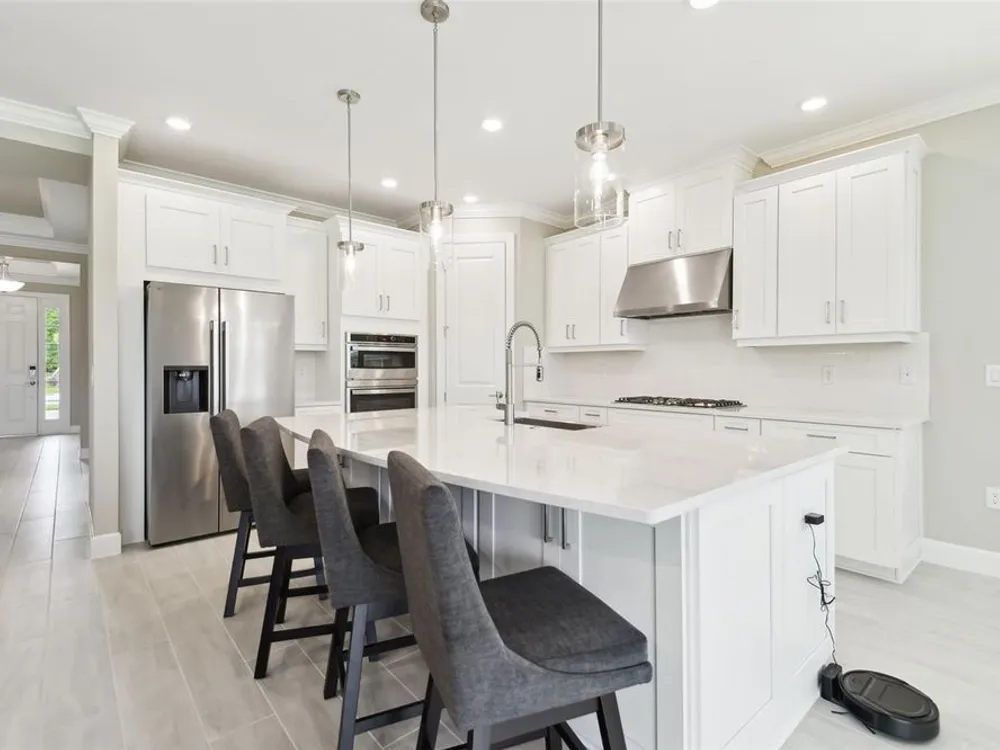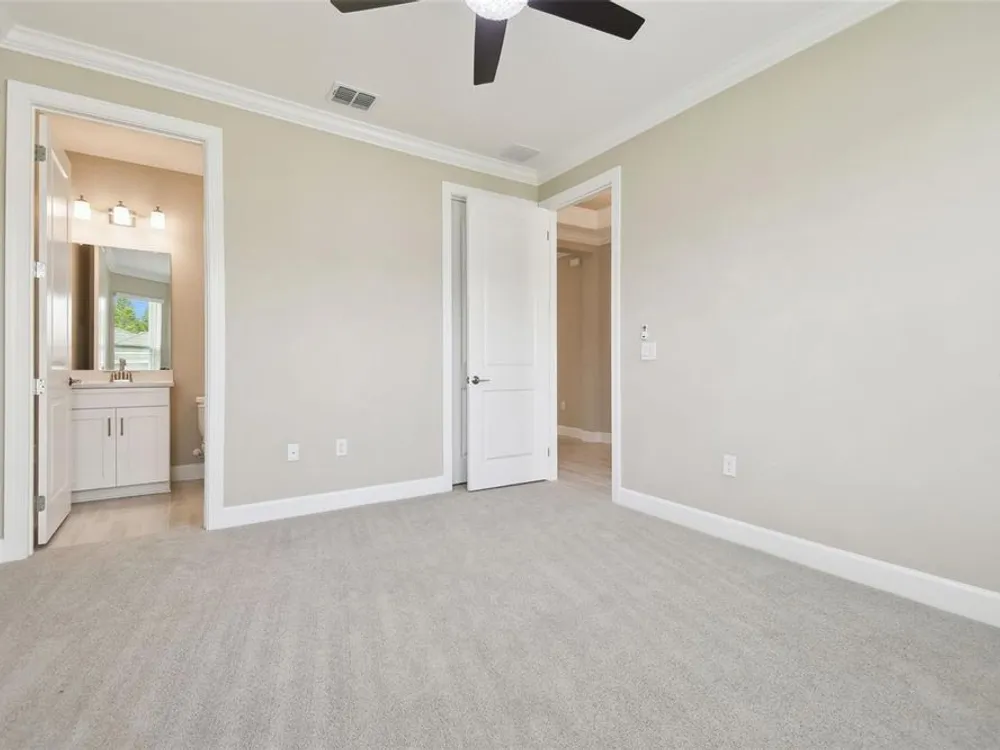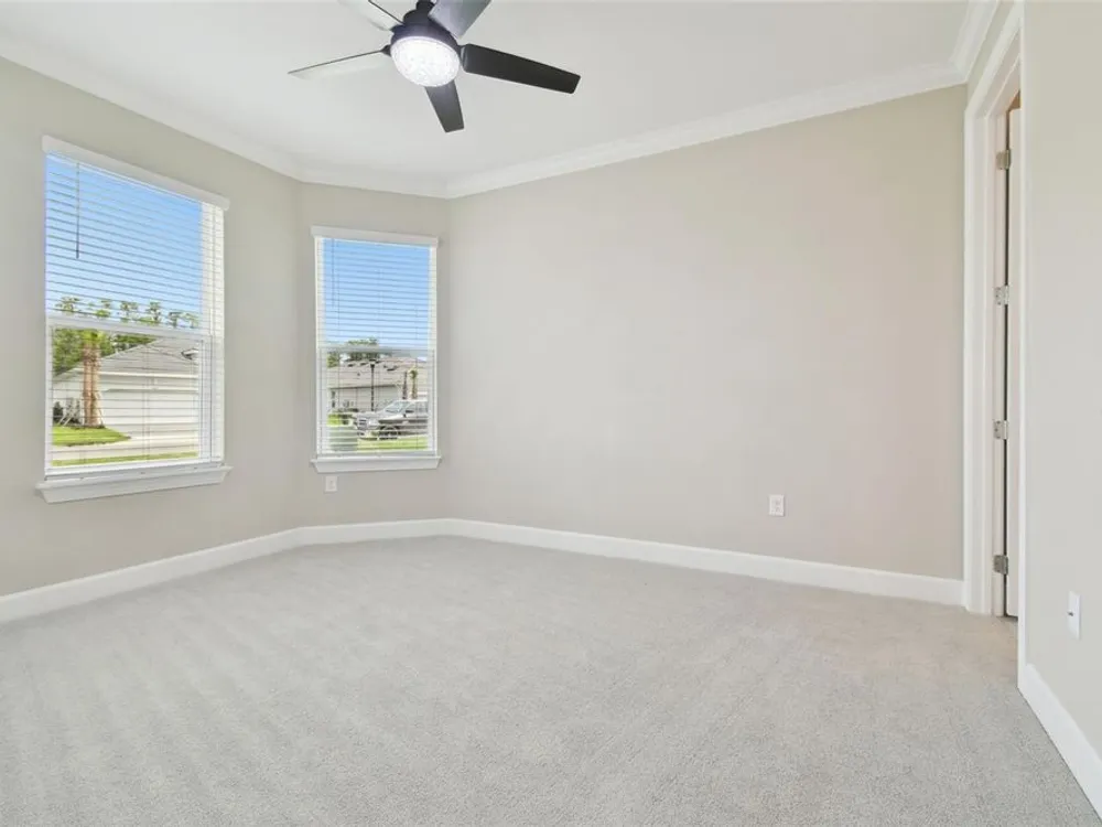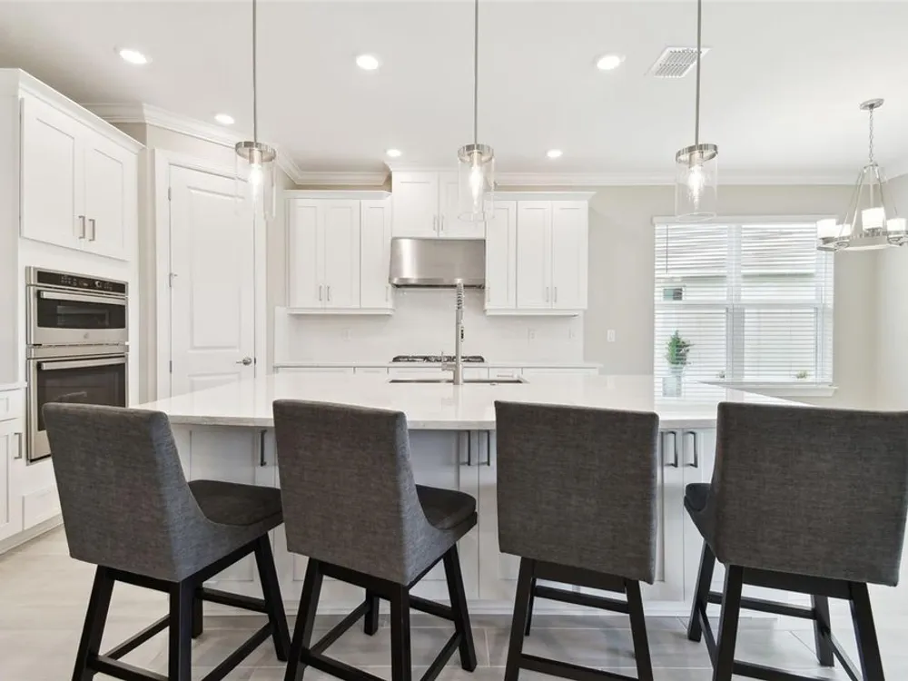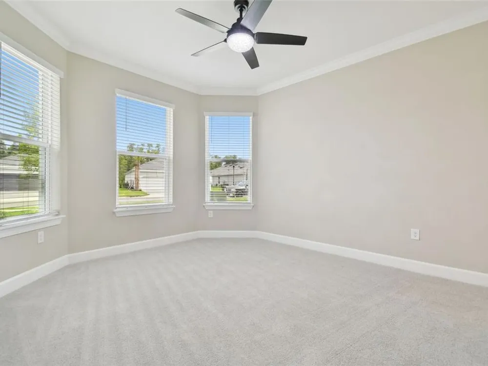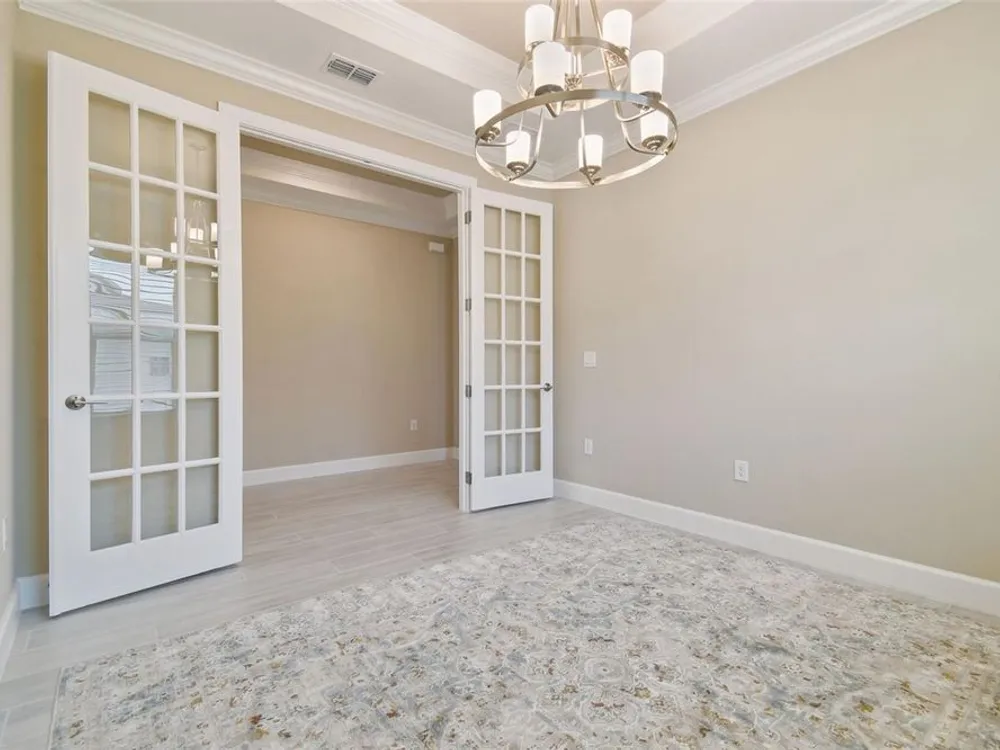- Crown Molding, Eat-in Kitchen, High Ceilings, Kitchen/Family Room Combo, Open Floorplan, Main Level Primary, Solid Surface Counters, Solid-Wood Cabinets, Split Bedrooms, Thermostat, Tray Ceiling(s), Walk-In Closet(s), Window Treatments