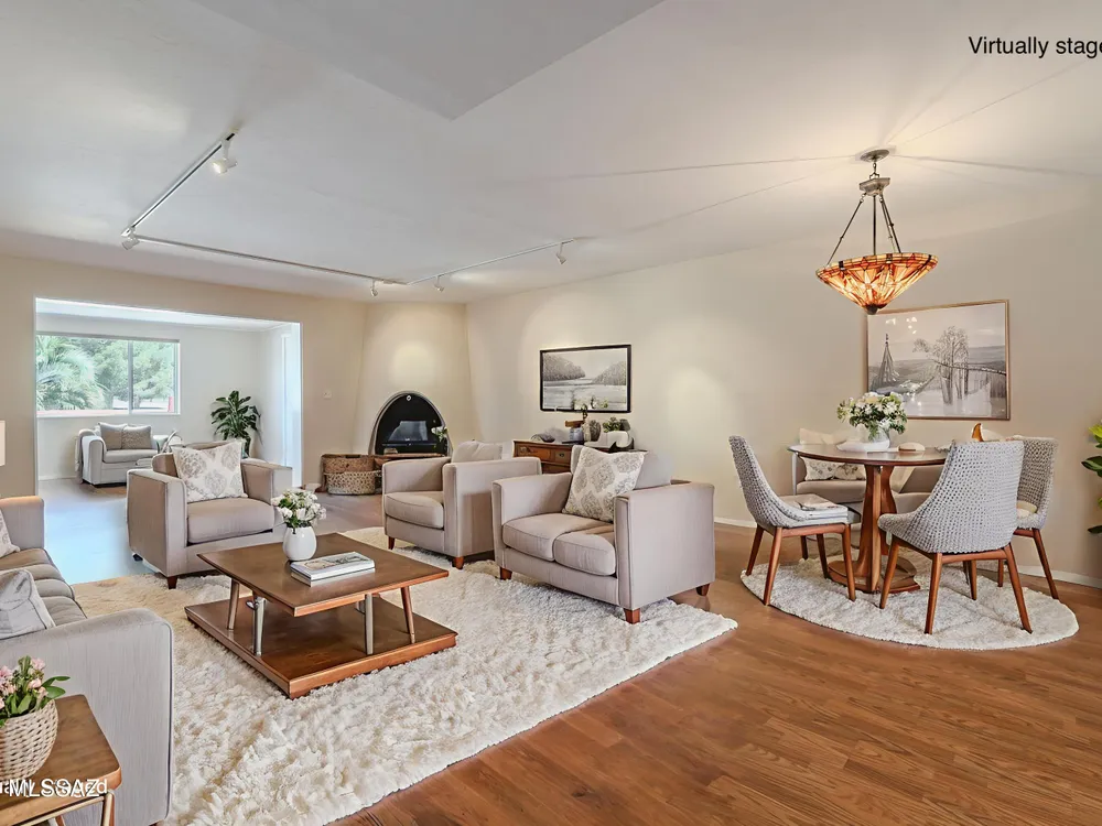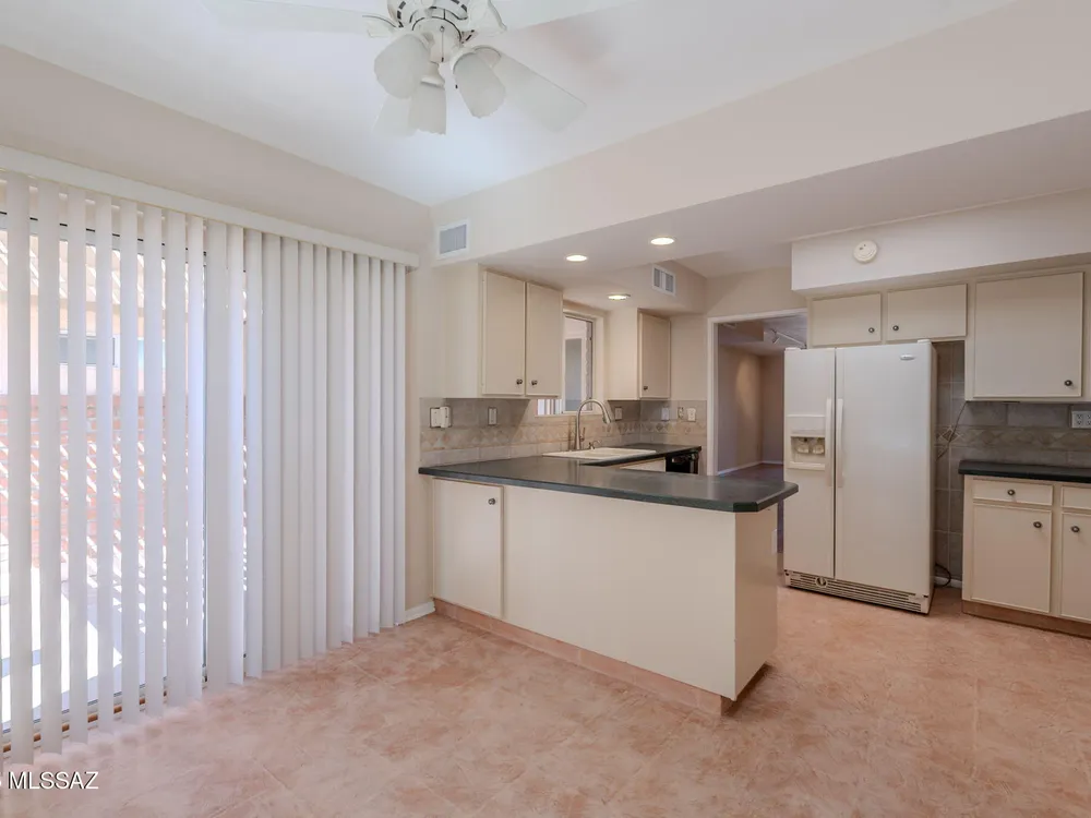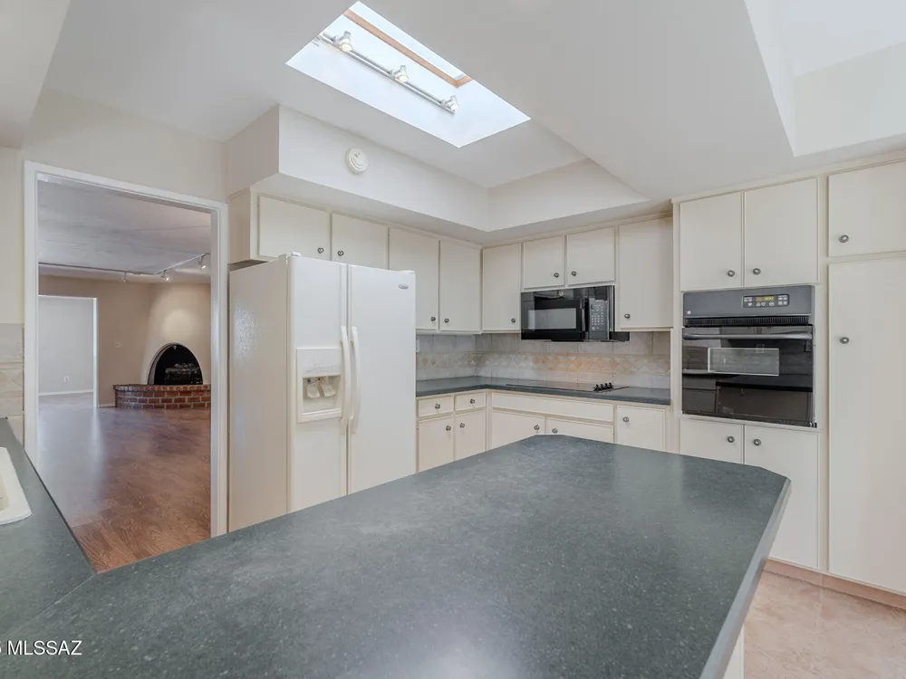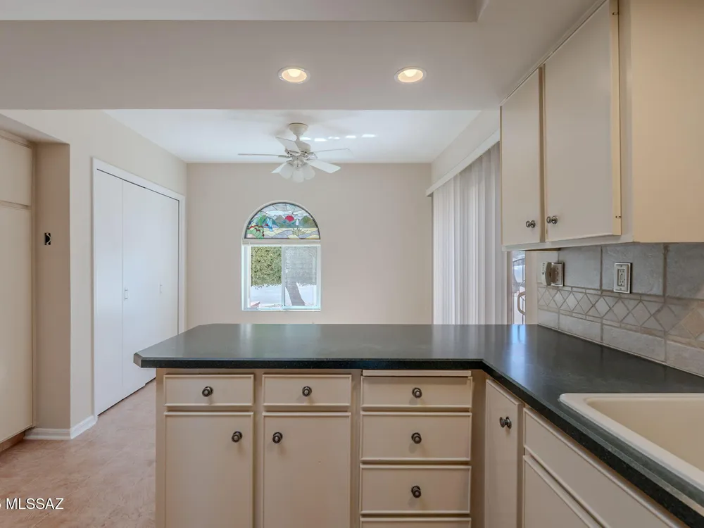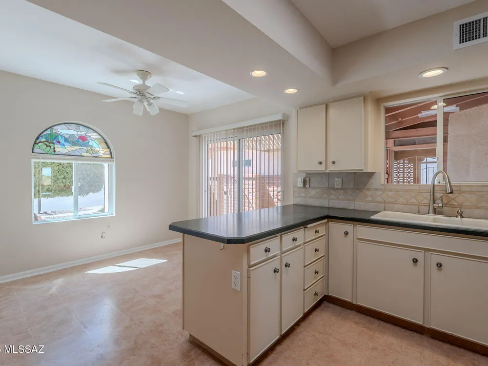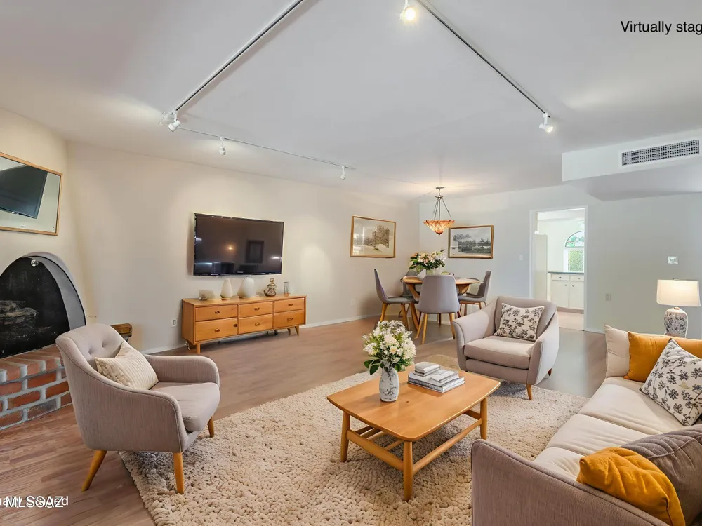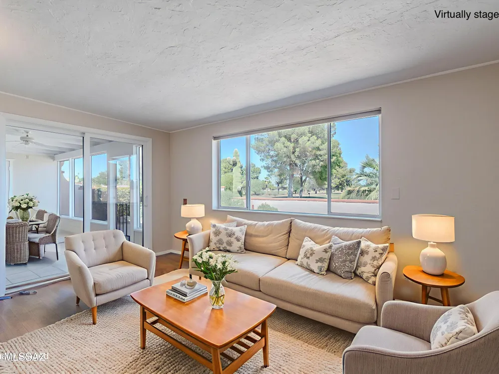 Fairway charm with mountain magic--made for easy days and cozy nights.Level with Haven Golf Course, this sweet mix of brick, stucco, and siding lives like classic Arizona: Santa Rita Mountain views out front, green fairways out back, and everyday life flowing between an enclosed AZ room and a screened patio where quail wander by. Inside, fresh interior paint throughout and laminate floors in the main areas keep things light and low-maintenance, while bedroom carpet (professionally cleaned) softens the quiet hours. A beehive gas fireplace anchors the living room--game night, holiday photos, or just a cup of tea when the desert cools.The kitchen keeps mornings cheerful and practical--tiled backsplash, a sunny breakfast nook, a new skylight, and a smart concrete