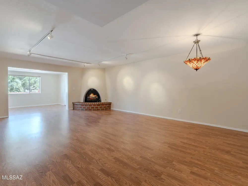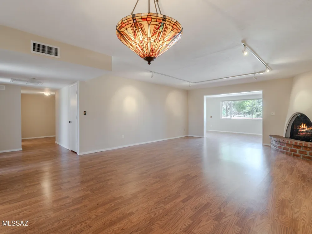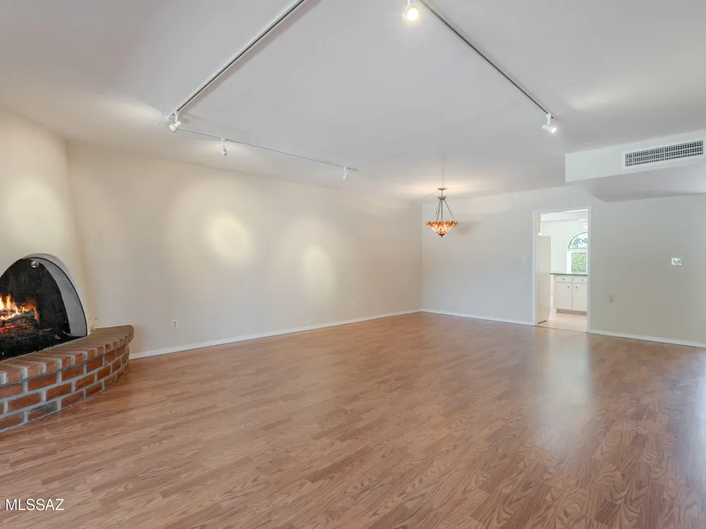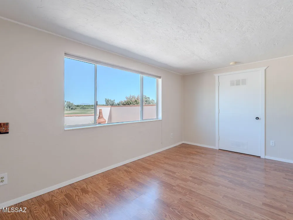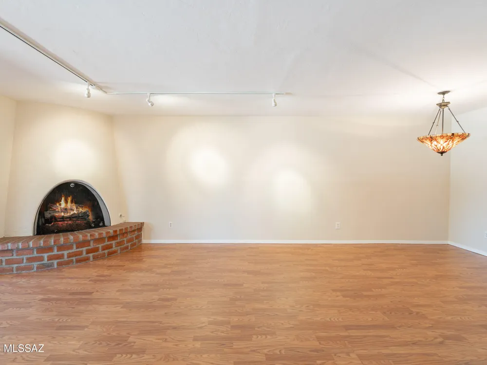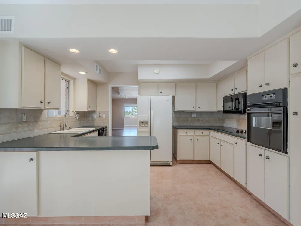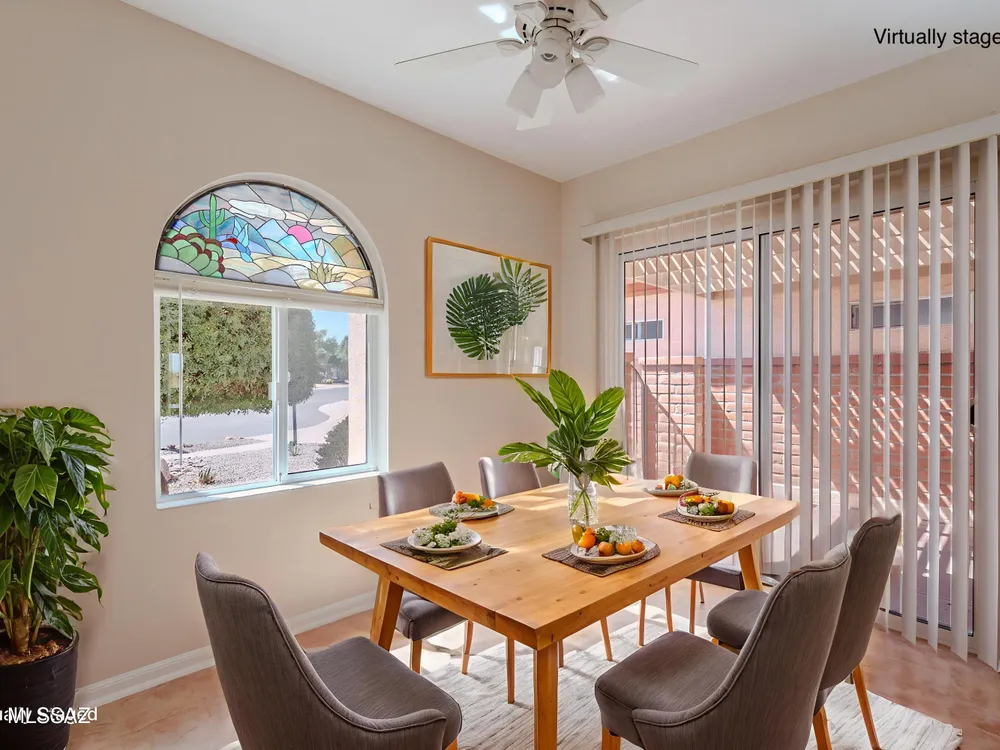 Fairway charm with mountain magic--made for easy days and cozy nights.Level with Haven Golf Course, this sweet mix of brick, stucco, and siding lives like classic Arizona: Santa Rita Mountain views out front, green fairways out back, and everyday life flowing between an enclosed AZ room and a screened patio where quail wander by. Inside, fresh interior paint throughout and laminate floors in the main areas keep things light and low-maintenance, while bedroom carpet (professionally cleaned) softens the quiet hours. A beehive gas fireplace anchors the living room--game night, holiday photos, or just a cup of tea when the desert cools.The kitchen keeps mornings cheerful and practical--tiled backsplash, a sunny breakfast nook, a new skylight, and a smart concrete
