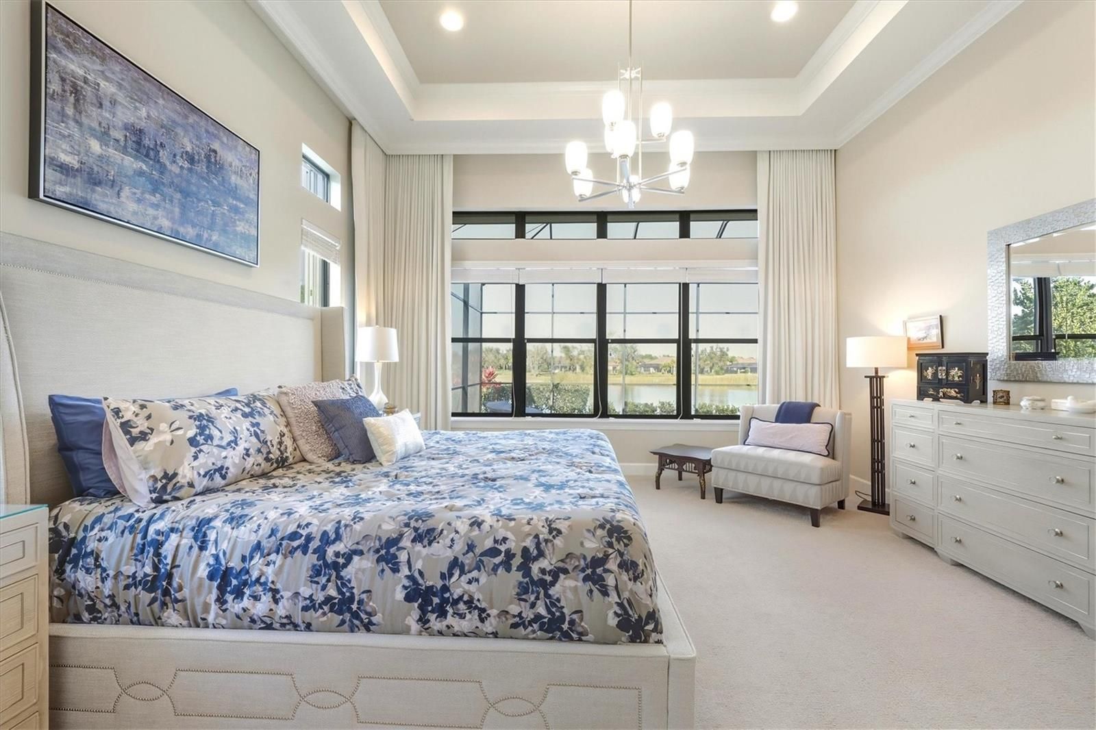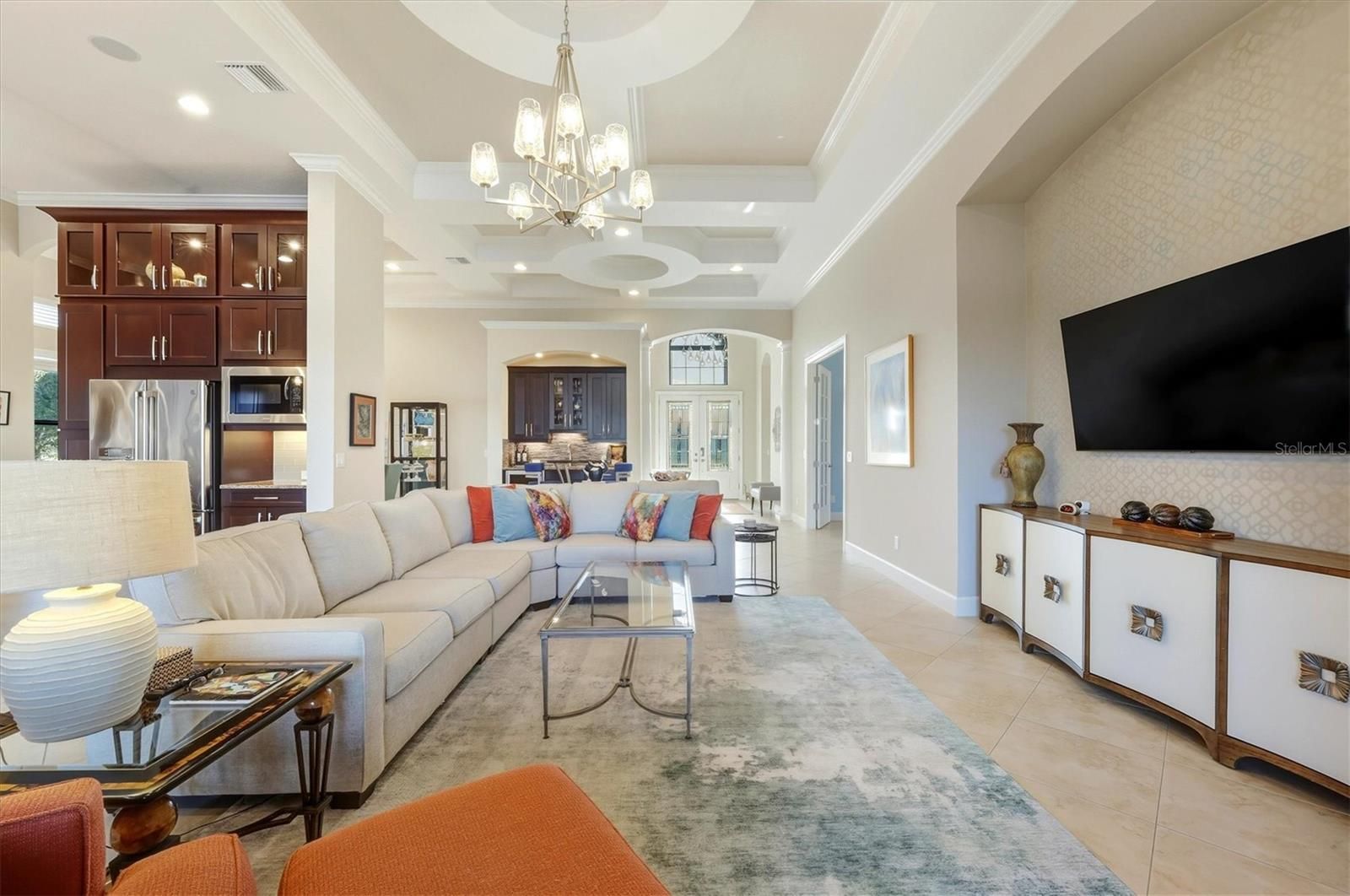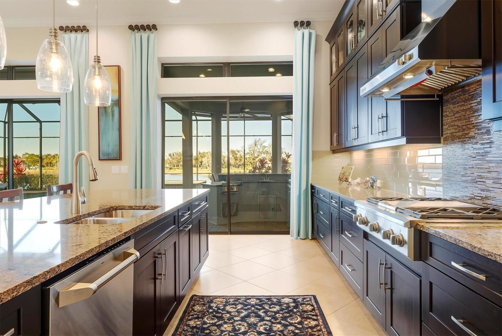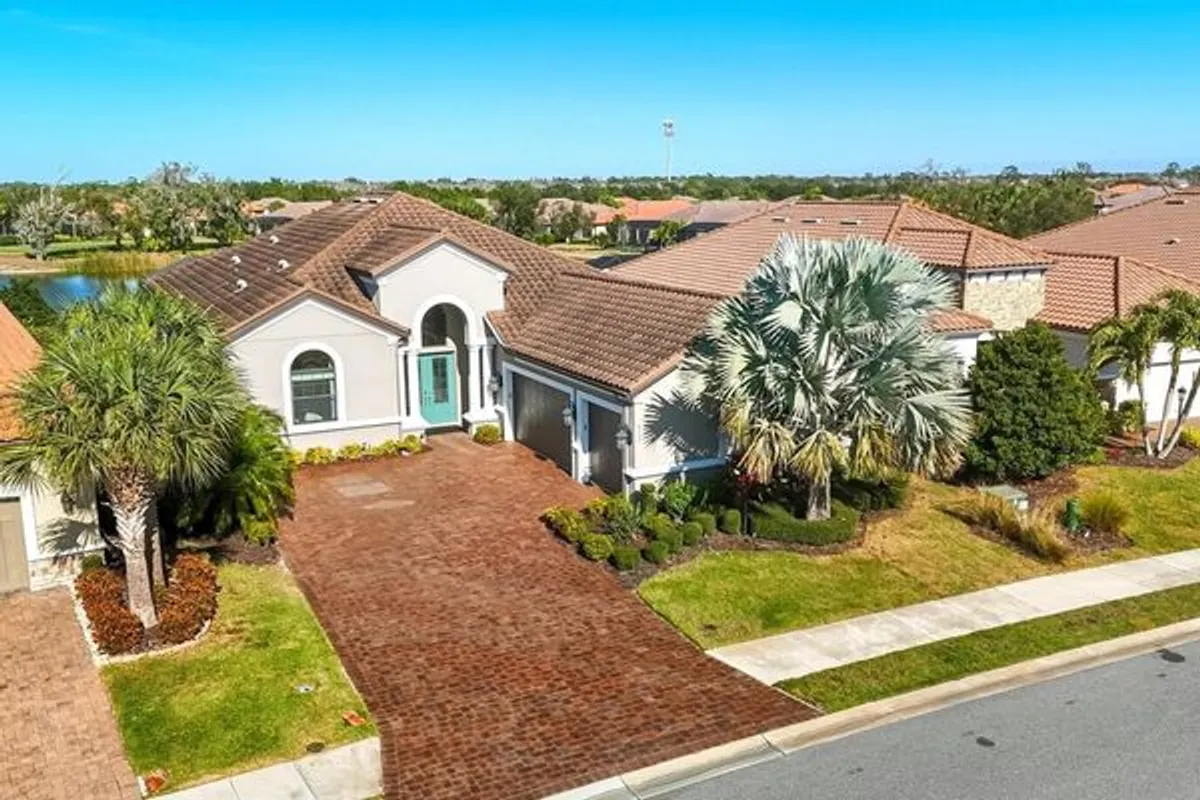 Wake up to tranquil pond views and the rare privacy every golfer appreciates—no cart path behind the home, just water, nature, and morning light. Located in Esplanade at Lakewood Ranch, this golf-deeded residence includes full golf privileges and delivers a true resort lifestyle where luxury meets everyday ease. Inside, refined architectural details immediately stand out. Crown molding throughout, spectacular coffered ceilings, and abundant recessed lighting create a sophisticated yet inviting atmosphere. A dedicated den/office with French doors provides the perfect space for working from home, a private study, or a quiet retreat. Designed for entertaining, the home features a wet bar with a wine cooler and a chef-inspired kitchen showcasing Monogram appliances, 42" cabinetry with glass uppers, and Sonos speakers both inside and outside on the lanai. The primary suite is a peaceful sanctuary complete with floor to ceiling custom blackout drapes and custom built-in closet systems. While the secondary bedrooms offer comfort for guests, the murphy bed allows the owner the flexibility to also use the third bedroom for crafts or exercise. Outdoor living truly shines on the private lanai—recently re-screened in November 2024—and fully equipped with remote rolldown hurricane screens, a full summer kitchen with extra power burner, and a heated pool and spa, creating a year-round space for relaxation and entertaining. Additional highlights include accordion shutters on the home's sides, pre-plumbing for a water softener and a three-car garage with a built-in storage rack system. Beyond the home, Esplanade’s resort-style amenities elevate everyday living with championship golf, an onsite restaurant, tennis and pickleball, and an active social lifestyle. Perfectly positioned, this home is just minutes to UTC Mall, SRQ International Airport, and the world-renowned beaches of Anna Maria Island, Longboat Key, and Siesta Key, with Tampa an easy drive away. This is more than a home—it’s the opportunity to enjoy golf, luxury, and location in one of Lakewood Ranch’s most sought-after communities.