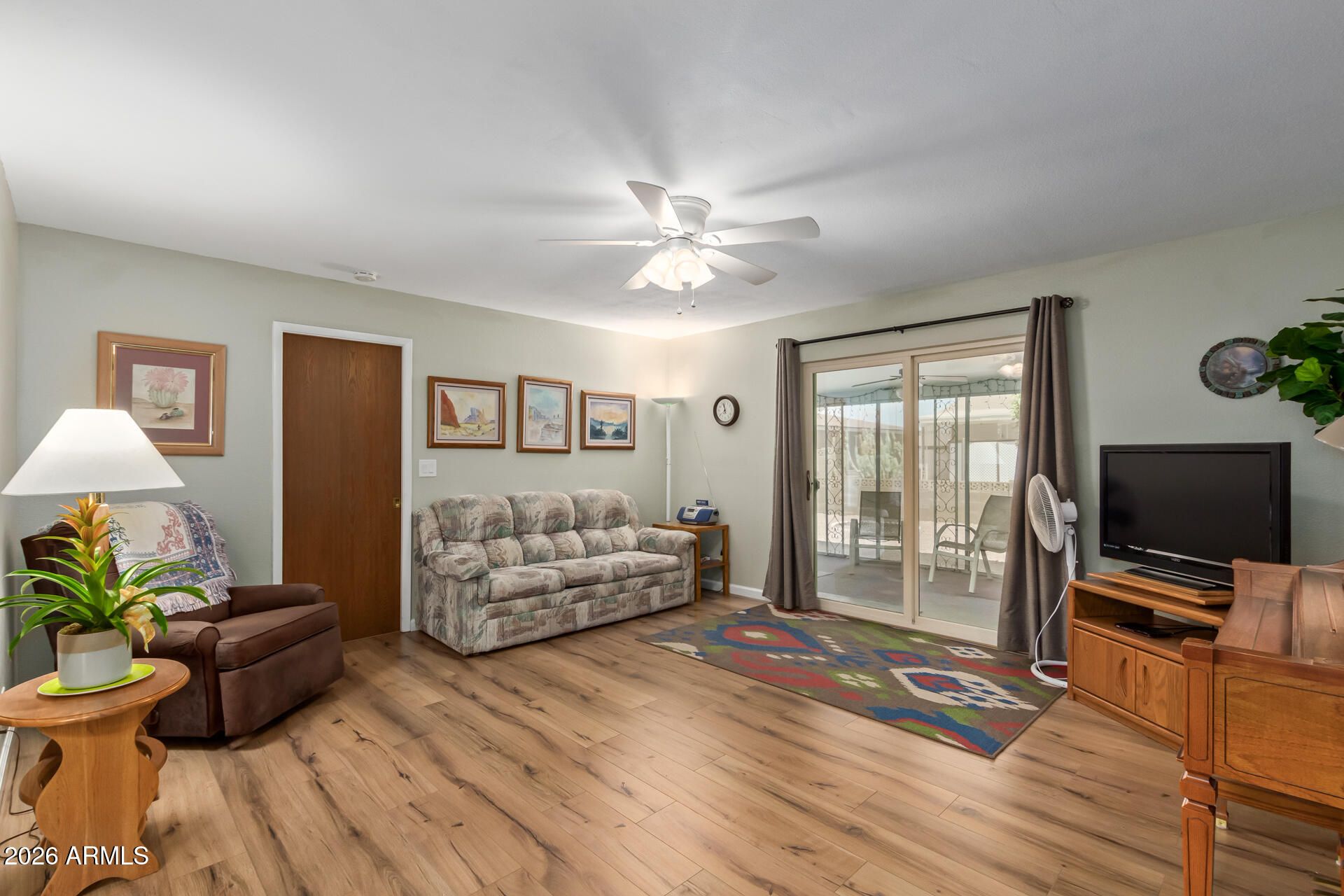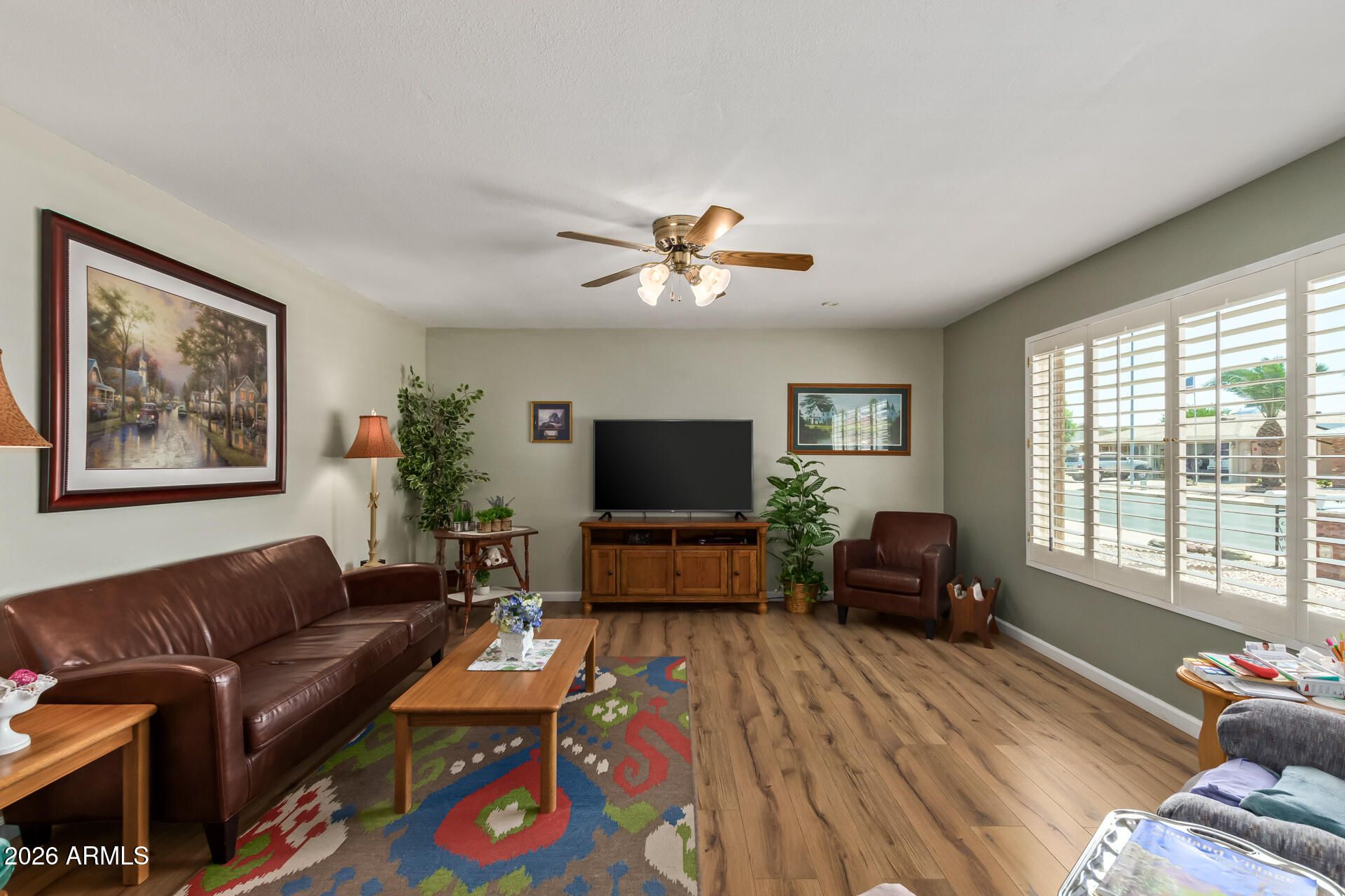 PREPARE TO BE IMPRESSED by a beautifully manicured lot, brick accented exterior and an UPDATED PRIDE OF OWNERSHIP interior at this VERY SPACIOUS ''800 model'' home. Sellers have loved the ''large dining room for family holiday gatherings and the wonderful neighbors.'' Professionally updated kitchen with Quartz counters and LED lighting. ARIZONA ROOM, Plantation shutters, beautiful wood grain plank flooring, multiple skylights for natural light and 6 pocket doors! NO popcorn ceilings here and a 2022 full exterior paint, NEW VINYL WINDOWS and doors. FREE FRESH FRUIT from your own Orange, Grapefruit, Tangelo and Lemon trees. OWNED Solar for phenomenal utility efficiency! 55+ community living at its finest with 7 pools, 2 hot tubs, pickle ball, tennis, unlimited activities and so much more...