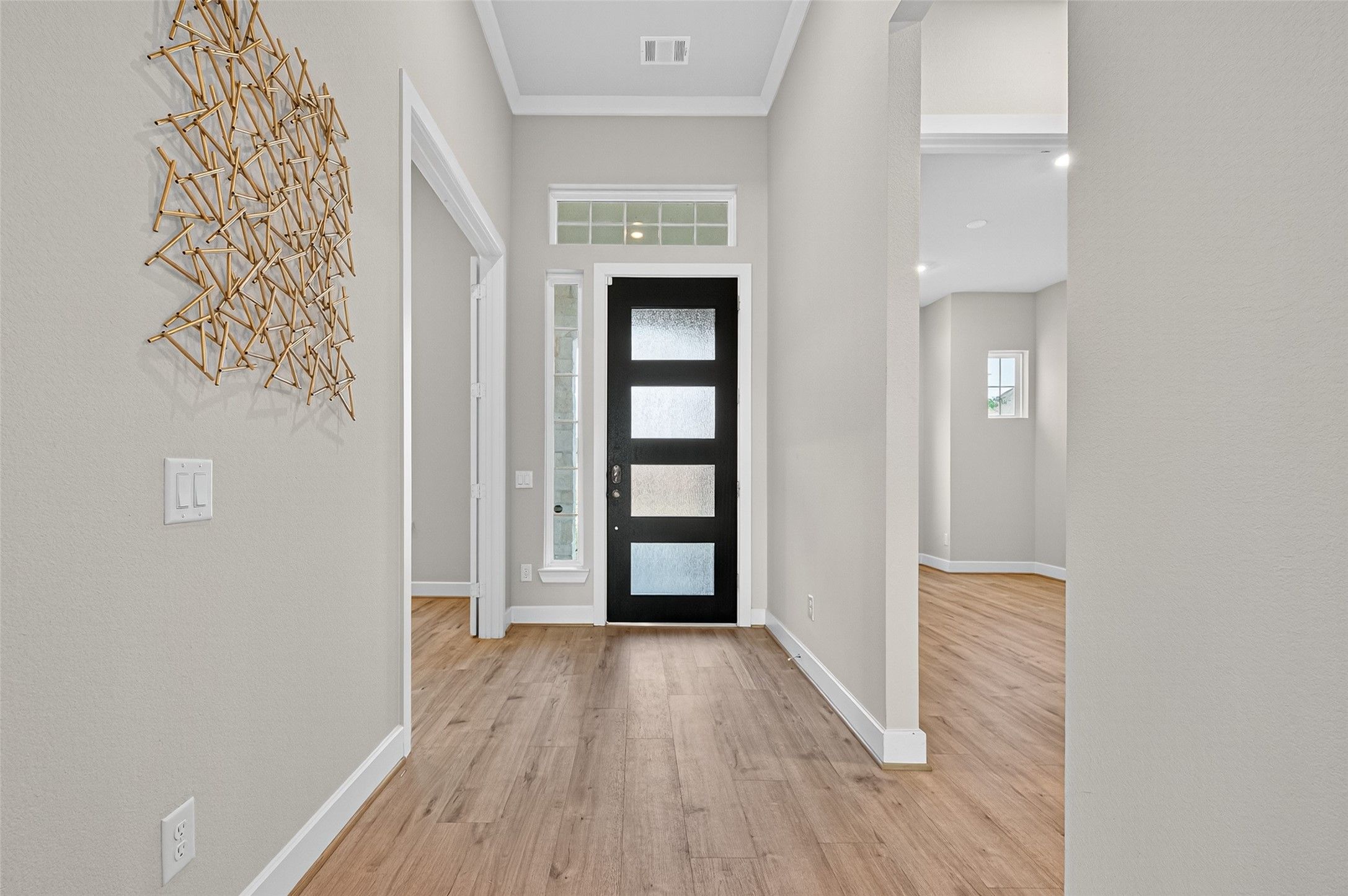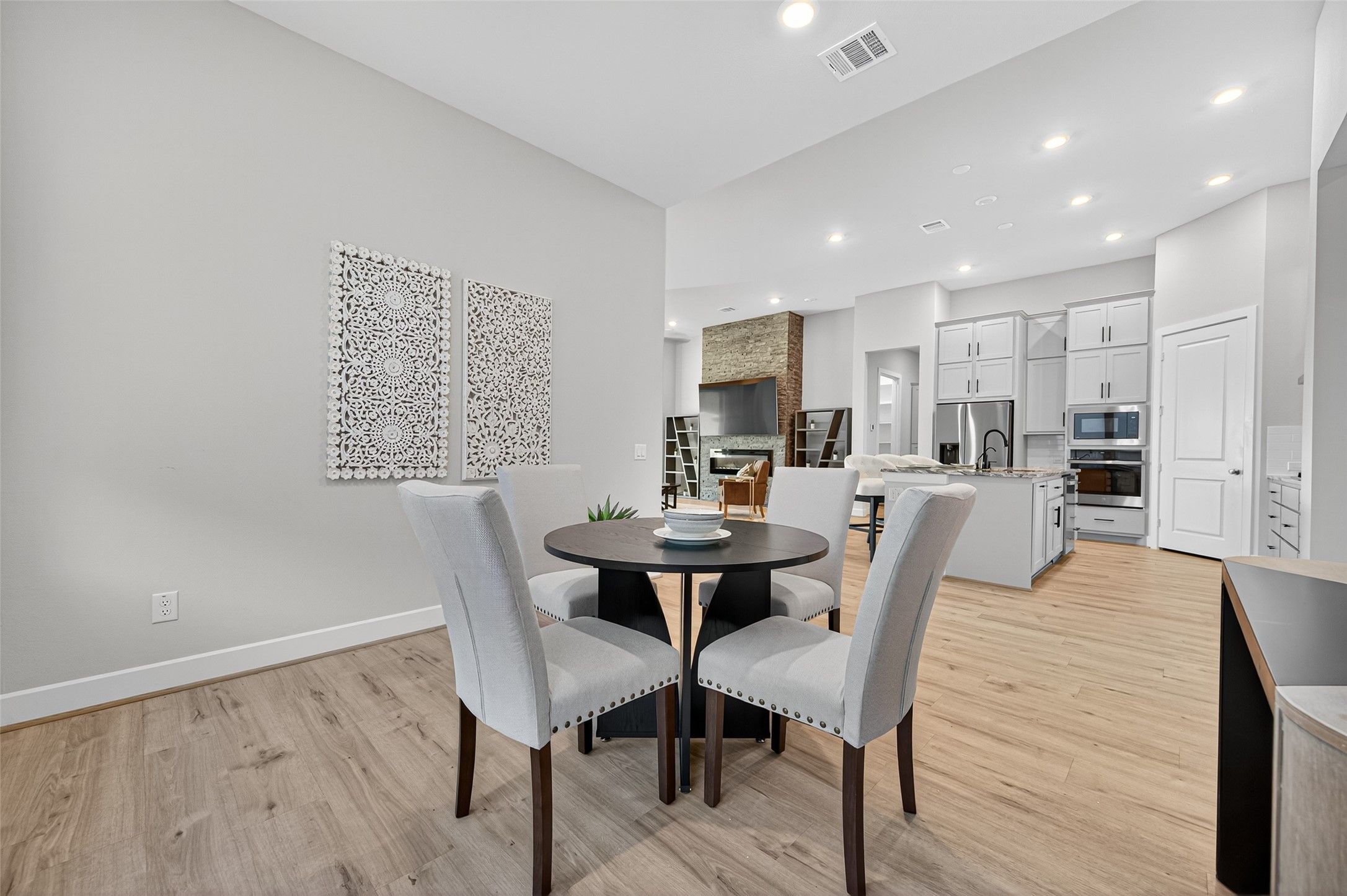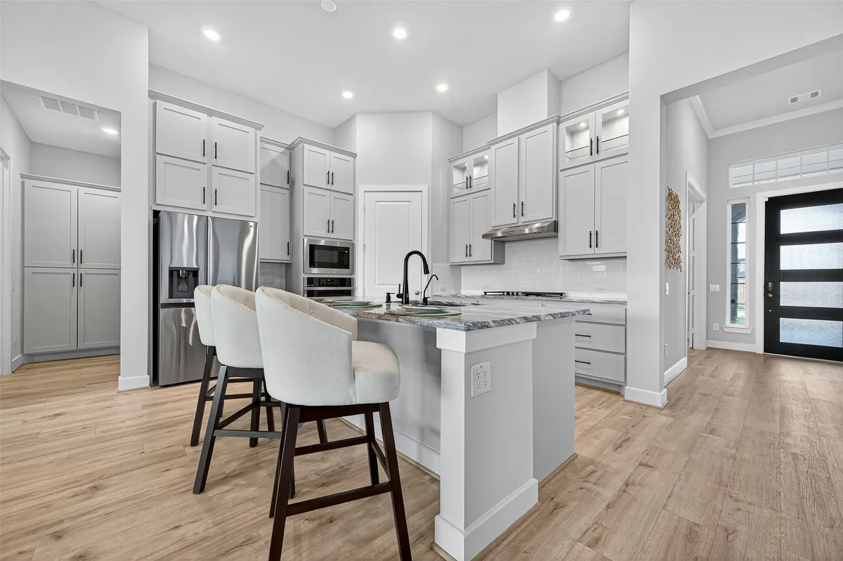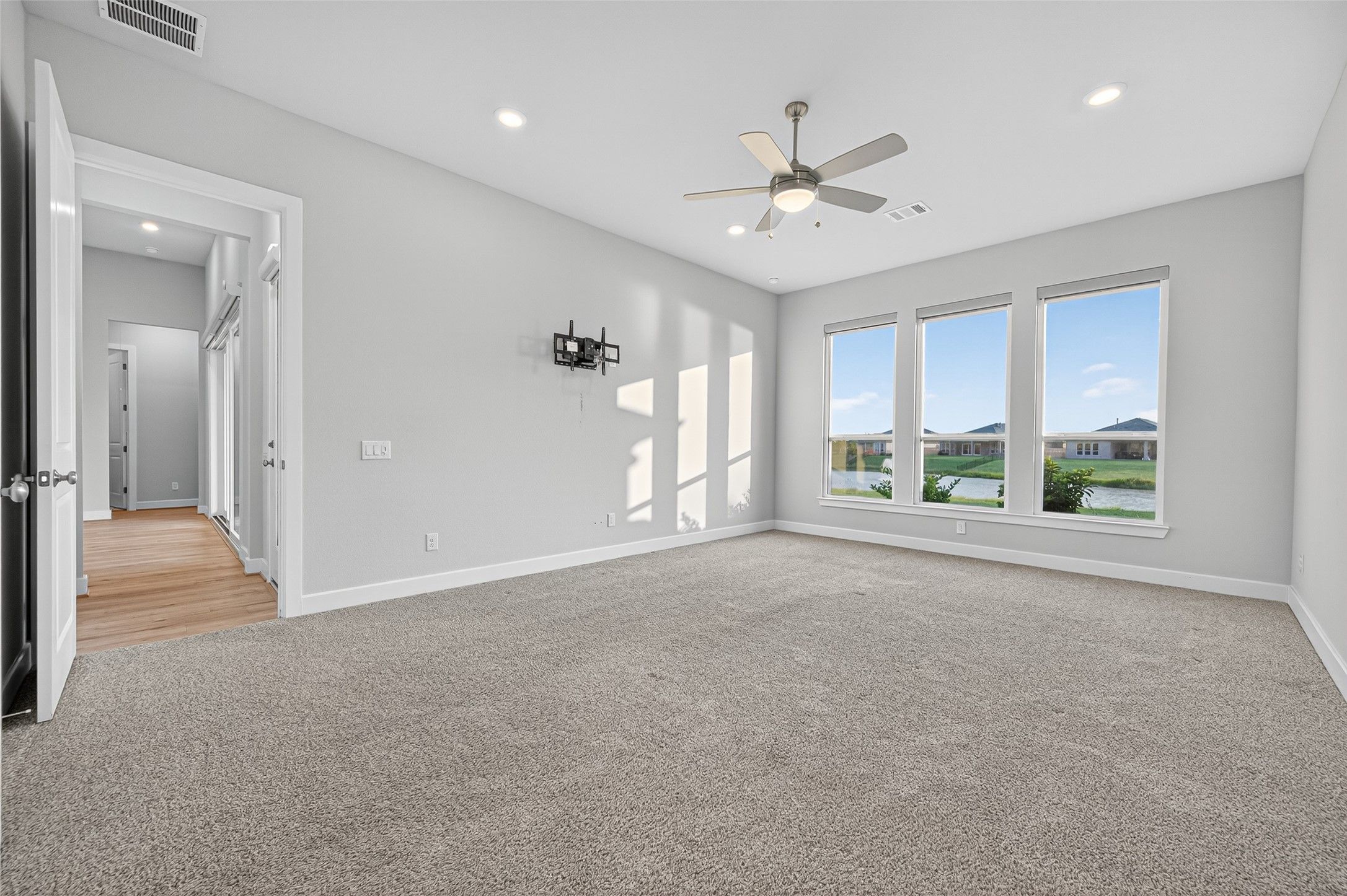 Elegant design meets everyday comfort in this 55+ active community The Juniper plan lakefront home with thoughtful upgrades throughout. Inside, soaring ceilings, crown molding, and luxury vinyl plank floors create a warm and refined backdrop. The open-concept kitchen impresses with double-stacked shaker cabinets, granite countertop, GE Profile appliances, soft-close drawers, and dual pantries designed for both daily living and entertaining. Gather in the spacious dining and family room anchored by a stone-accented fireplace. The primary suite offers new carpet, dual walk-in closets with custom cabinetry, and a spa-like bath featuring granite vanities and an oversized shower. Secondary bedrooms include details like French closet doors and a statement chandelier. A covered patio with decorative concrete overlooks the lake view from the backyard. A 3-car tandem garage with epoxy floors and a whole-home generator complete this exceptional property. OPEN HOUSE DAILY CALL OR TEXT FOR TIMES