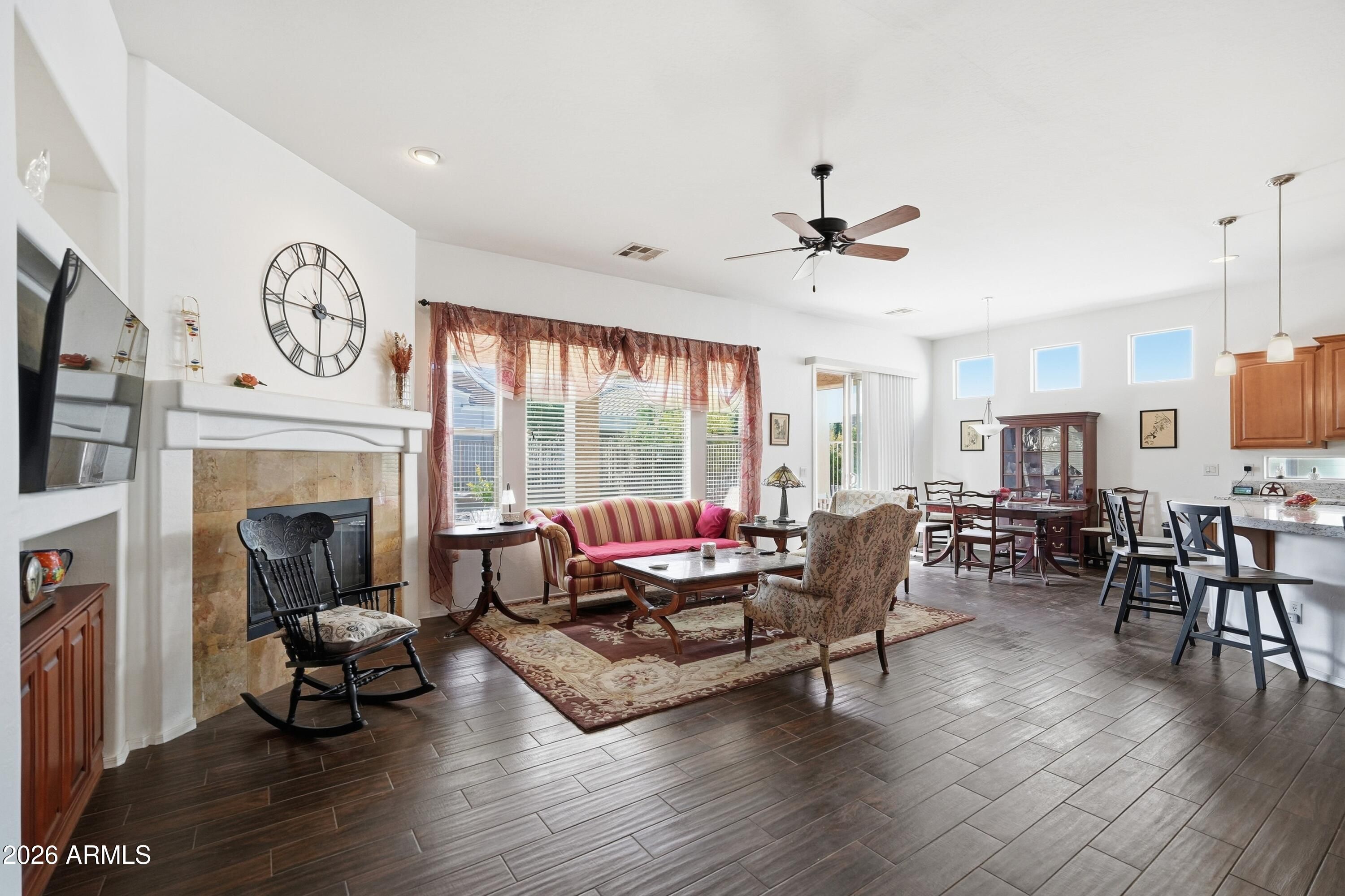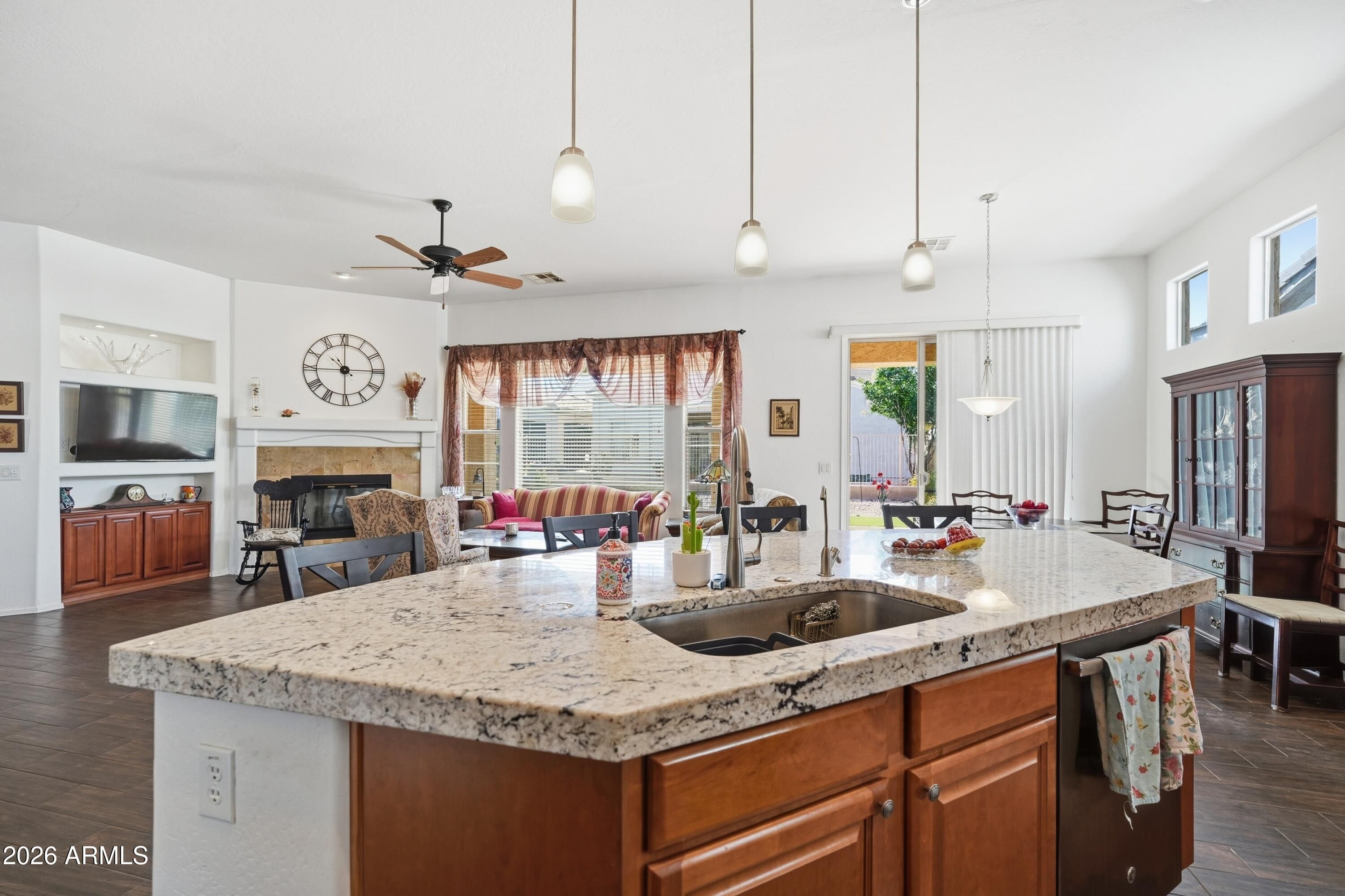 Beautiful Ironwood Model with stacked stone exterior trim features a spacious great room floor plan w/cozy gas fireplace, porcelain plank tile floors thru out home, gorgeous granite counter tops, center island, Stainless Steel refrigerator & dishwasher, staggered cabinetry w/crown modeling, hardware, pendant lights, R/O, pantry, breakfast bar & a computer tech desk w/granite counter tops & built in cabinets for storage! NEWER A/C! Spacious Primary Suite features a LG bathroom w/raised height counters & double sinks, LG shower, Big walk in closet w/Classy Closets organizers. guest suite and full bathroom tub/shower combo. Huge laundry room, space for a desk/office, washer & dryer included. Enjoy a LG fenced backyard with southern exposure, covered patio & a gas stub on patio for a BBQ. Ad Additional features include: New Stove and Microwave, accent lighting by TV / fireplace area, both bathrooms have raised height toilet seats, newer hot water heater replaced in 2020, a soft water system, 2 car garage with direct entry into home, zero grade garage floors (No Steps) and a alcove space in garage for more storage, Paver stone extended patio w/gas stub. New turf in backyard and a sunscreen on bedroom window