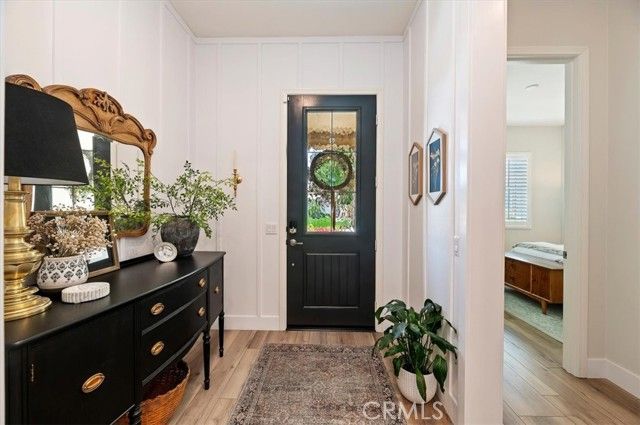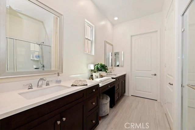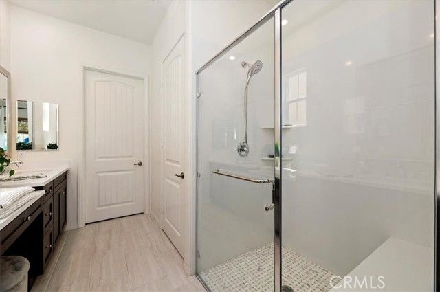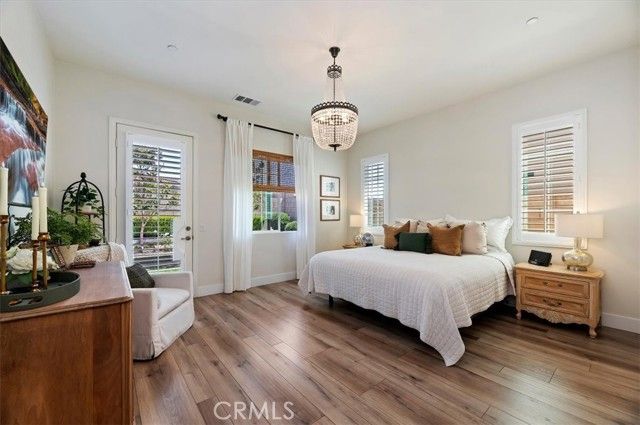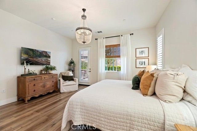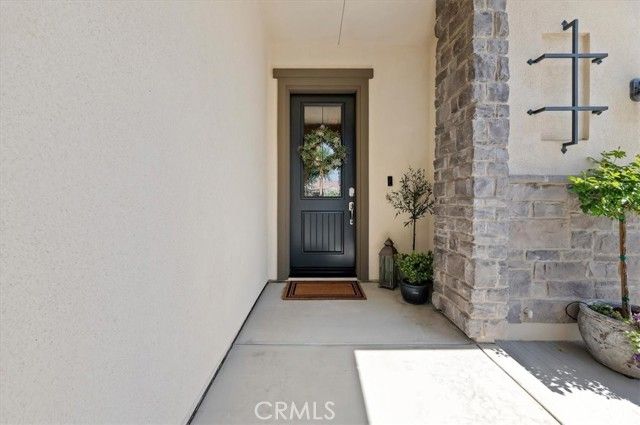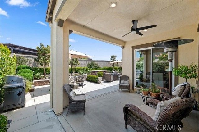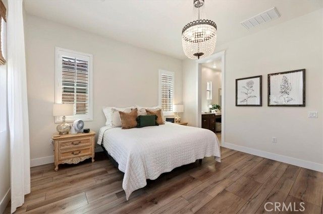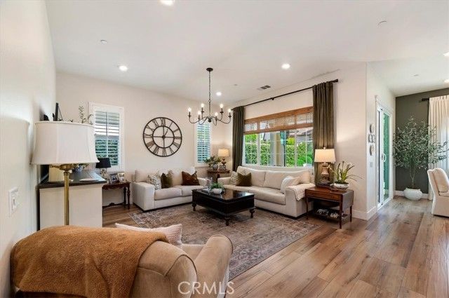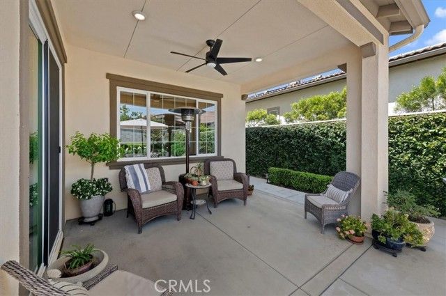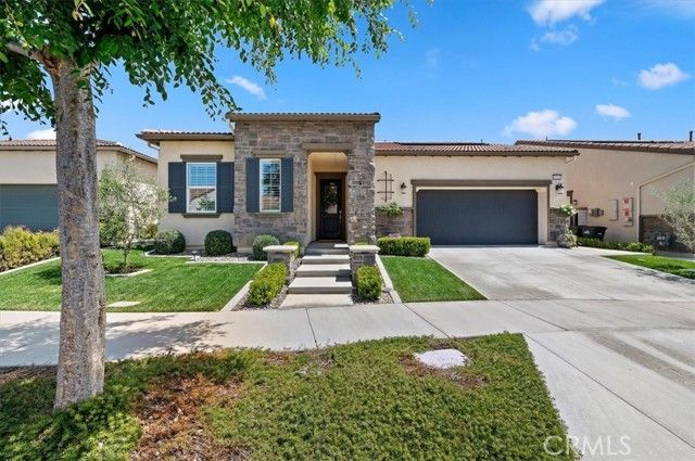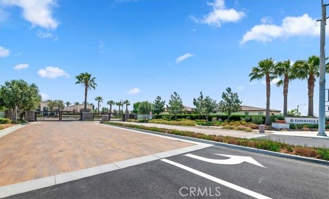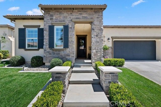 Welcome to the gated Esperanza 55+ Active Adult Community—one of the most desirable communities in Ontario Ranch. This exceptional single-story residence, the highly sought-after Modena model, is a true gem that presents beautifully and offers a seamless blend of style, comfort, and thoughtful design. Offering 2 bedrooms, 2 bathrooms, and a versatile flex room with the potential to serve as a third bedroom, home office, or den, this home provides both functionality and flexibility to fit your lifestyle. From the moment you step inside, the attention to detail is unmistakable. Elegant laminate flooring, upgraded baseboards and casing, plantation shutters, and refined designer finishes create a bright, modern aesthetic throughout. The kitchen is tastefully appointed with quartz countertops and a full marble backsplash, while decorative wall molding in the entryway and bath adds a distinctive custom touch. Every inch of this home has been carefully curated and impeccably maintained, creating a space that feels polished and complete. Step outside to a professionally landscaped front and backyard designed for both relaxation and enjoyment. A tranquil fountain enhances the setting, offering a peaceful backdrop for morning coffee or quiet evenings at home. The garage continues the home’s elevated feel, featuring epoxy flooring and suspended storage racks for a clean, organized environment. Residents enjoy exclusive access to the La Jolla Club, where resort-style amenities include a pool, bar area, outdoor kitchen, fire pits, fitness center, pickleball courts, and a dog park—perfect for an active and social lifestyle. Ideally located within walking distance to The Station at Eastvale and the Goodman Center, with convenient access to 99 Ranch Market, the 60 and 15 freeways, and just a short drive to Ontario Mills for shopping, dining, and entertainment. This is a rare opportunity to own a pristine, turn-key home in a premier 55+ community.