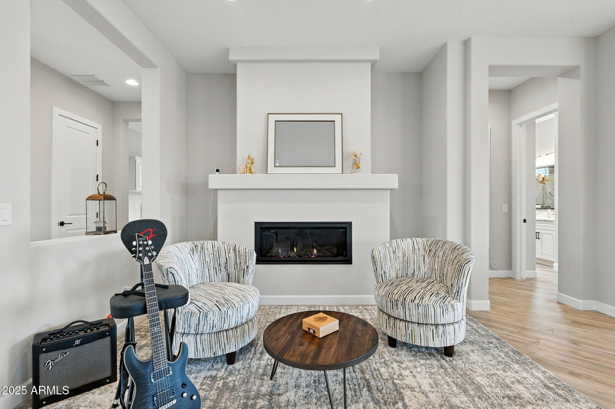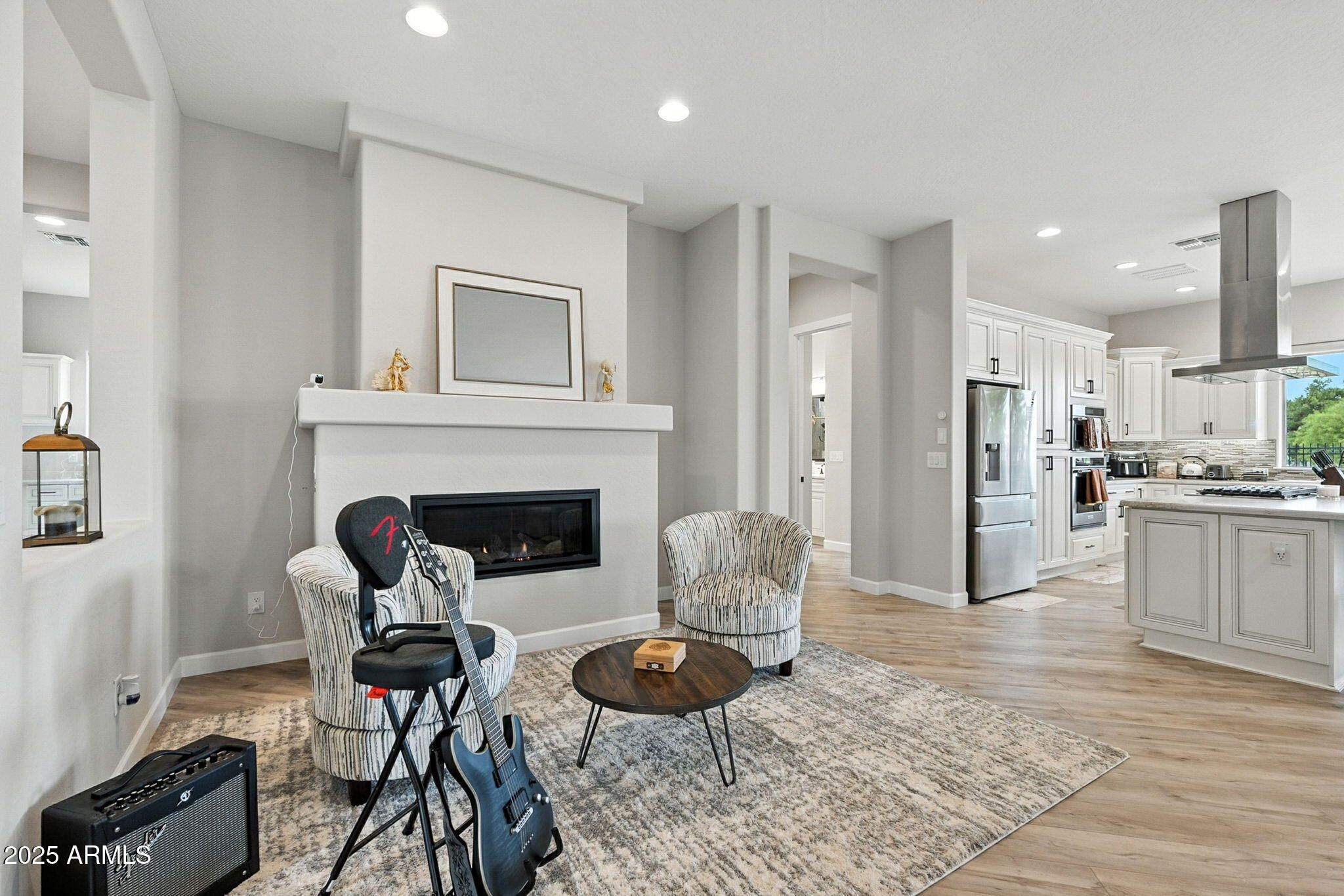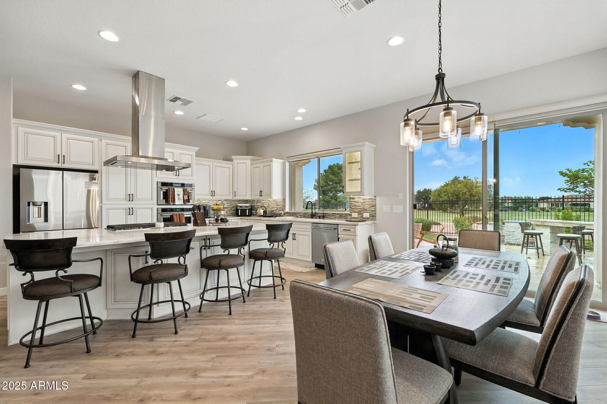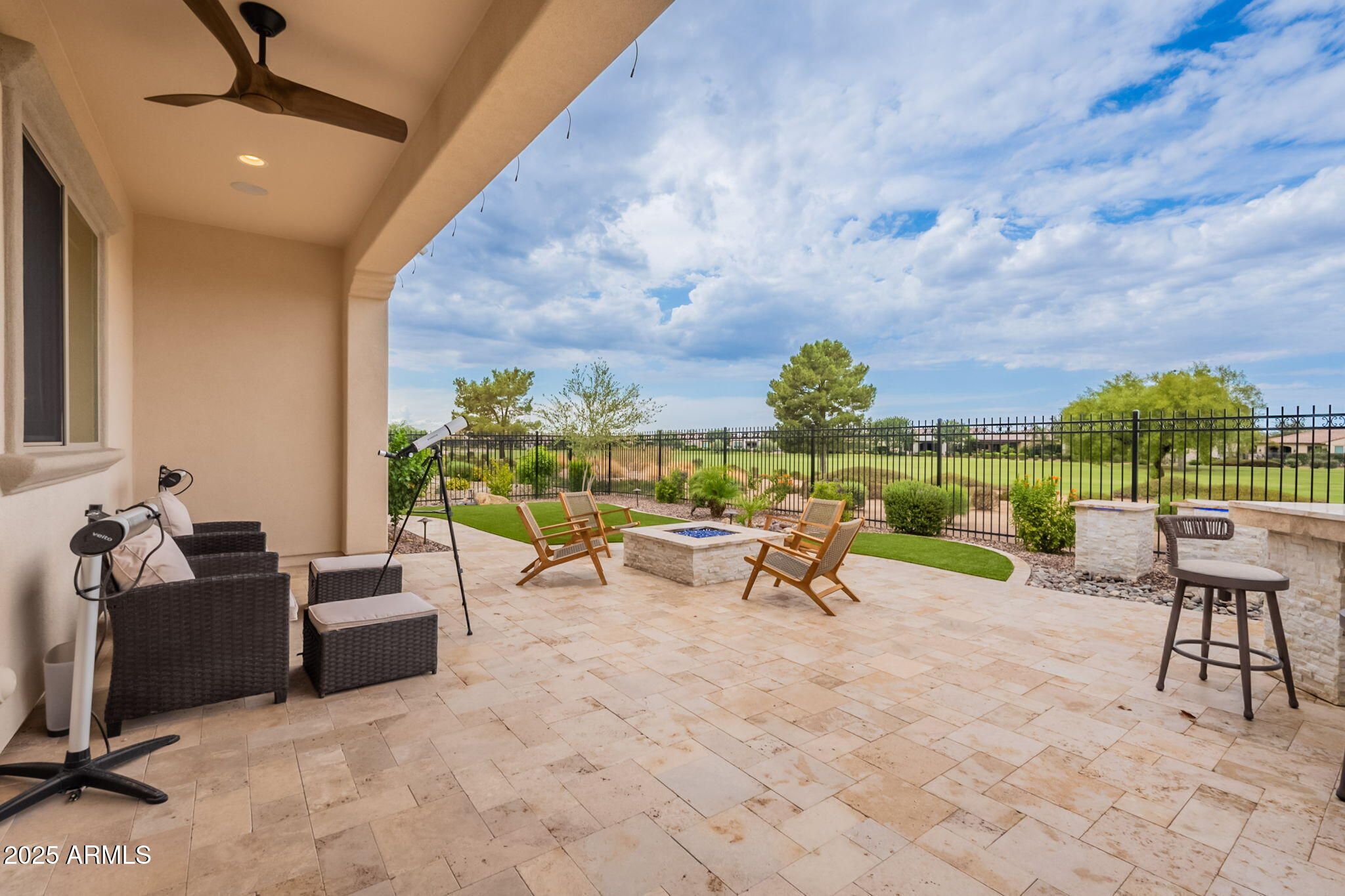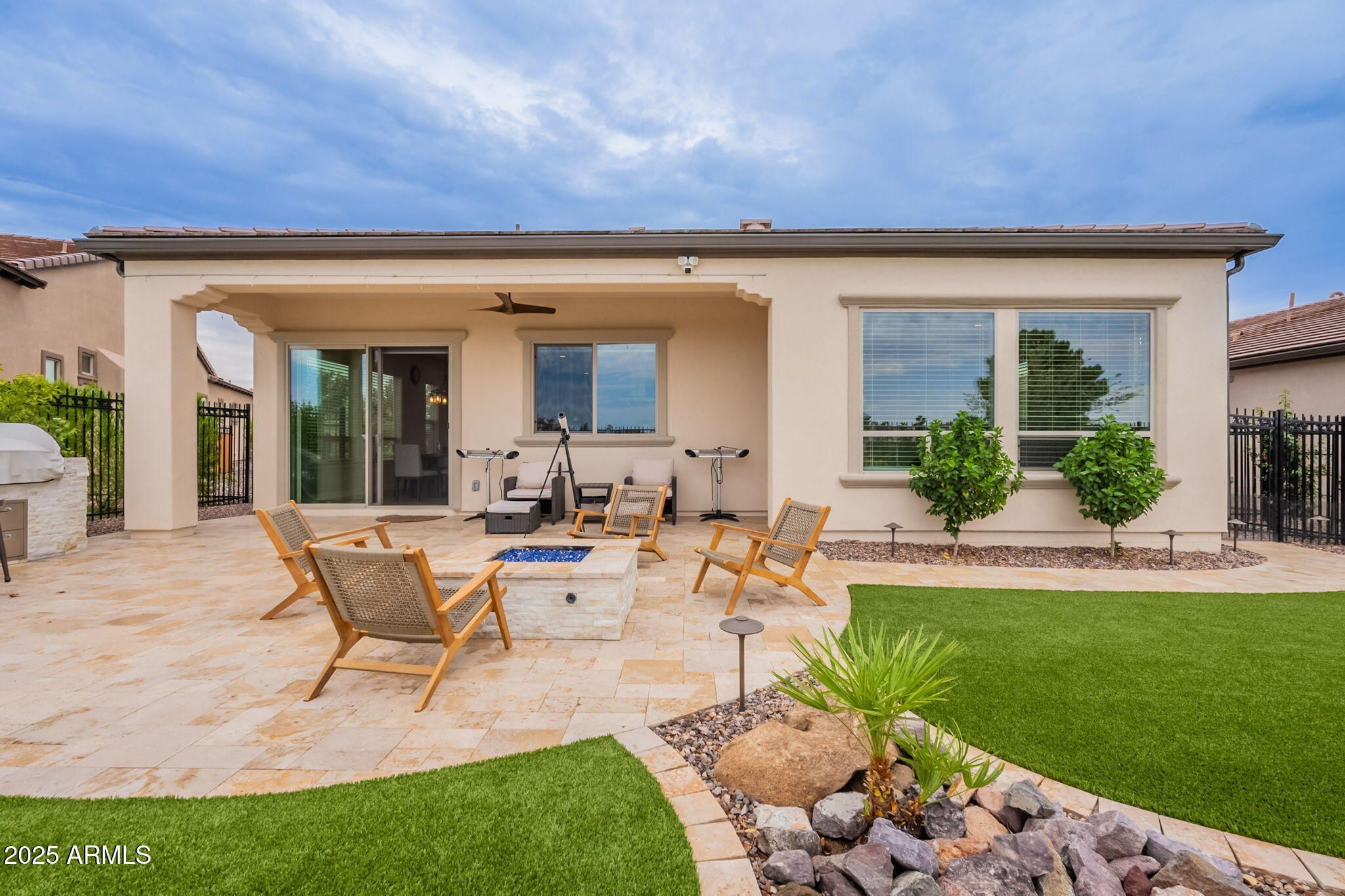 Experience the ultimate in luxury living within the gates of one of the East Valley's most sought-after golf communities—Encanterra CC. This refined, nearly-new Captivate sits on a generous 7,722 sq ft golf-course lot, with breathtaking mountain and fairway views. Backyard paradise—carefully designed with premium travertine underfoot, a built-in BBQ w/ bar, lighted fountains, a cozy firepit, and cooling misters to enjoy summer evenings in style. Inside, discover a chef's haven with upgraded SS appliances, flowing seamlessly into cozy living spaces including a den/office, a charming sitting area with a fireplace, and two generously sized BR suites. With thoughtful enhancements T/O plus a 2car garage and a golf-cart garage, this home blends elegance w/functionality!