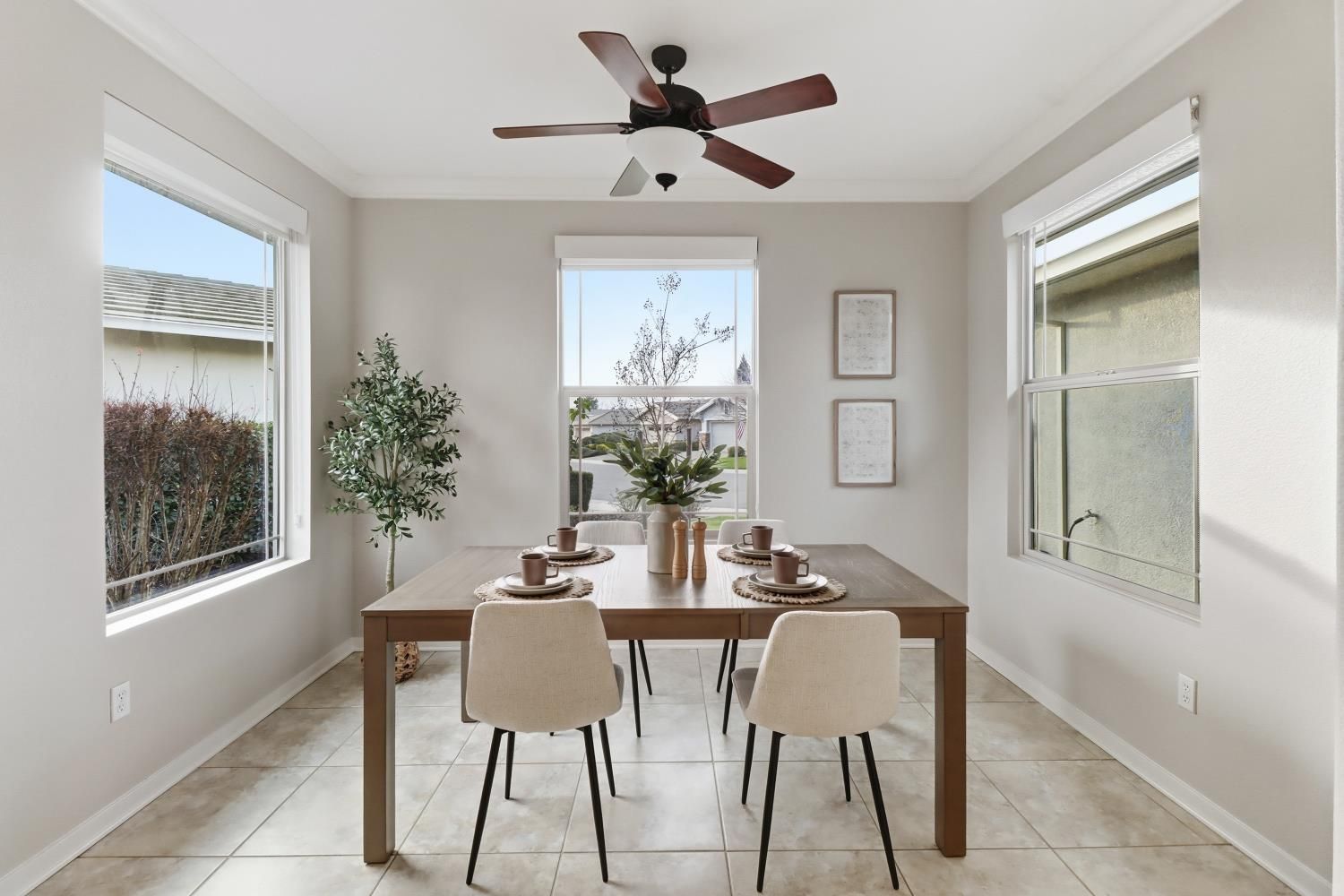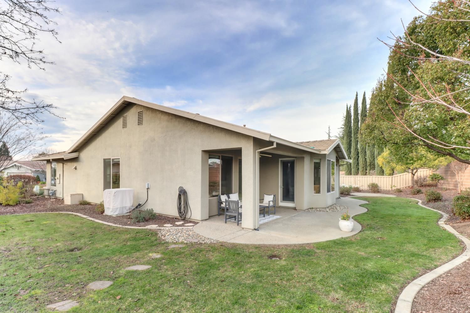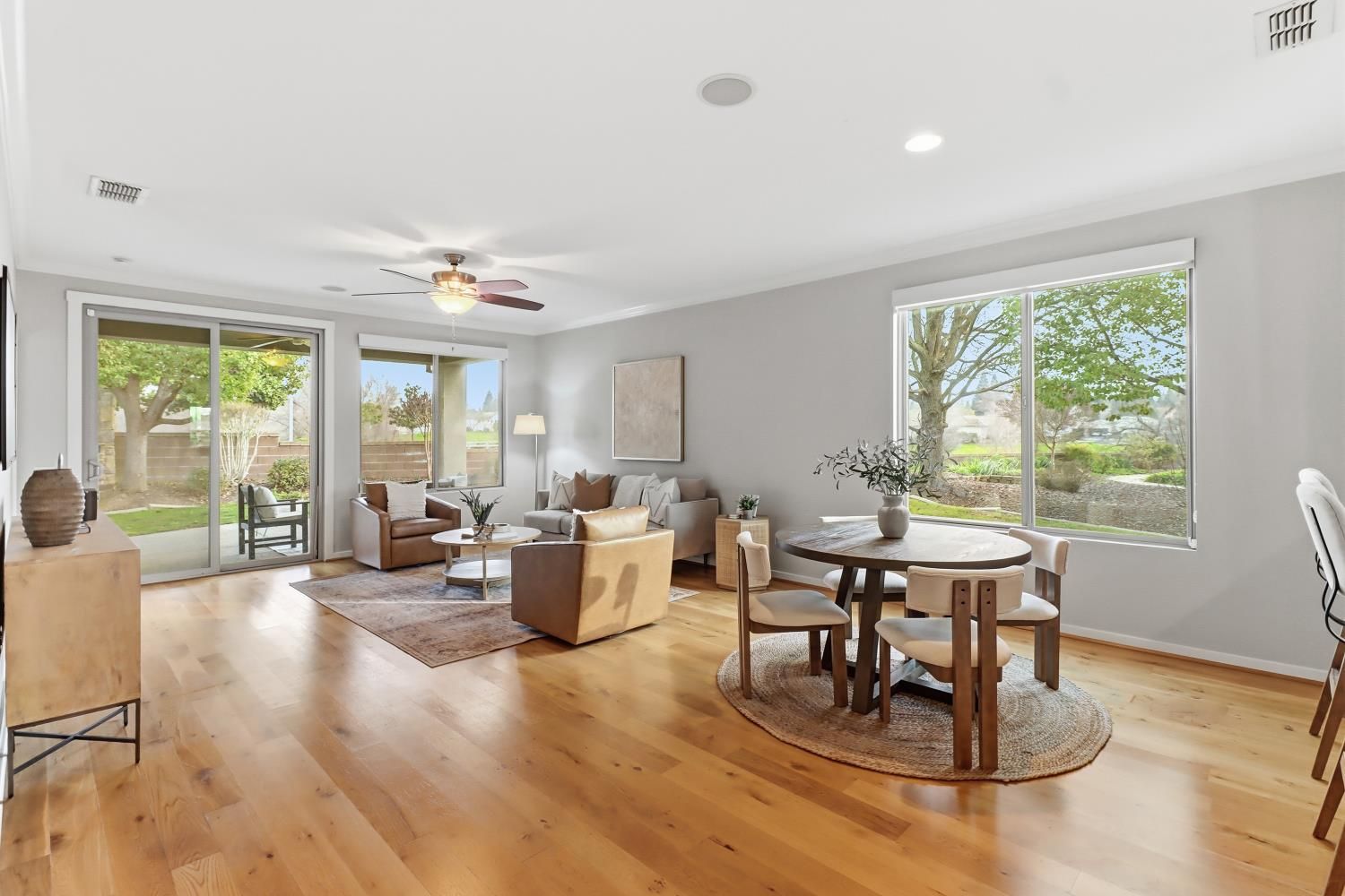 Immerse yourself in an active, resort-style lifestyle in the highly sought-after 55+ community of Sun City Lincoln Hills. This beautifully maintained Tehama model is freshly painted, spotless and ready for you to add your own personal touch. The home offers a warm, functional layout ideal for entertaining or enjoying relaxed time with family and friends. The spacious front-of-home kitchen features abundant cabinetry with pull-out drawers, a pantry, gas cooktop, oven, microwave, refrigerator, granite countertops with full backsplash, crown molding and durable 18" tile flooring. A charming breakfast nook, framed by three large windows, fills the space with natural light. The inviting living room is spacious and bright with light engineered hardwood flooring, crown molding. The large sliding door and picturesque window gives one a view of the lovely backyard and partial greenbelt views. The expansive primary suite is privately located at the rear of the home and includes a cozy sitting area with the bay window and direct access to the backyard. The en-suite bath offers dual sinks, shower, and a generous walk-in closet. A versatile den can serve as an office, a craft room, or be converted into a third bedroom by adding a murphy bed. A secondary bedroom and guest bath are conveniently located at the front of the home, perfect for visitors. Step outside to the east-facing backyard, where extra-wide side yards, a rose garden, multiple patio seating areas and a covered patio create a peaceful retreat ideal for morning coffee or evening relaxation. Enjoy partial greenbelt views and access to nearby walking trails, offering scenic surroundings and plenty of photo-worthy moments. Residents enjoy access to exceptional amenities, including two 18-hole championship golf courses, a state-of-the-art fitness center with indoor and outdoor pools, tennis and pickleball courts, a full-service clubhouse with restaurants and a pub. Additional offerings include social clubs, miles of walking, biking trails, a fishing pond, a well-stocked library, craft rooms, and a performing arts theater ensuring there's always something to do. Located between both club houses, with easy in and out access, this is a great location within the community. Make sure to view the video for a better sense of the home and all that it offers and also the surrounding area.