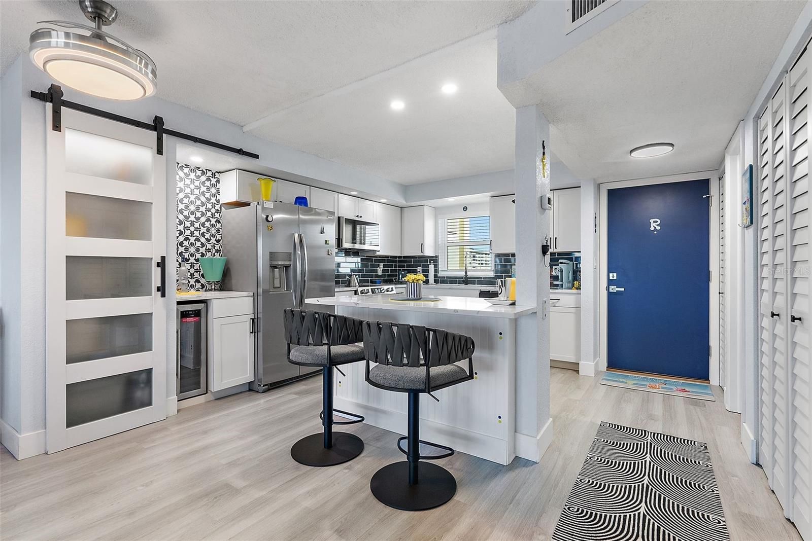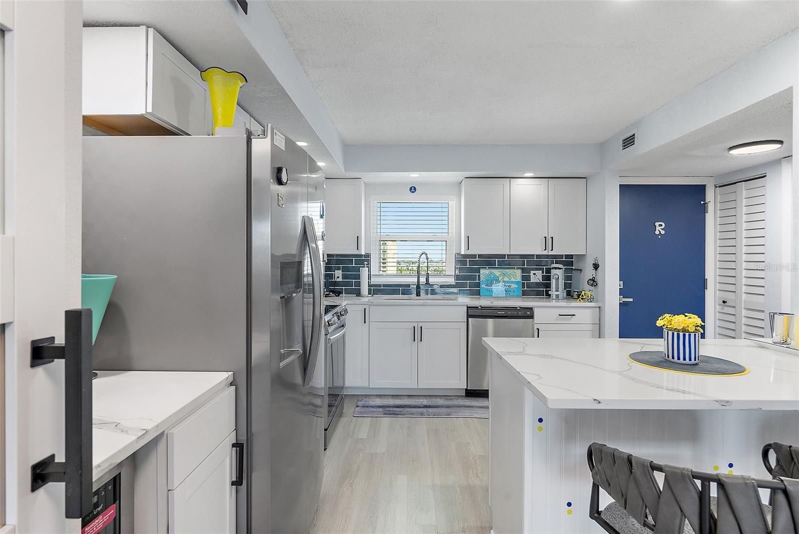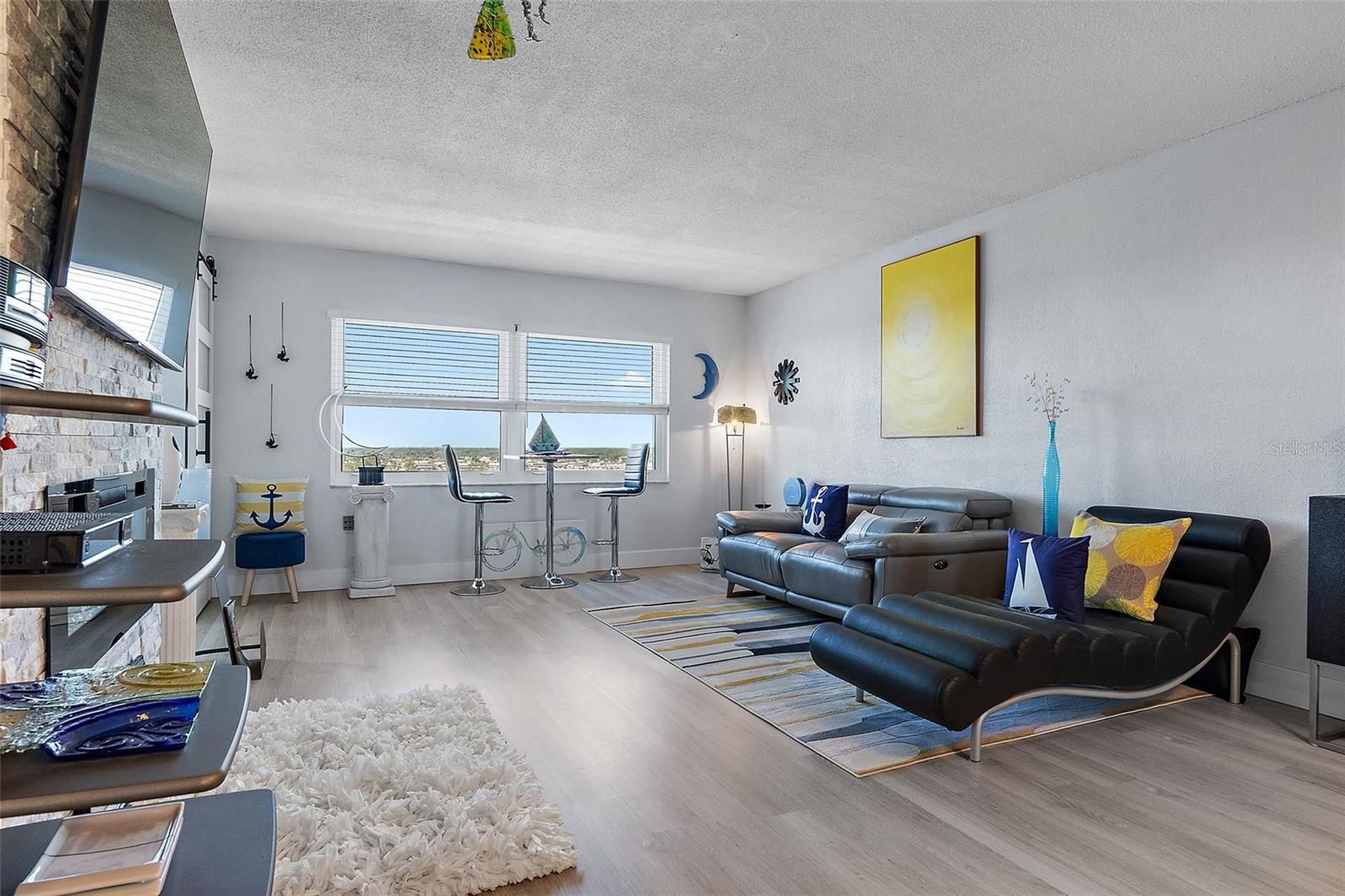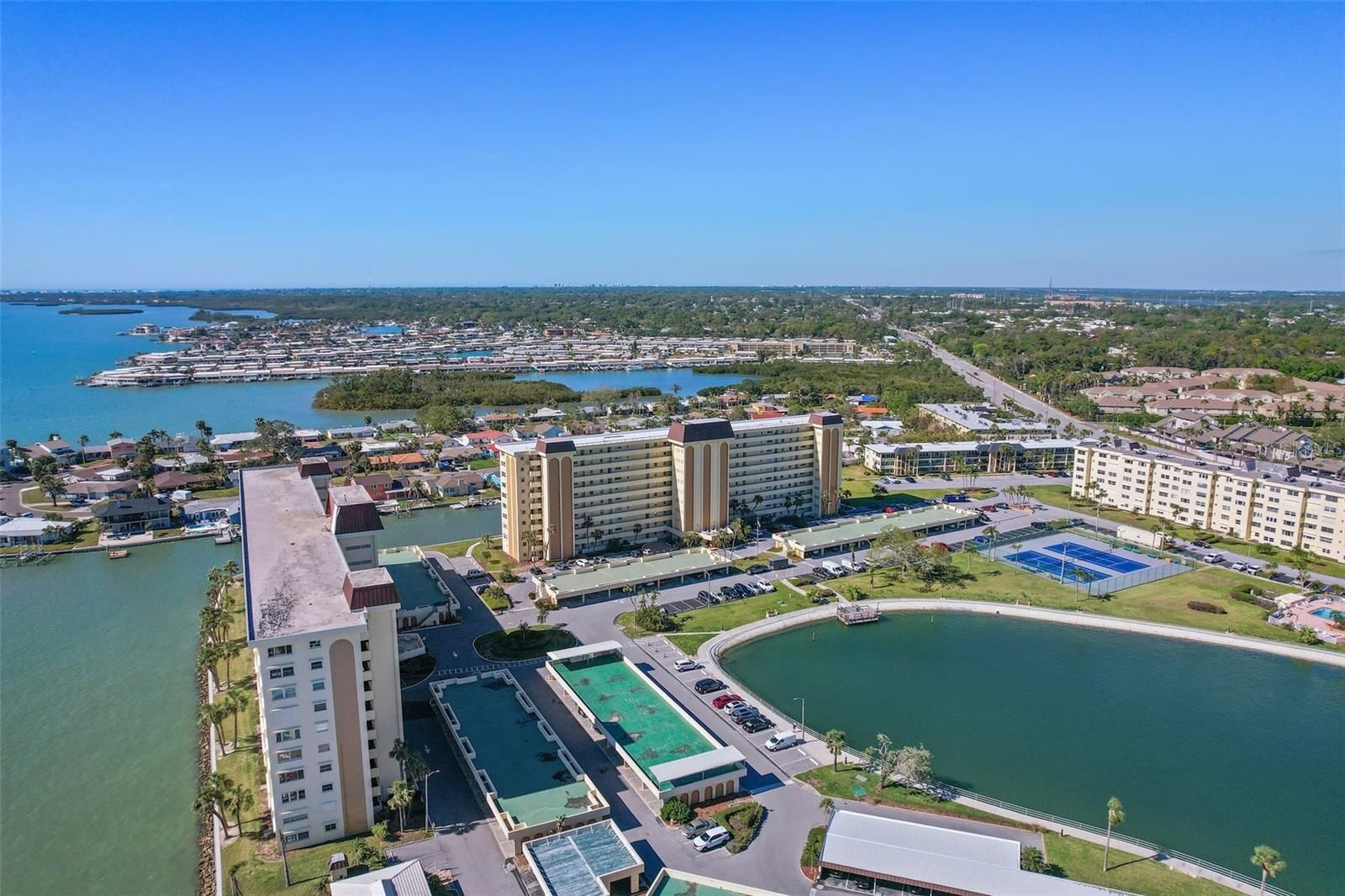 Recently remodeled (2 years) open concept condo located in a secured community situated on the intercoastal and providing waterviews from the unit. New floorplan includes a kitchen island, coffee bar with wine cooler and separate food pantry with barn door. New appliances featured include refrigerator with water/ice, upgraded range with air-fry, microwave, dishwasher and disposal. The new cabinets are topped by quartz countertops with complementary backsplash and designer tile. There is new luxury vinyl flooring throughtout, a ledger-rocked wall with electric fireplace insert that includes separate heating capability and new hurricane resistant windows and door. The community is located 1 mile from the Madeira Beach entrance. The community offers 2 heated pools (one located on the intercoastal waterway), tennis courts, pickelball courts, clubhouse (expected restoration completed by year end) features auditorium, fitness center, card room, billiards room. There is a private marina on site with available slips that can be purchased to house your boat. Carport #59. HOA fees have decreased over the past two years. Fully funded for 2 years. Milestone and Reserve Reports have been completed. New roof in 2025. AC 2019, water heater 2017. Ceiling fans in DR and Sunroom do not convey. TV in LR does not convey.