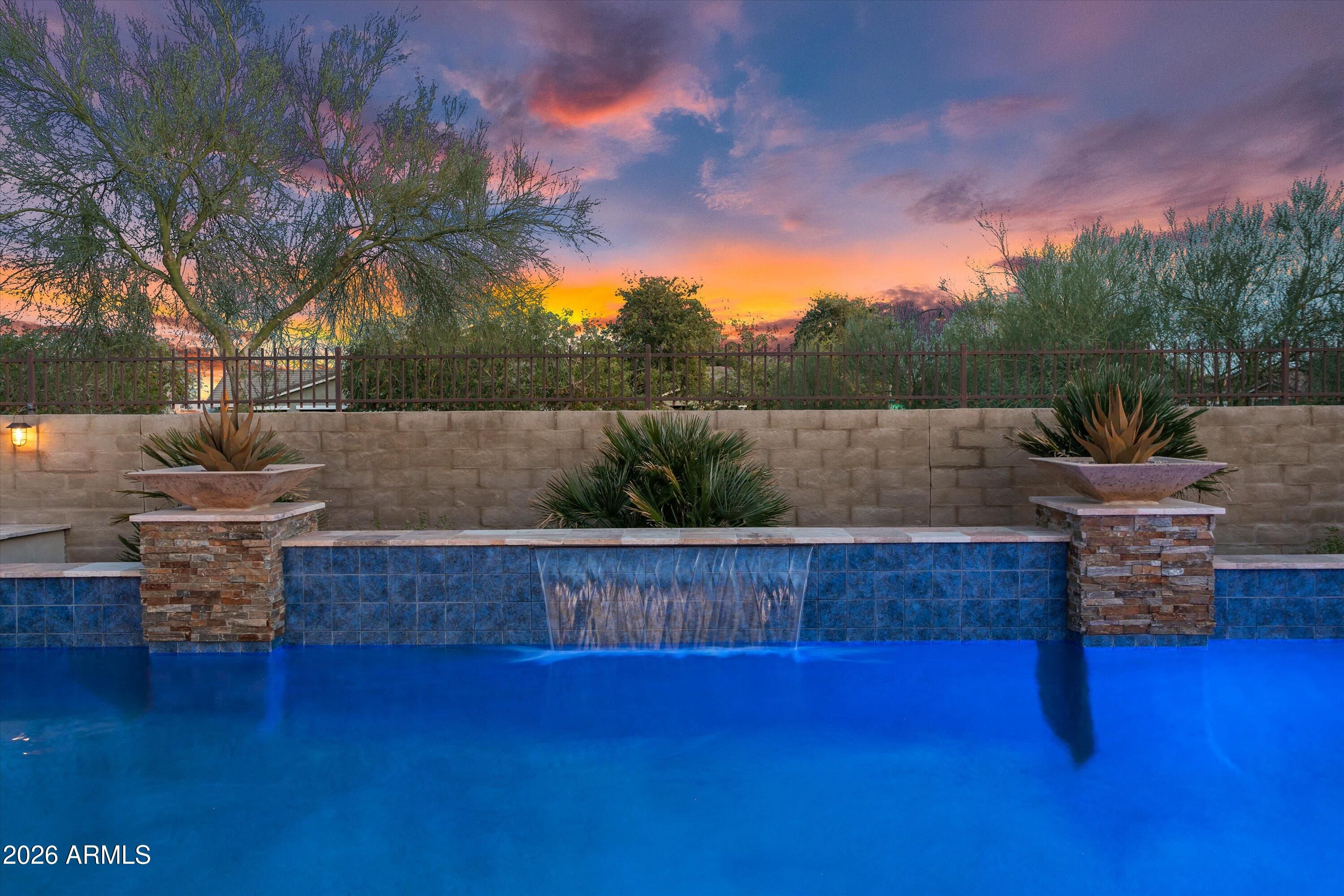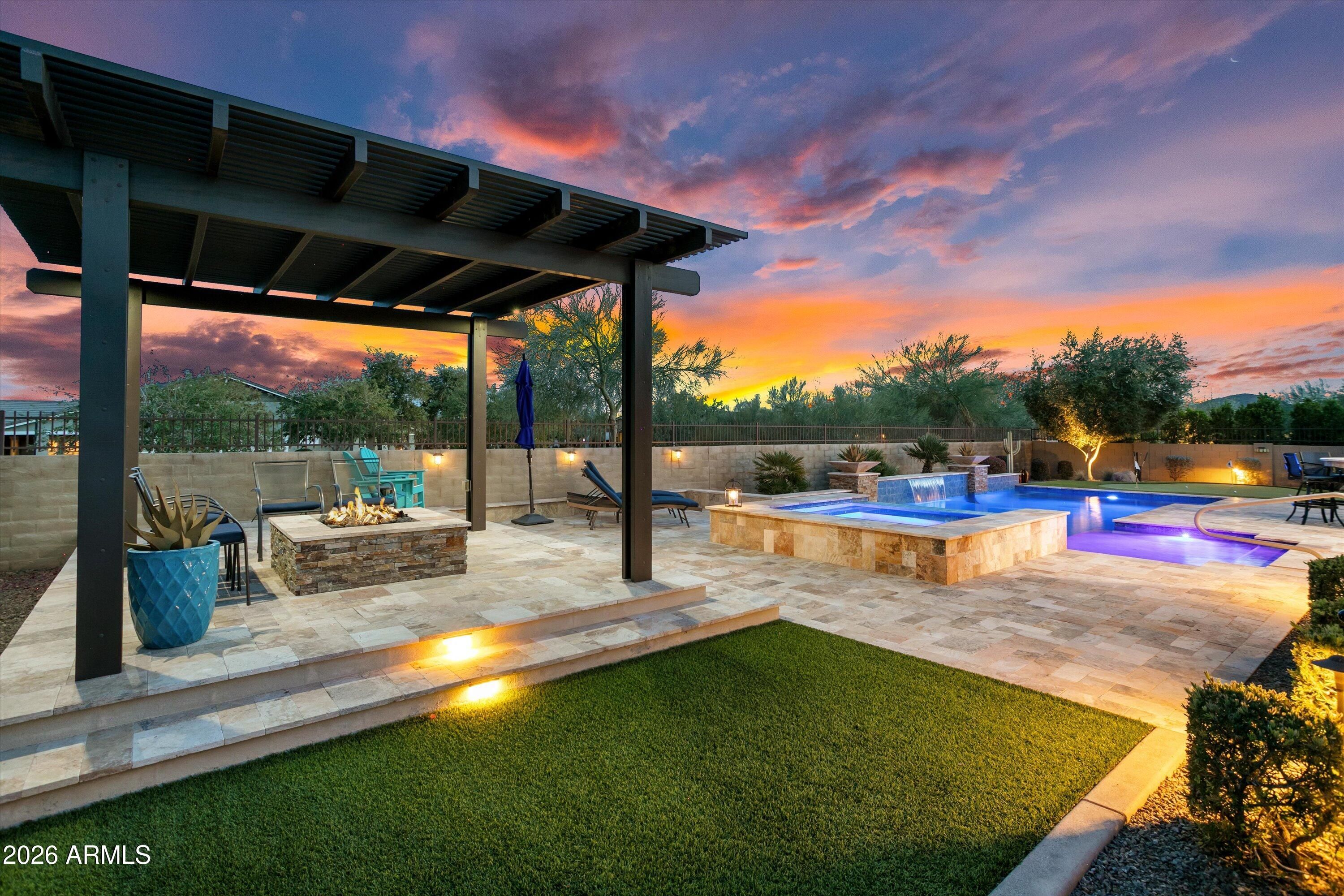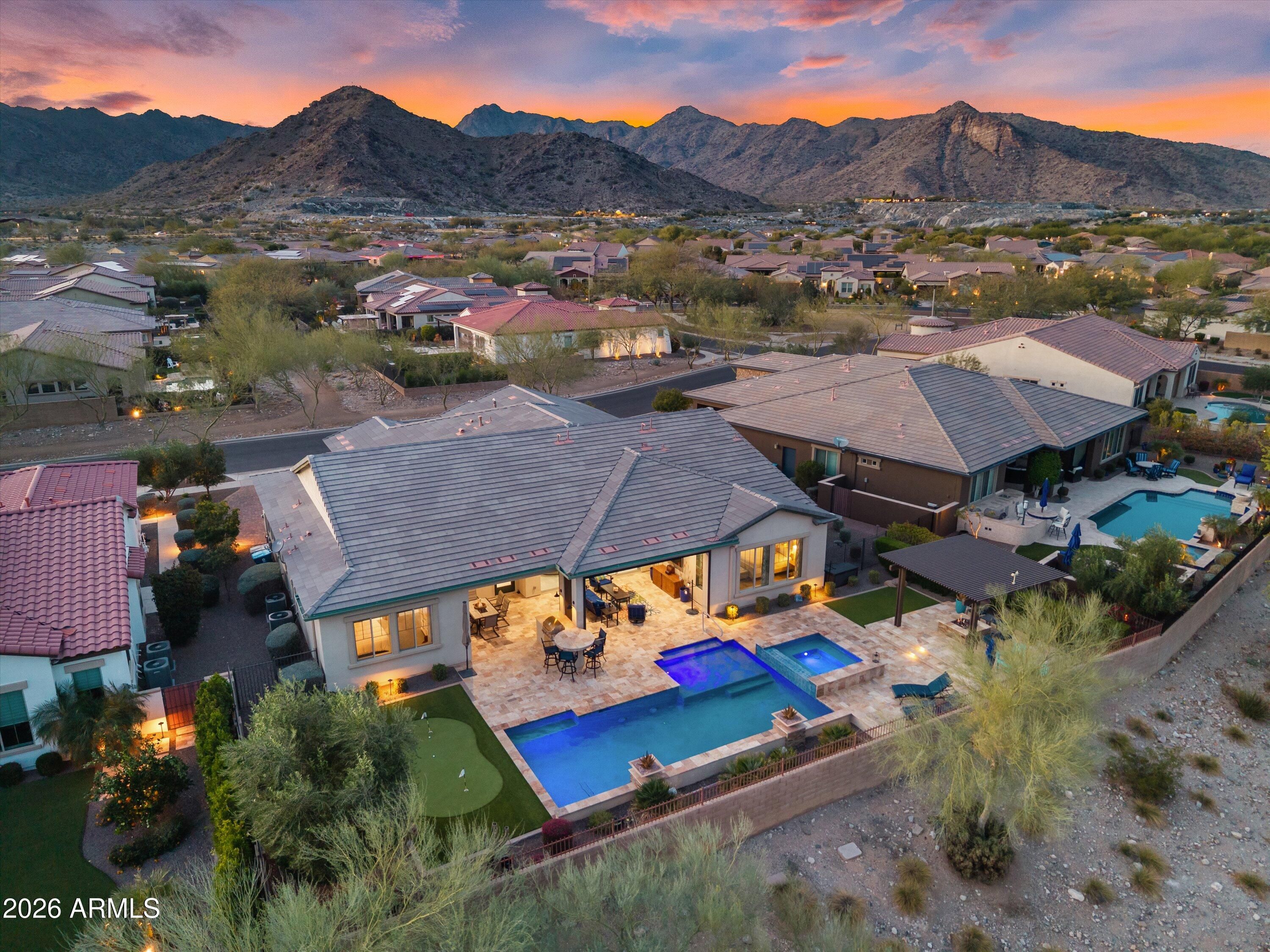 Welcome to this stunning David Weekley home, boasting over $280,000 in luxurious builder upgrades. Situated in a highly desirable area, this meticulously designed residence features an expansive layout with two master bedroom en-suites, a guest room en-suite, a huge great room, a den, and a hobby room/bedroom 4 with additional insulation for comfort. Step inside to discover a breathtaking gourmet kitchen, complete with floor-to-ceiling cabinetry, a large quartz island highlighted by hand-blown pendant lighting, an induction cooktop, wine refrigerator, and stainless steel appliances. The entertainment space flows naturally into the outdoors through the impressive 16' sliding lanai door, leading to your own resort-style backyard. Enjoy the generous covered patio, a gorgeous heated pool and spa, a putting green, and a raised fire pit under a charming pergolaperfect for enjoying the city lights view, with no rear neighbors in sight. The inviting front porch offers an idyllic spot to savor the sunset over the beautiful Mountain View. Throughout the home, you'll find exquisite quartz and marble countertops, enhancing the elegance of every room. Recent updates include new A/C units installed on July 14, 2023, and a salt system conversion for the pool completed on May 13, 2023, ensuring optimal comfort and maintenance. Additional exterior features include a built-in BBQ, screened-in patio with motorized shades, and rain gutters added for your convenience. This home is truly a haven for entertaining, providing a comfortable and private space for sleepover guests. The serene backyard space promises relaxation and tranquility, making it an entertainer's dream or a private retreat. From upgraded interior features like solid core "Wave" doors and custom cabinetry to extensive electrical upgrades and beautiful accent lighting, every detail has been meticulously attended to. Experience luxury 55+ community of Victory at Verrado, where every day feels like a vacation!