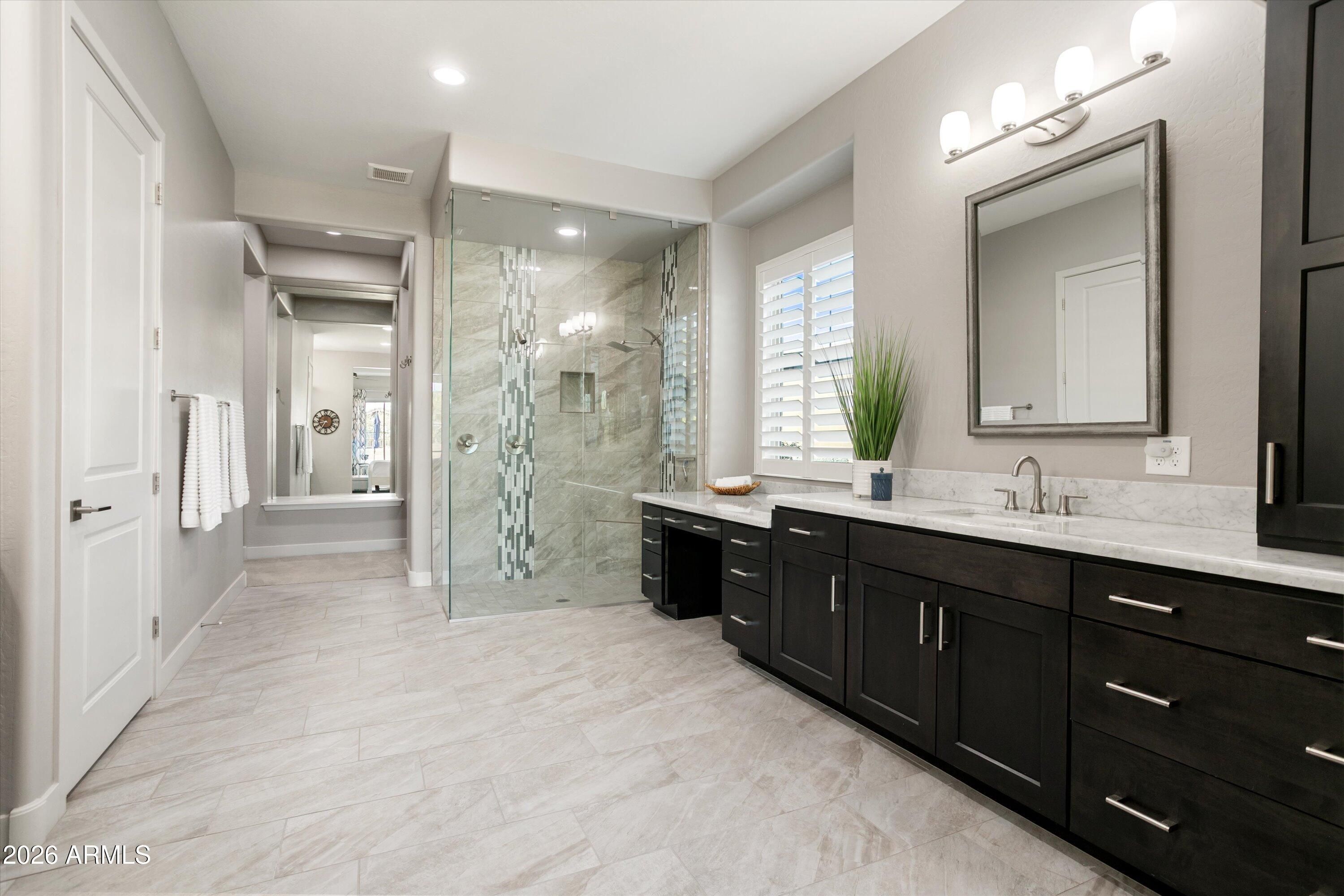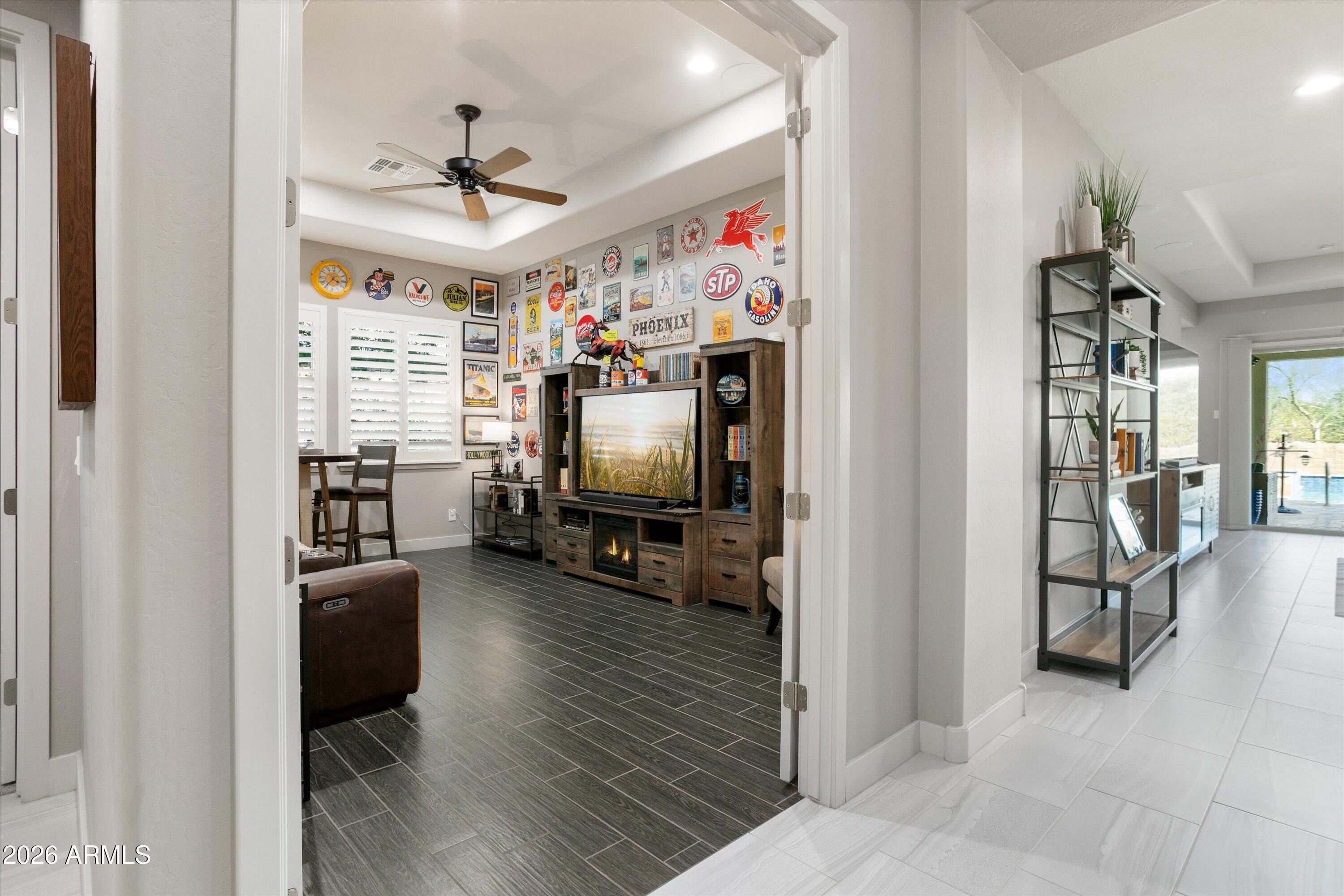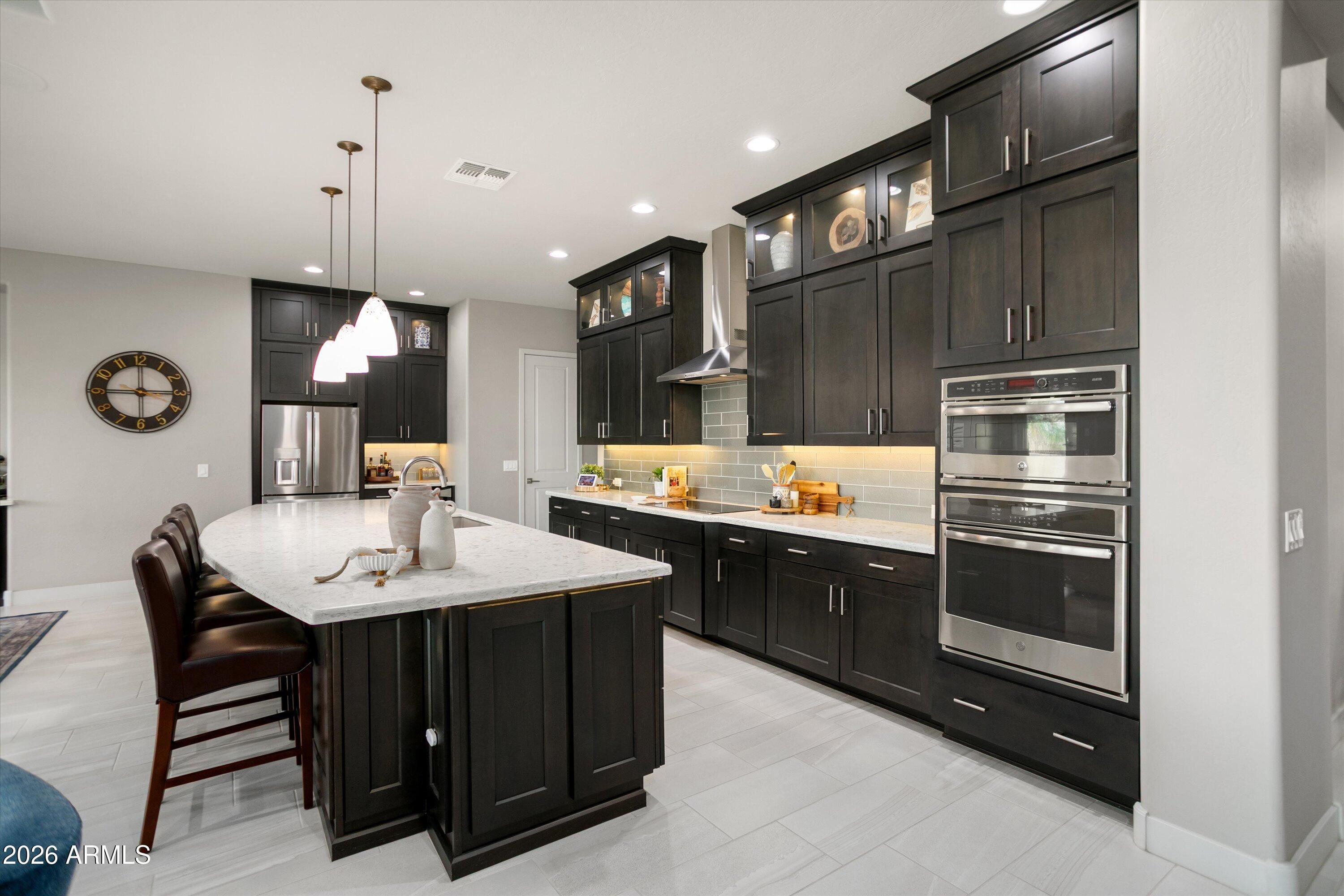 Welcome to this stunning David Weekley home, boasting over $280,000 in luxurious builder upgrades. Situated in a highly desirable area, this meticulously designed residence features an expansive layout with two master bedroom en-suites, a guest room en-suite, a huge great room, a den, and a hobby room/bedroom 4 with additional insulation for comfort. Step inside to discover a breathtaking gourmet kitchen, complete with floor-to-ceiling cabinetry, a large quartz island highlighted by hand-blown pendant lighting, an induction cooktop, wine refrigerator, and stainless steel appliances. The entertainment space flows naturally into the outdoors through the impressive 16' sliding lanai door, leading to your own resort-style backyard. Enjoy the generous covered patio, a gorgeous heated pool and spa, a putting green, and a raised fire pit under a charming pergolaperfect for enjoying the city lights view, with no rear neighbors in sight. The inviting front porch offers an idyllic spot to savor the sunset over the beautiful Mountain View. Throughout the home, you'll find exquisite quartz and marble countertops, enhancing the elegance of every room. Recent updates include new A/C units installed on July 14, 2023, and a salt system conversion for the pool completed on May 13, 2023, ensuring optimal comfort and maintenance. Additional exterior features include a built-in BBQ, screened-in patio with motorized shades, and rain gutters added for your convenience. This home is truly a haven for entertaining, providing a comfortable and private space for sleepover guests. The serene backyard space promises relaxation and tranquility, making it an entertainer's dream or a private retreat. From upgraded interior features like solid core "Wave" doors and custom cabinetry to extensive electrical upgrades and beautiful accent lighting, every detail has been meticulously attended to. Experience luxury 55+ community of Victory at Verrado, where every day feels like a vacation!
