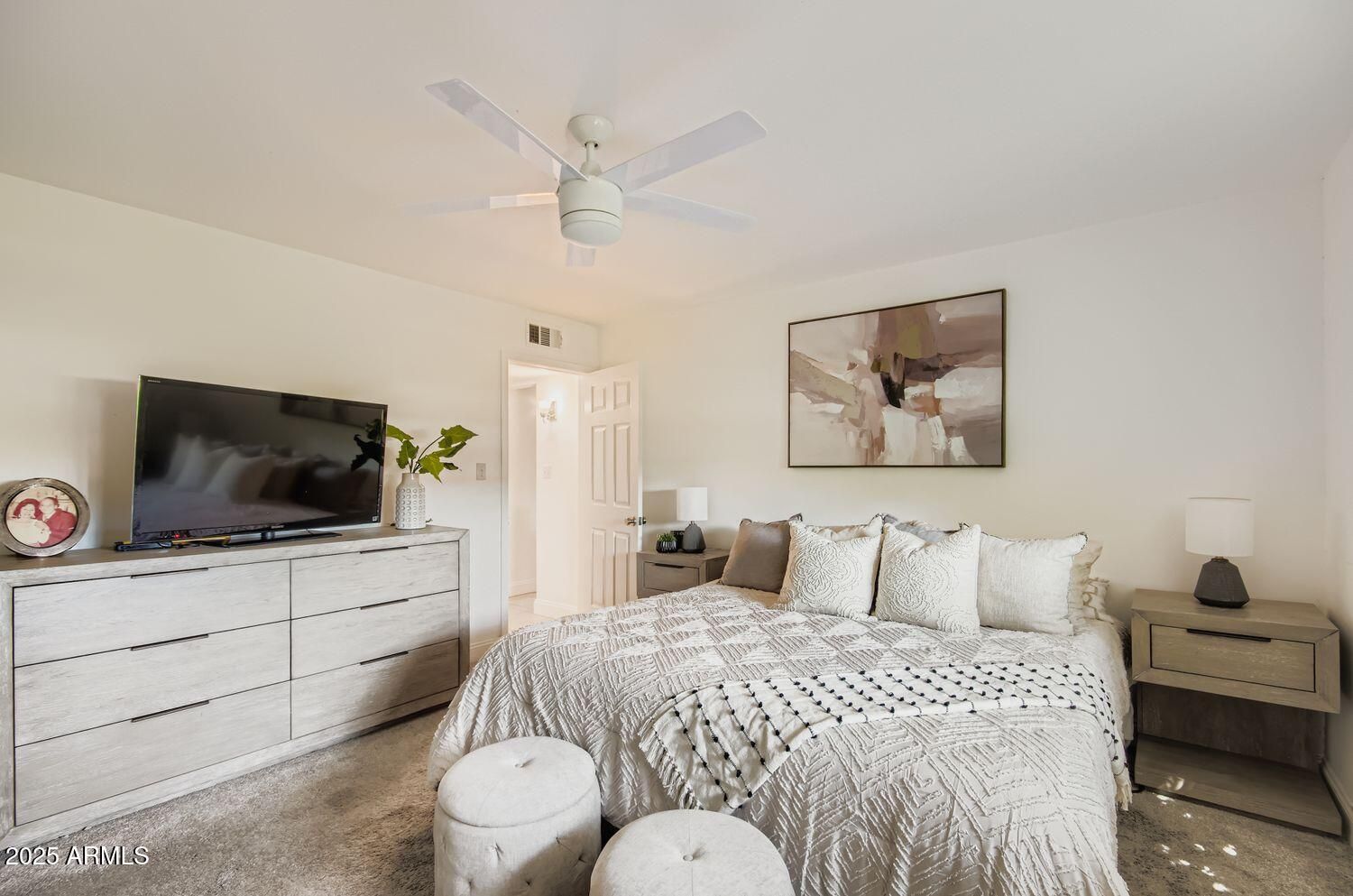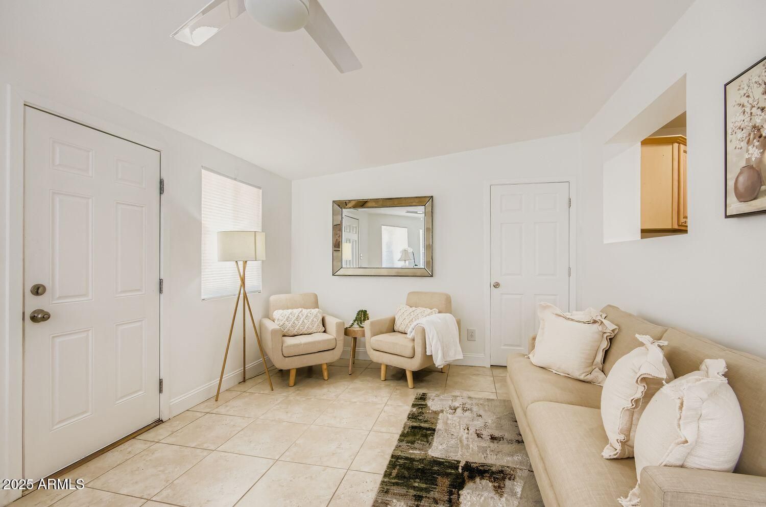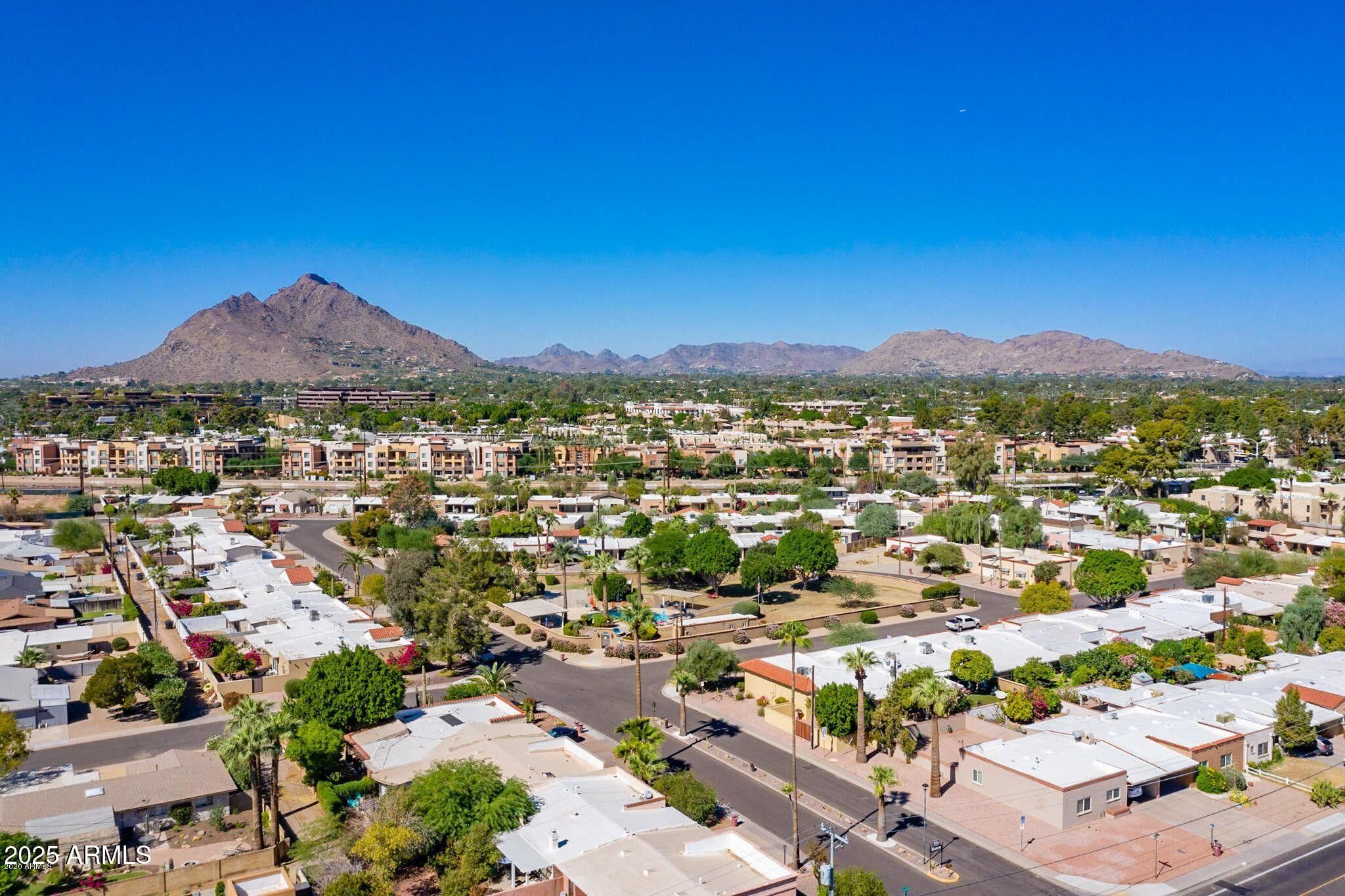 Welcome Home! This spacious two-bedroom, two-bathroom home is nestled within the 55+ Villa Monterey community, right in the heart of desirable Old Town Scottsdale. From the curb, you'll be greeted with a soft neutral palette and vibrant bougainvillea, leading into a charming curved entryway and an inviting interior. The open kitchen, fully updated in 2020, is light and bright with maple cabinetry, granite countertops, a center island, stainless steel appliances, and recessed lighting. The home offers both a cozy front family room and a versatile back bonus room that can be enjoyed as an office, workout space, or an additional living room area. Both bedrooms are generously sized, while the bathrooms were beautifully remodeled in 2025 with custom tilework and modern finishes. Step outside to your private backyard retreat, complete with lush landscaping and fruit-bearing lime and orange trees. Thoughtful upgrades throughout the home include a new roof in 2023, an updated HVAC motor with regular servicing, dual-pane windows and window coverings added in 2020, fresh interior paint and retexturing also completed in 2020, new bedroom carpet in 2020, additional laundry storage cabinets installed in 2025, and a convenient backyard pass-through. Blending modern convenience with timeless charm, this home offers the perfect retreat in one of Scottsdale's most sought-after 55+ communities.
