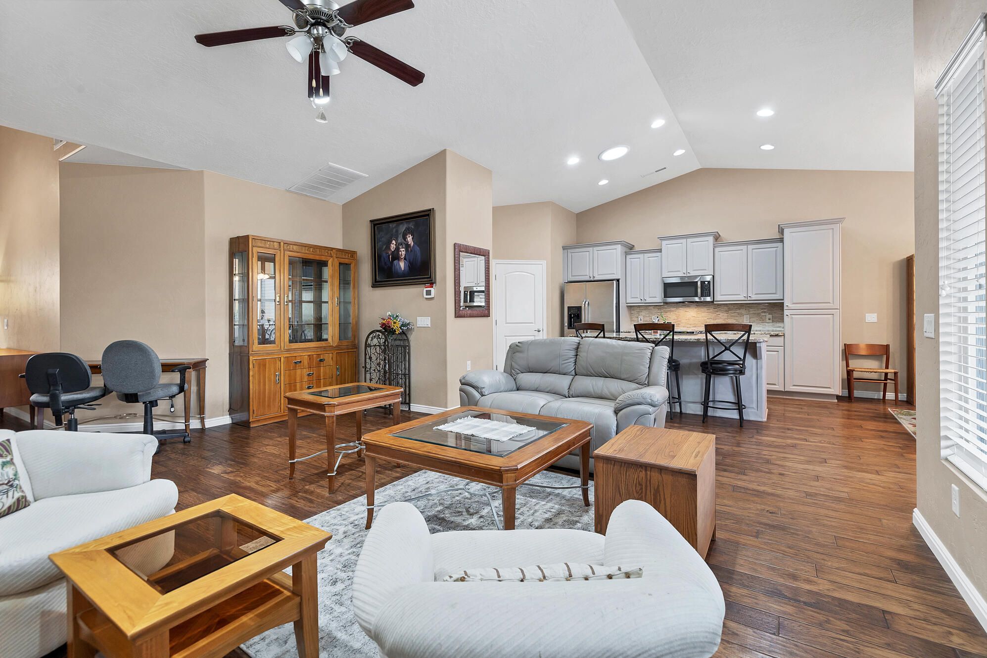 This home has private back yard with mature fruit trees and an oversized garage for all your hobbies. Open floor plan, hardwood floors, upgraded kitchen and 3 full bedrooms make this home ideal for an Active Adult Community. Home sits across from neighborhood park. Call to see if you qualify to purchase this home with FHA flexible payment financing for a $299,900 Investment with no mortgage payments for life.