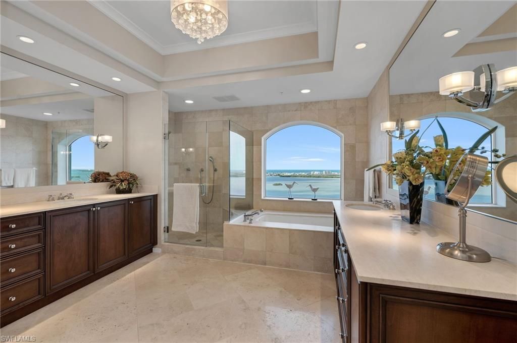 Experience sky-high luxury, masterfully designed to embrace breathtaking views in this sprawling 4,121-square-foot coveted "04" end residence in Horizons at Bonita Bay. From the shimmering waters of Estero Bay and the Gulf of Mexico to the lush nature preserves and championship golf course, every room is a front-row seat to unparalleled beauty. The three open terraces offer views of stunning sunrises and sunsets. Designed for grand entertaining and intimate gatherings, this residence features multiple living and dining areas that blend seamlessly within the open-concept layout. The updated kitchen showcases refaced cabinetry with a fresh, modern finish and brand-new appliances, including a refrigerator, oven/microwave, cooktop, dishwasher, and garbage disposal. The bright and airy primary ensuite bath is a private sanctuary, offering a soaking tub perfectly positioned to overlook the Gulf, a frameless glass shower entry, and finishes that elevate this spa-like retreat. The expansive bedrooms provide serene comfort, brimming with natural light. Designer custom closets offer impeccable organization. New electric hurricane shutters on all sliding glass doors provide security and peace of mind. Essential upgrades include a new water heater and air conditioners (2020/2021). Enhanced lighting, trim, and a Lutron lighting control system set the perfect ambiance, while app-controlled window treatments and sliding door/window tinting ensure privacy and efficiency. Additional enhancements extend to the guest baths and a refreshed laundry room, providing modern convenience throughout. Horizons at Bonita Bay, the Bonita Bay Club, and Bonita Bay Community Association offer an unparalleled lifestyle, with resort-style pools, a state-of-the-art fitness center, private beach access, championship golf, and more. Don’t miss your opportunity to own this masterpiece, view-inspired sanctuary where luxury and panoramic beauty converge.