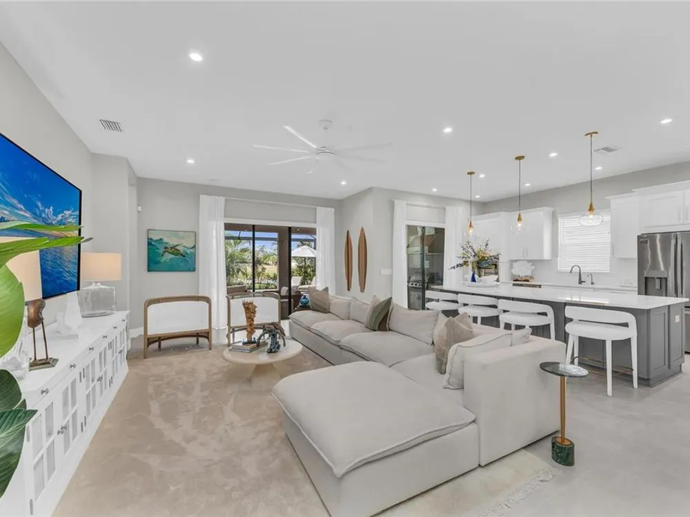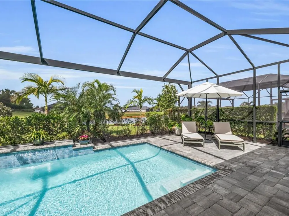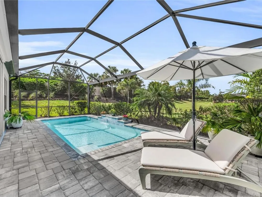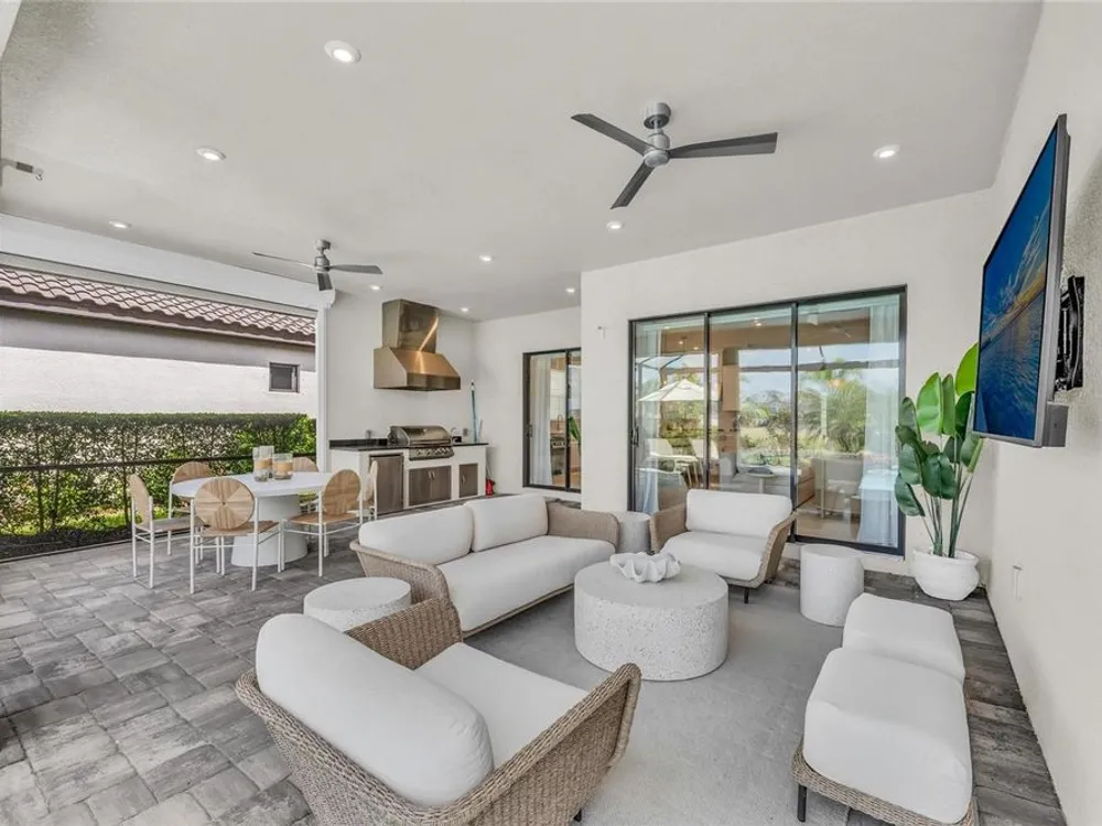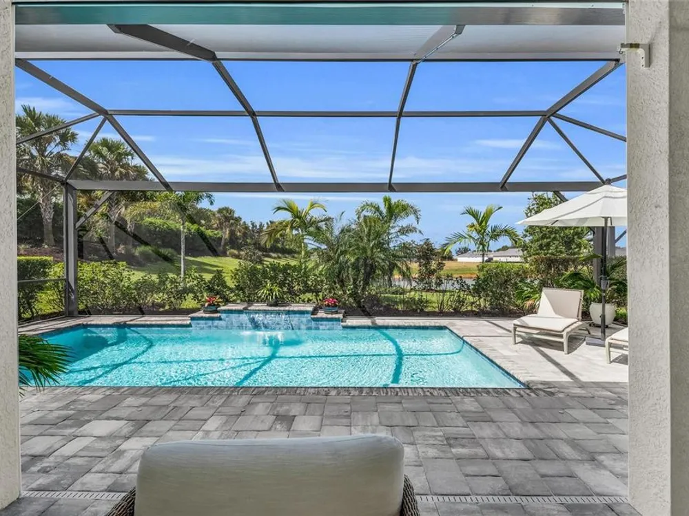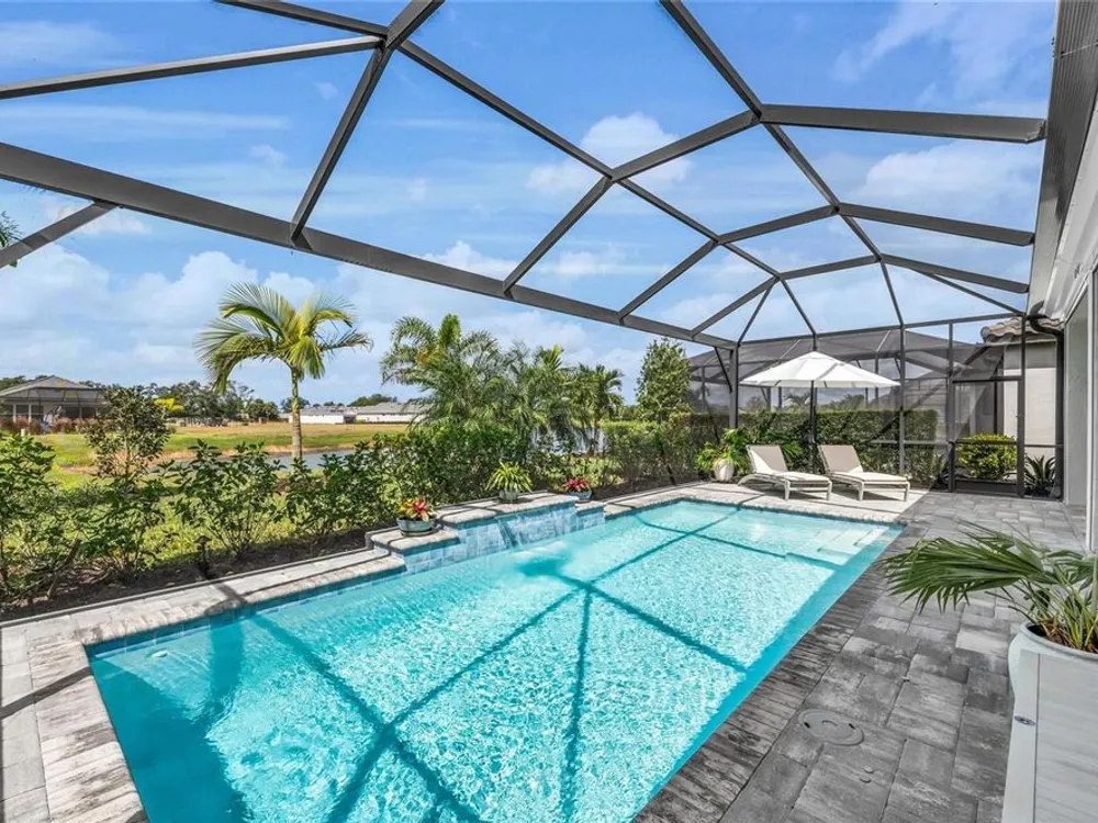 Welcome to your personal piece of paradise in the heart of Esplanade at Azario, one of Lakewood Ranch’s most sought-after communities. This isn’t just a house—it’s where luxury meets lifestyle. Where every day feels like a vacation. Where you wake up to serene lake views and end the day with a glass of wine by your private pool. Tucked on a premium waterfront lot, this beautifully upgraded Lazio floor plan blends Mediterranean charm with fresh coastal style. From the moment you pull up, the home sets the tone: barrel tile roof, tropical landscaping, and a polished curb appeal that tells you—this place is something special. Inside, light pours through every room. A soaring 10-foot ceiling and soft gray palette create a calm, airy vibe, while large-format tile flooring adds elegance underfoot. Step into the open-concept great room and you’re instantly drawn to the view—glimmering water framed by palm trees, seen through oversized sliding glass doors. The kitchen is a showstopper. Think: white shaker cabinetry, rich quartz countertops, and a charcoalgray island made for gathering. GE Profile appliances, a built-in cooktop, wine reserve, and stylish gold pendant lights give the space a sleek, upscale look. And then there’s the backyard oasis—your own private resort. Lounge in the custom-designed pool with water feature, dine alfresco under the covered lanai, and fire up the outdoor kitchen (yes, it’s fully equipped). Lake views stretch beyond the screened enclosure, and with motorized Storm Smart hurricane screens, you’re protected with the push of a button. The owner’s suite is a retreat of its own, with a custom walk-in closet and a spa-like bath featuring frameless glass, brushed nickel finishes, and plenty of space to unwind. Two additional guest bedrooms—each with its own private en-suite bathroom—give everyone room to spread out and relax in comfort. There’s smart tech throughout—Uxari security system, whole-home automation, and a Generac fullhome generator for peace of mind. The home also features upgraded lighting, 8-foot interior doors, designer finishes, and an extended 4-foot garage for extra storage or workspace. And when you're ready to venture out? Esplanade at Azario delivers: resort-style clubhouse, heated pool, fitness center, tennis, pickleball, walking trails, and a packed calendar of social events. You’re also minutes from top-rated schools, the UTC Mall, fine dining, and world-class golf. This is more than a home. It’s where you’ll gather with friends, celebrate milestones, and soak in every sunset. Come see it in person—and feel what makes this place so special. Schedule your private showing today.