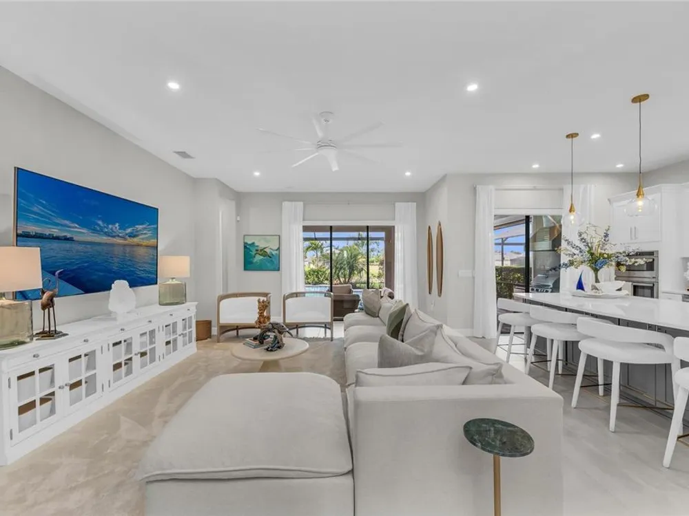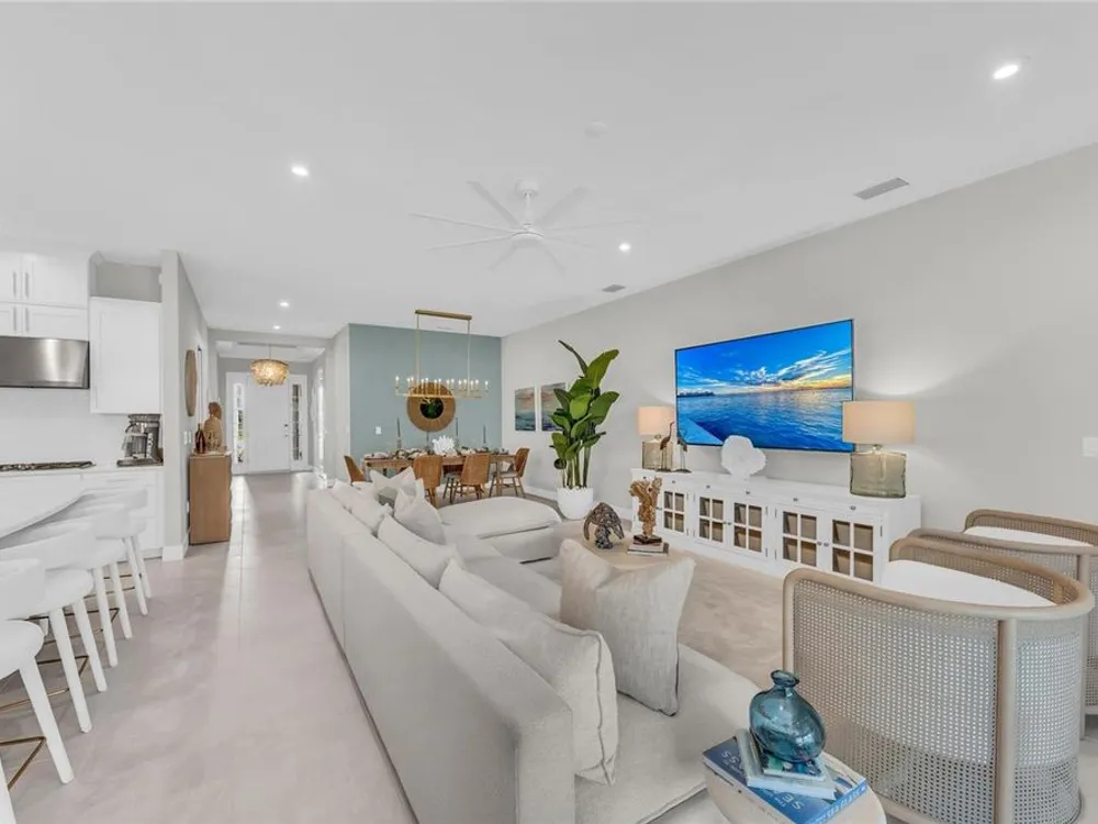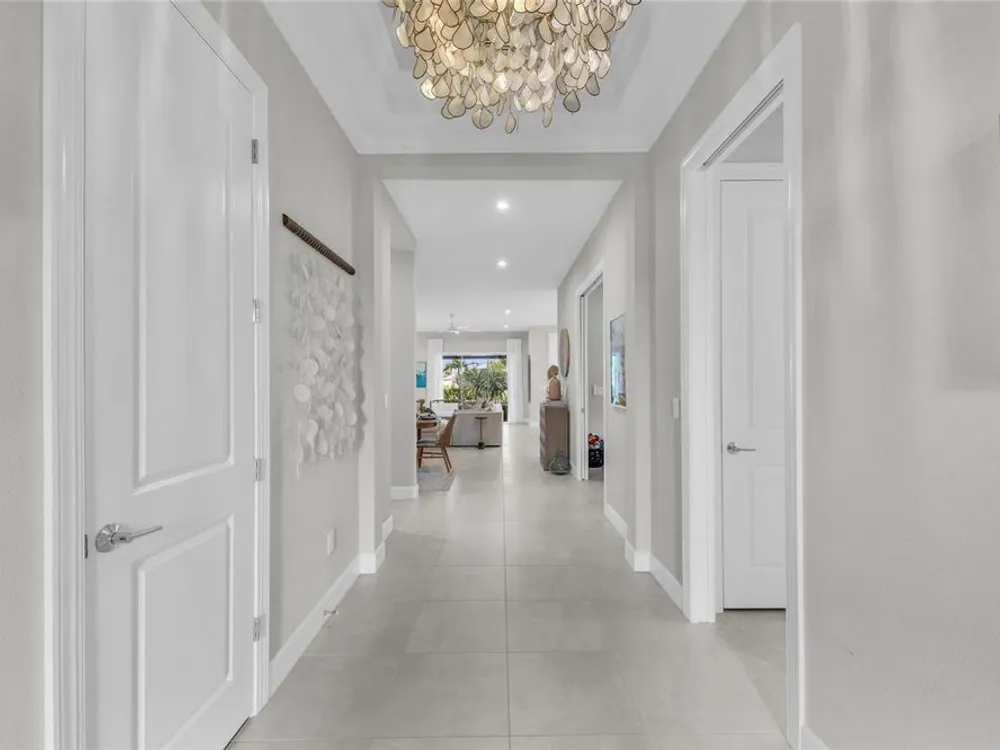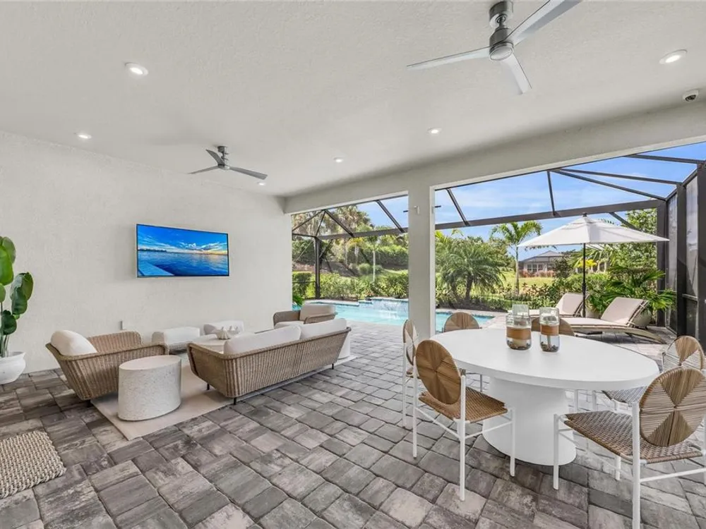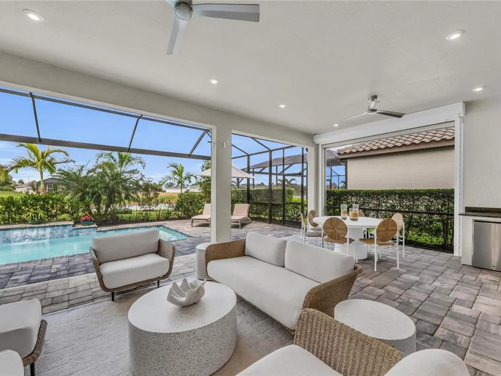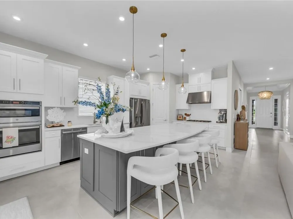 Welcome to your personal piece of paradise in the heart of Esplanade at Azario, one of Lakewood Ranch’s most sought-after communities. This isn’t just a house—it’s where luxury meets lifestyle. Where every day feels like a vacation. Where you wake up to serene lake views and end the day with a glass of wine by your private pool. Tucked on a premium waterfront lot, this beautifully upgraded Lazio floor plan blends Mediterranean charm with fresh coastal style. From the moment you pull up, the home sets the tone: barrel tile roof, tropical landscaping, and a polished curb appeal that tells you—this place is something special. Inside, light pours through every room. A soaring 10-foot ceiling and soft gray palette create a calm, airy vibe, while large-format tile flooring adds elegance underfoot. Step into the open-concept great room and you’re instantly drawn to the view—glimmering water framed by palm trees, seen through oversized sliding glass doors. The kitchen is a showstopper. Think: white shaker cabinetry, rich quartz countertops, and a charcoalgray island made for gathering. GE Profile appliances, a built-in cooktop, wine reserve, and stylish gold pendant lights give the space a sleek, upscale look. And then there’s the backyard oasis—your own private resort. Lounge in the custom-designed pool with water feature, dine alfresco under the covered lanai, and fire up the outdoor kitchen (yes, it’s fully equipped). Lake views stretch beyond the screened enclosure, and with motorized Storm Smart hurricane screens, you’re protected with the push of a button. The owner’s suite is a retreat of its own, with a custom walk-in closet and a spa-like bath featuring frameless glass, brushed nickel finishes, and plenty of space to unwind. Two additional guest bedrooms—each with its own private en-suite bathroom—give everyone room to spread out and relax in comfort. There’s smart tech throughout—Uxari security system, whole-home automation, and a Generac fullhome generator for peace of mind. The home also features upgraded lighting, 8-foot interior doors, designer finishes, and an extended 4-foot garage for extra storage or workspace. And when you're ready to venture out? Esplanade at Azario delivers: resort-style clubhouse, heated pool, fitness center, tennis, pickleball, walking trails, and a packed calendar of social events. You’re also minutes from top-rated schools, the UTC Mall, fine dining, and world-class golf. This is more than a home. It’s where you’ll gather with friends, celebrate milestones, and soak in every sunset. Come see it in person—and feel what makes this place so special. Schedule your private showing today.