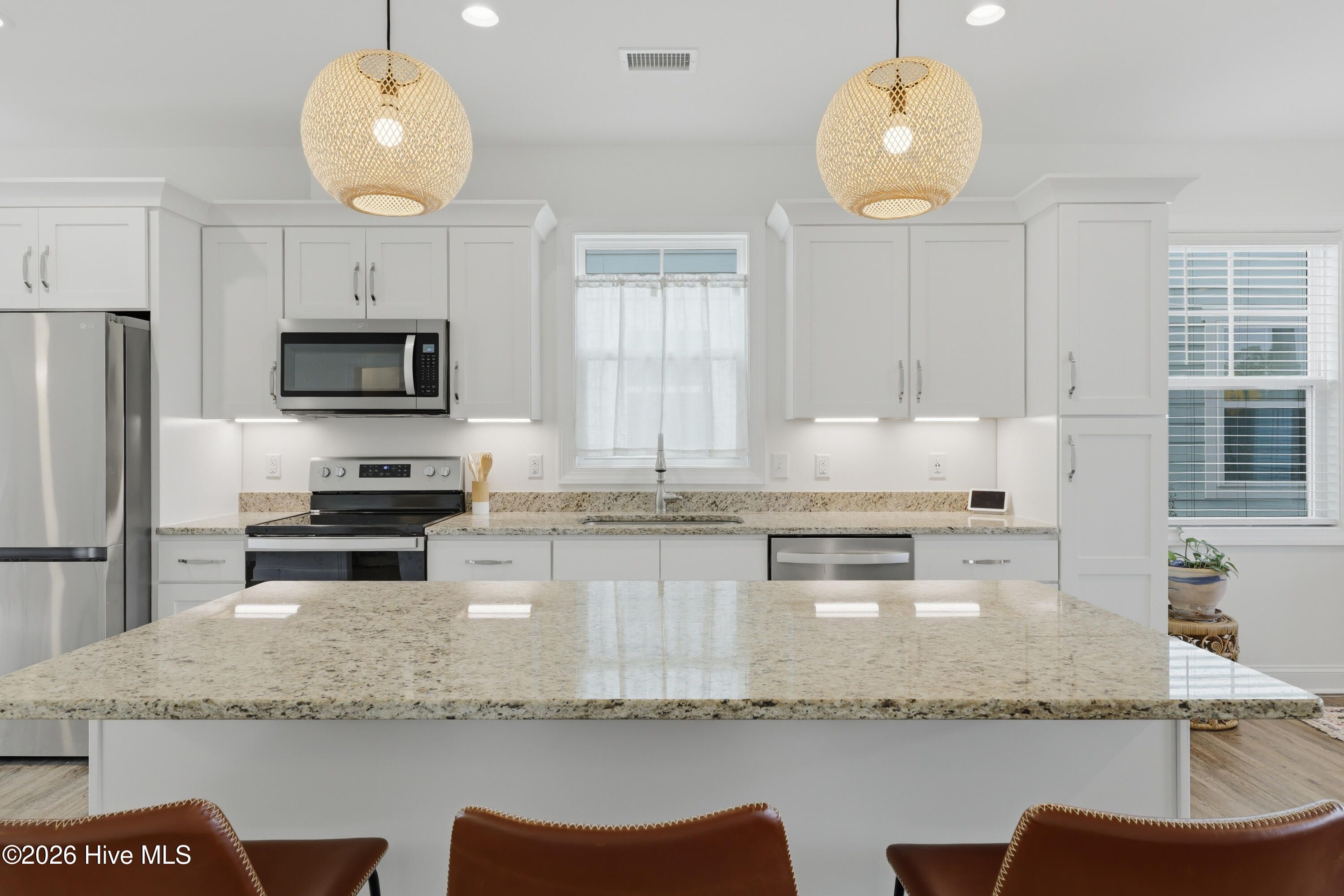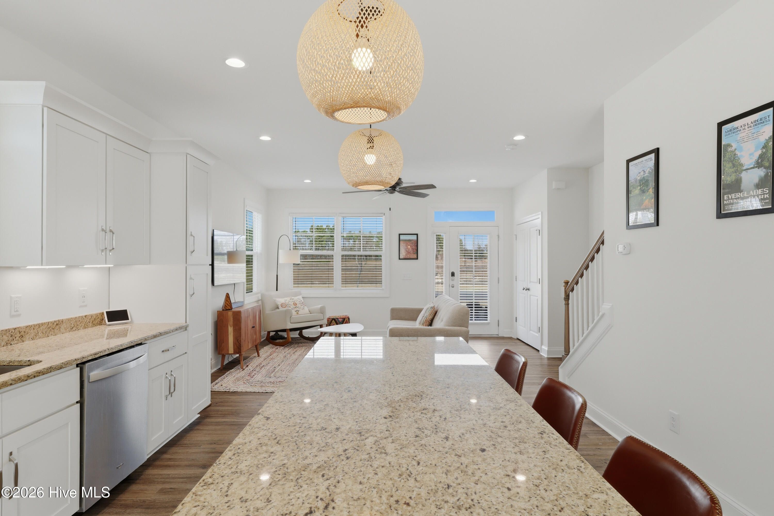 - Walk-In Closet(s), Vaulted Ceiling(s), High Ceilings, Solid Surface Counters, Kitchen Island, Ceiling Fan(s), Walk-In Shower, Blinds, Eat-in Kitchen